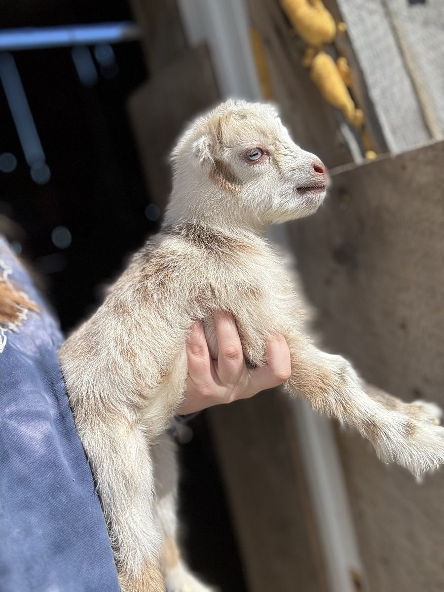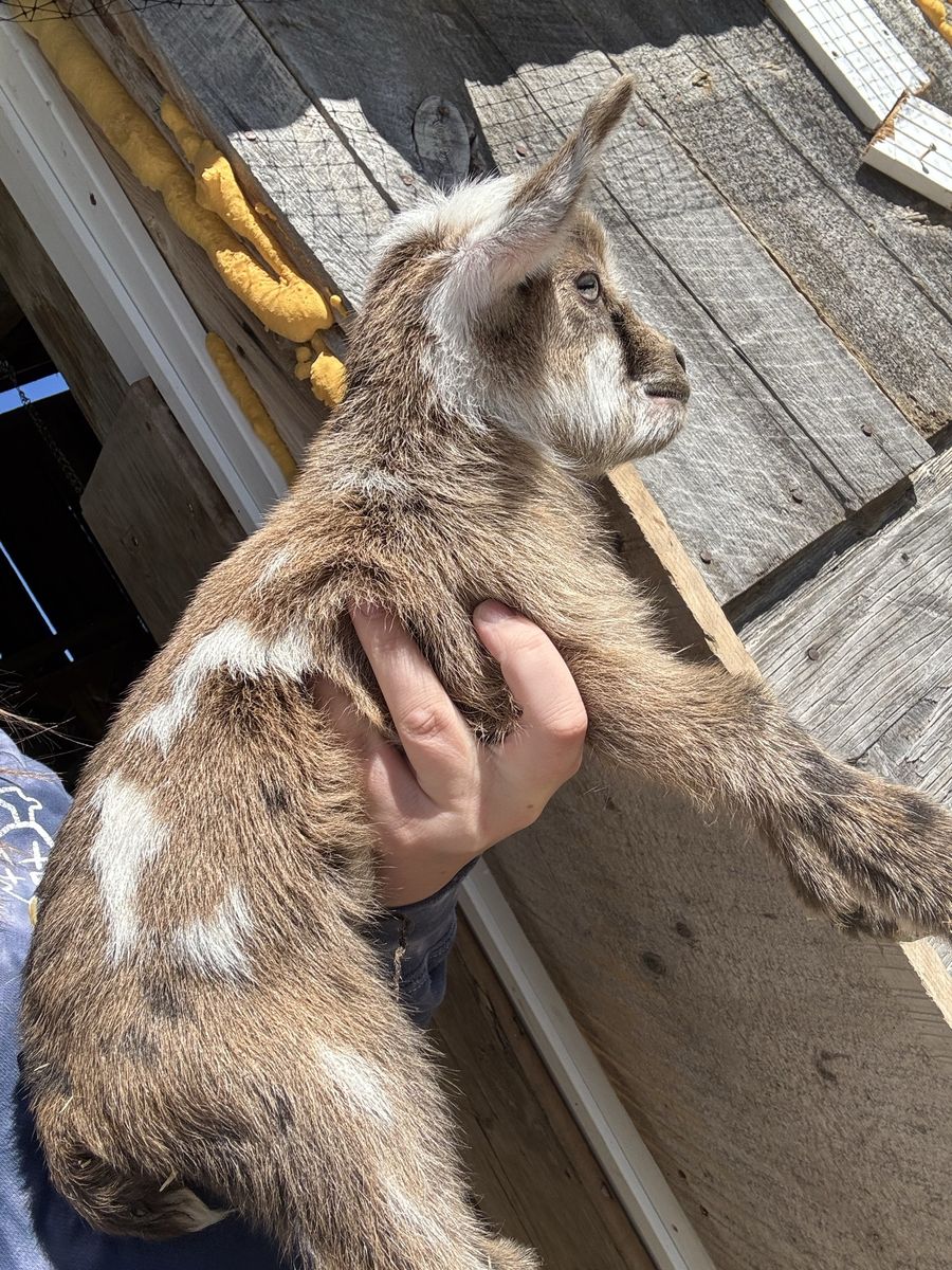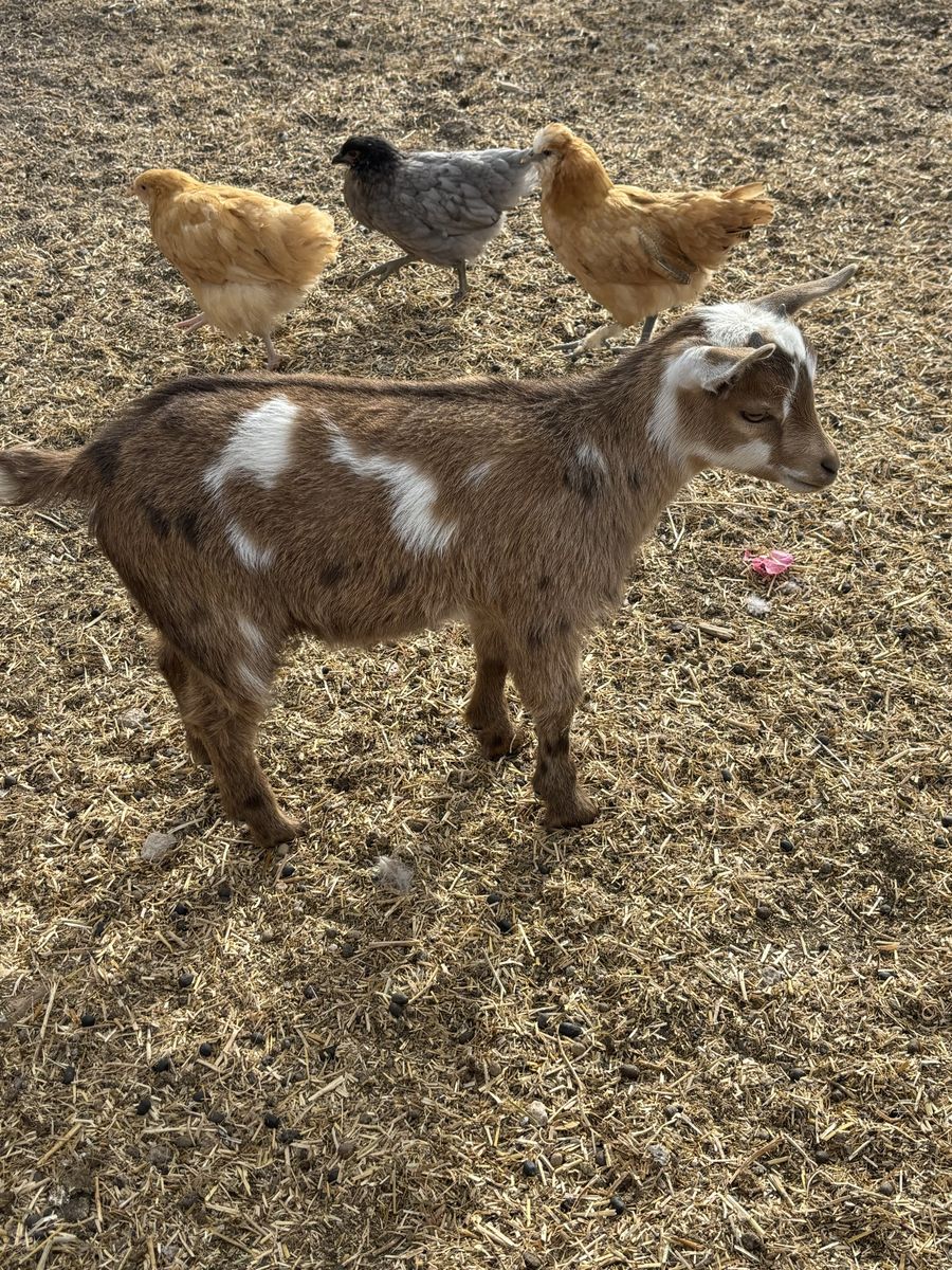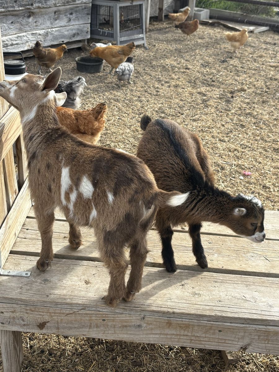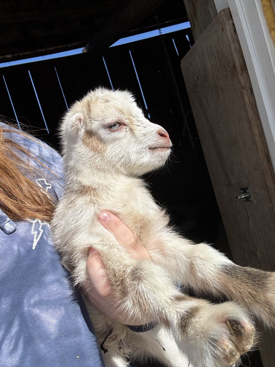 VenmoNigerian Dwarf/ Lamancha Dark Brown no ears- Doeling $100 Light brown ears- Doeling $100 White and Tan no ears- Buck $80 Or buy all three for $250 These cute babies are triplets, they are all super friendly and sweet, handled daily! I bottle fed the buckling. They are used to kids, dogs, and chickens. Momma is a Lamancha and dad is a Nigerian Dwarf. Momma is super well tempered with people and other animals and goats. They will be ready for a new and loving home April 28th! Born on March 3rd 2026
