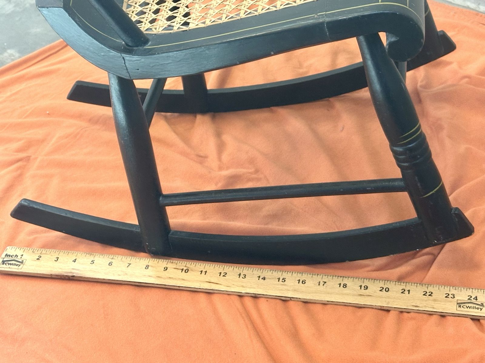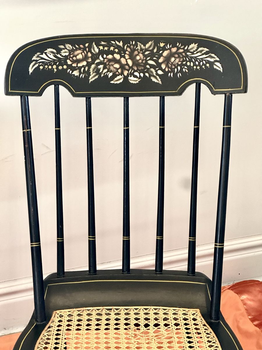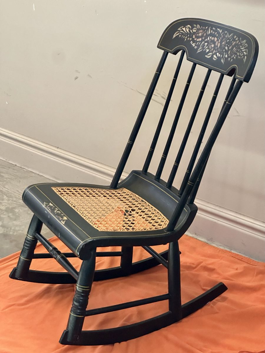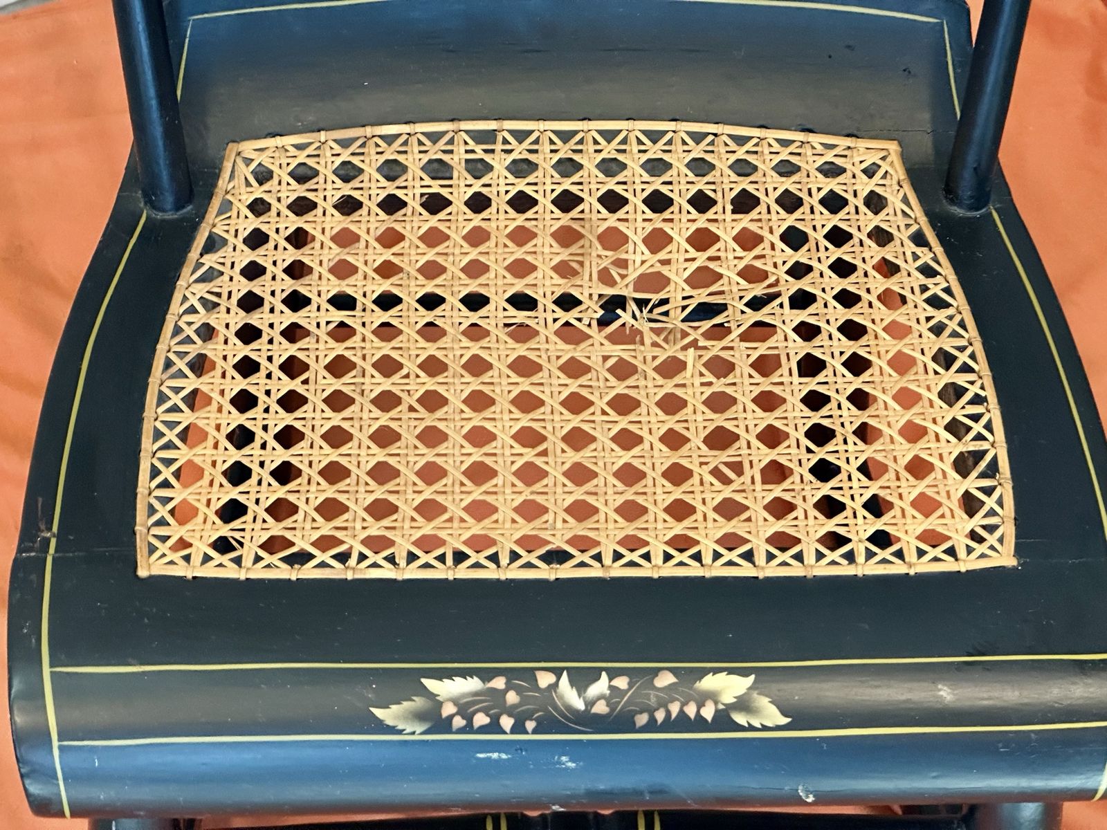 Beautiful spindles very sturdy small rocking chair! The rattan on the seat of the chair has a small spot where rattan is broke beautiful stenciling on chair
