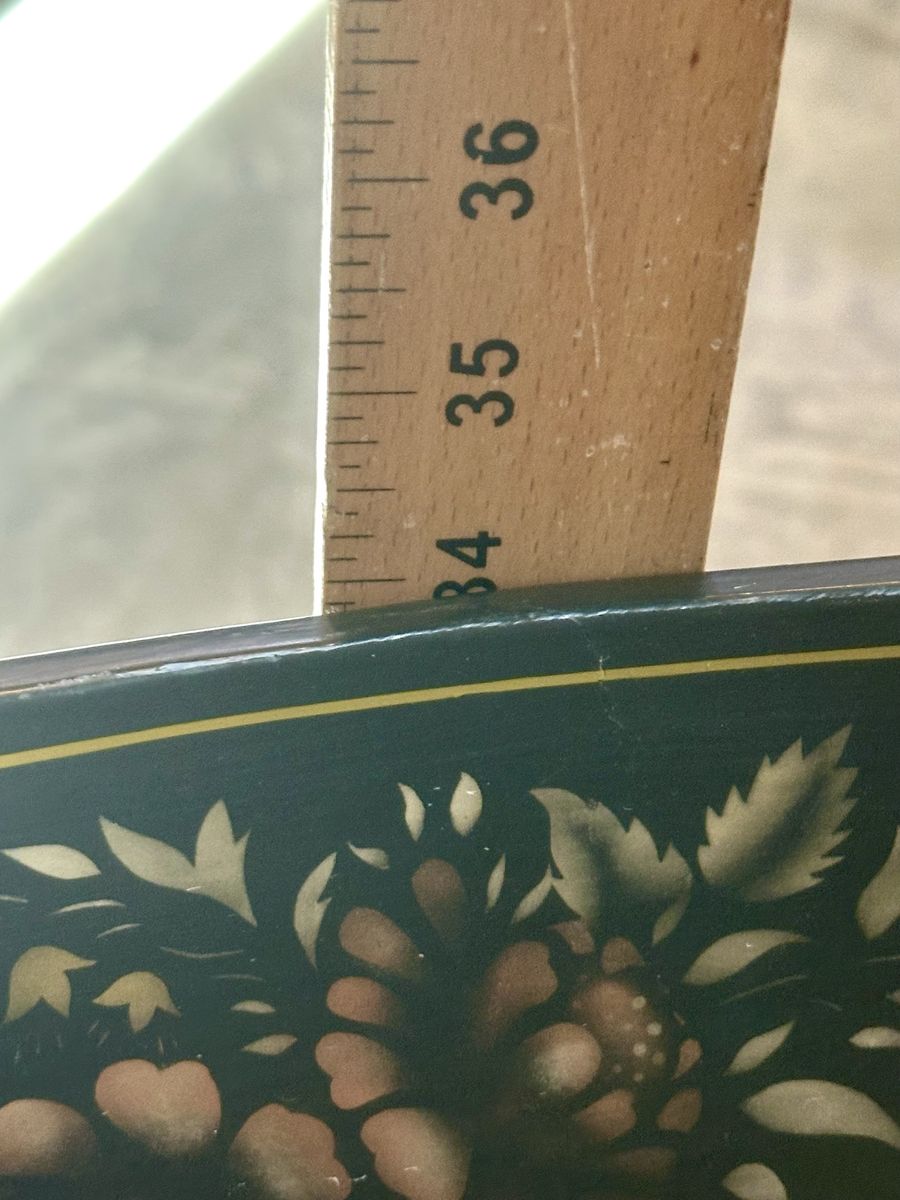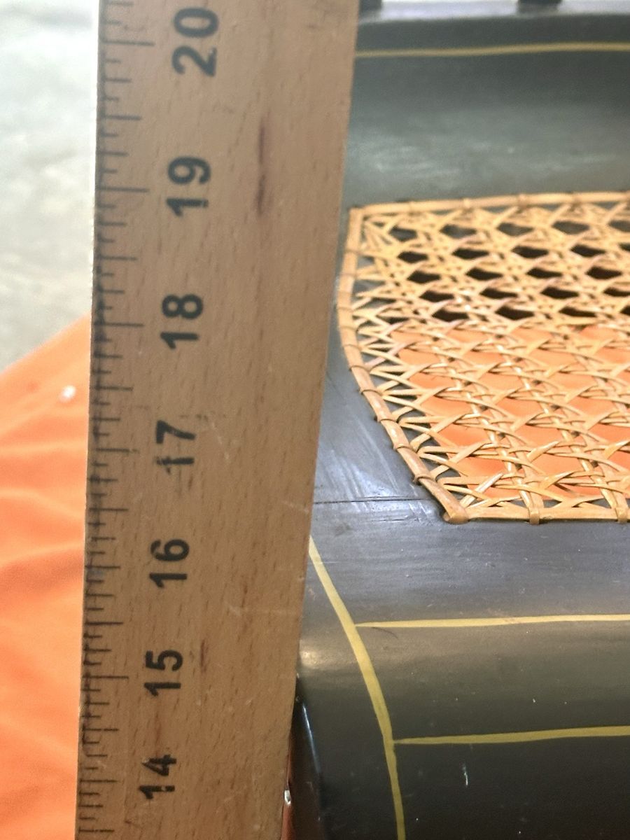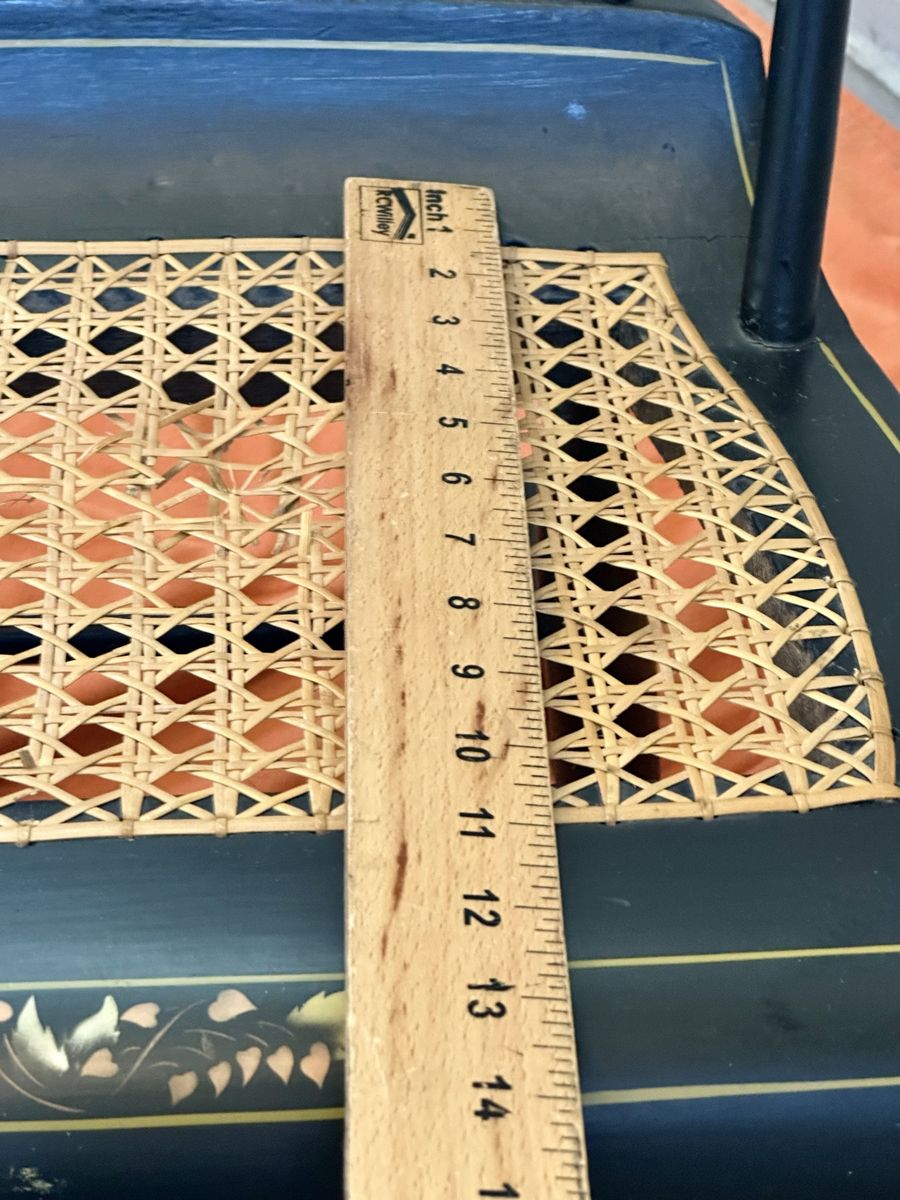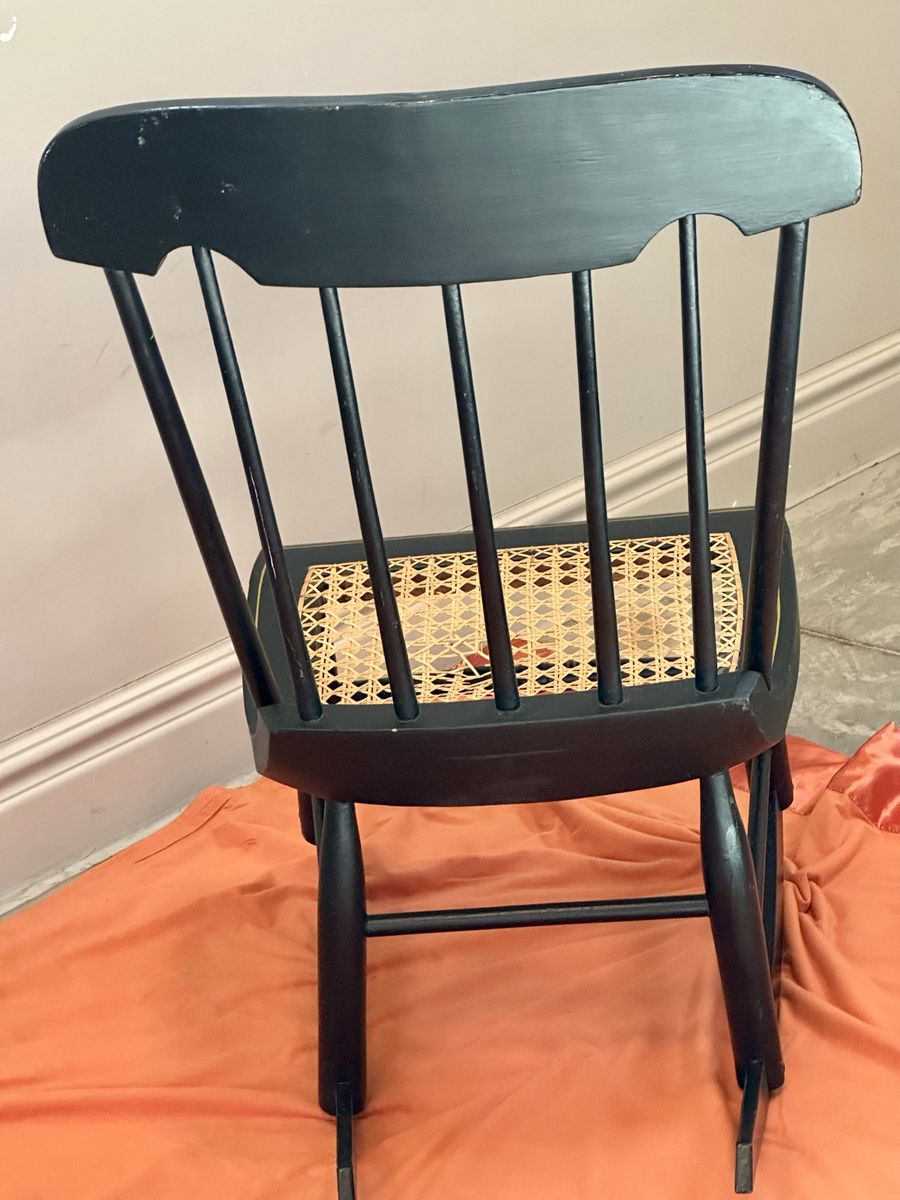 Beautiful spindles very sturdy small rocking chair! The rattan on the seat of the chair has a small spot where rattan is broke beautiful stenciling on chair