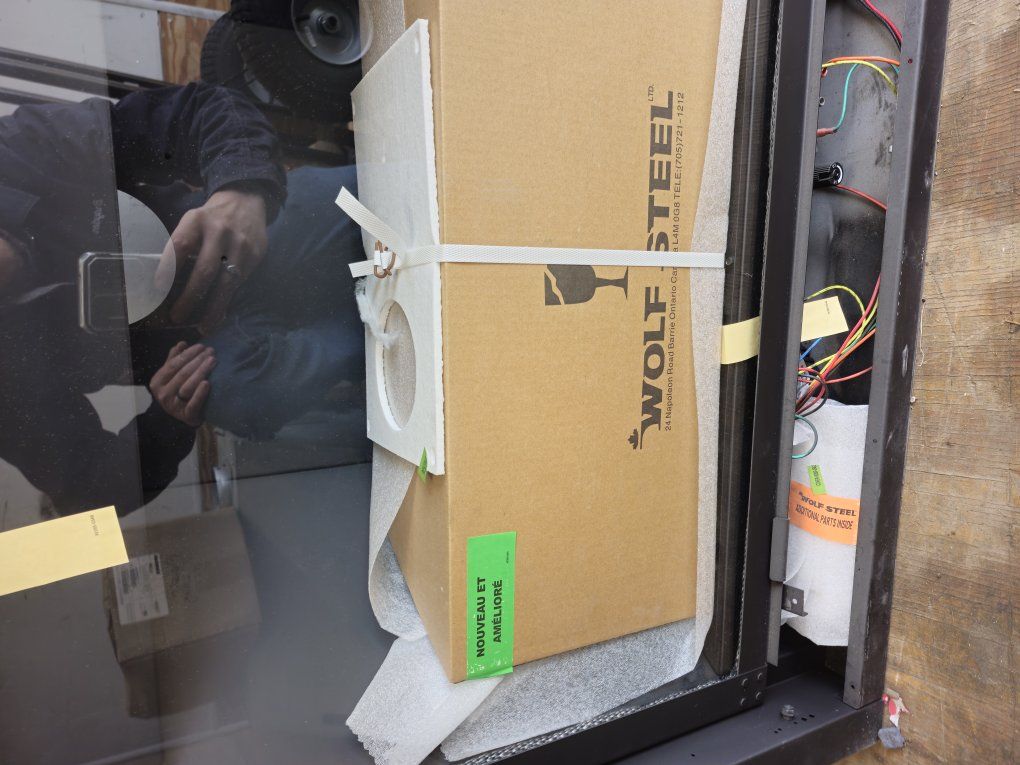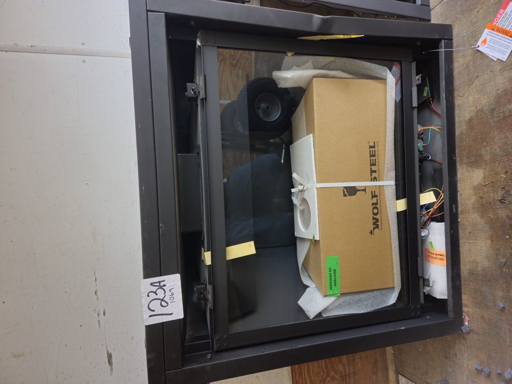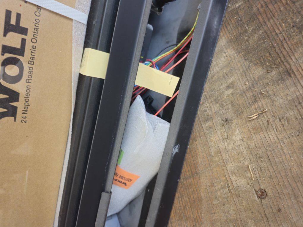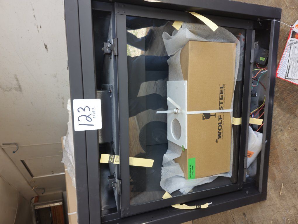 New but damaged on the outside metal, when you install these the metal is covered and you wouldn't see the damage, these sell online for $3000 so you would save a ton. Here is a link to one within everything you need to know, I have two of these both ate in the pictures. https://www.homelectrical.com/gas-fireplace/napoleon-nap-b36ntre1.1.html?hl=en-US