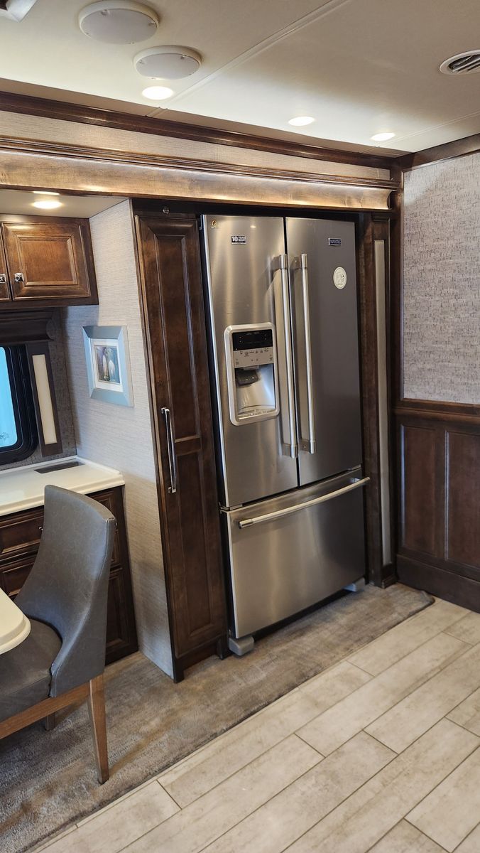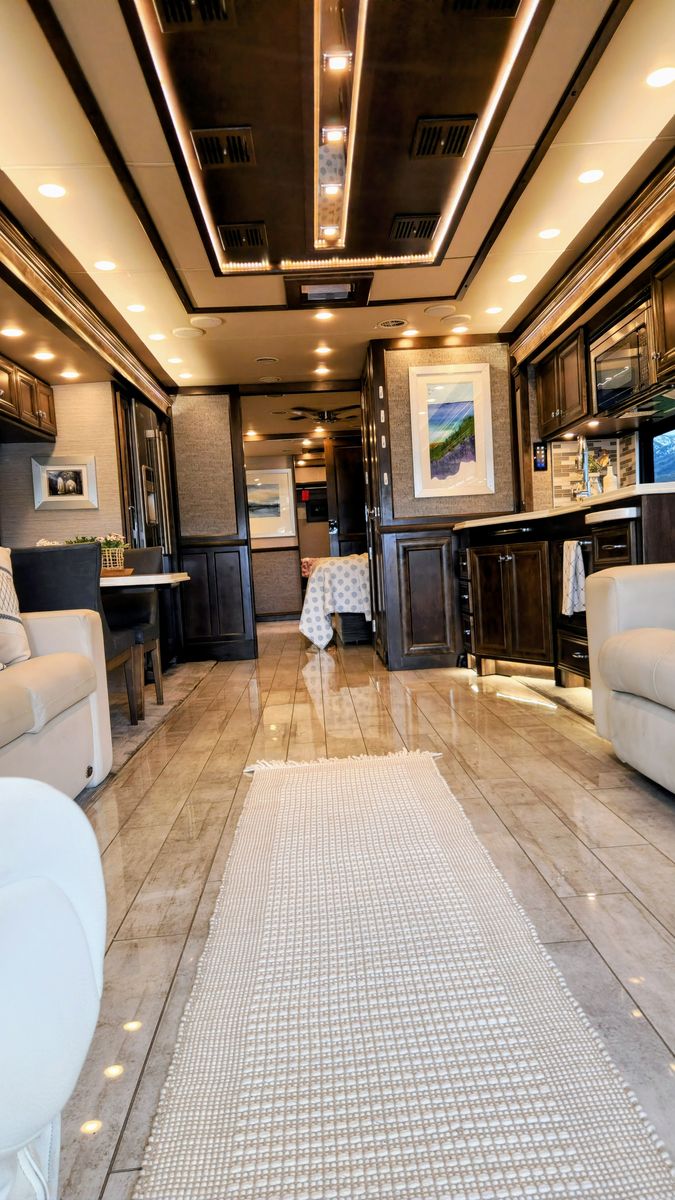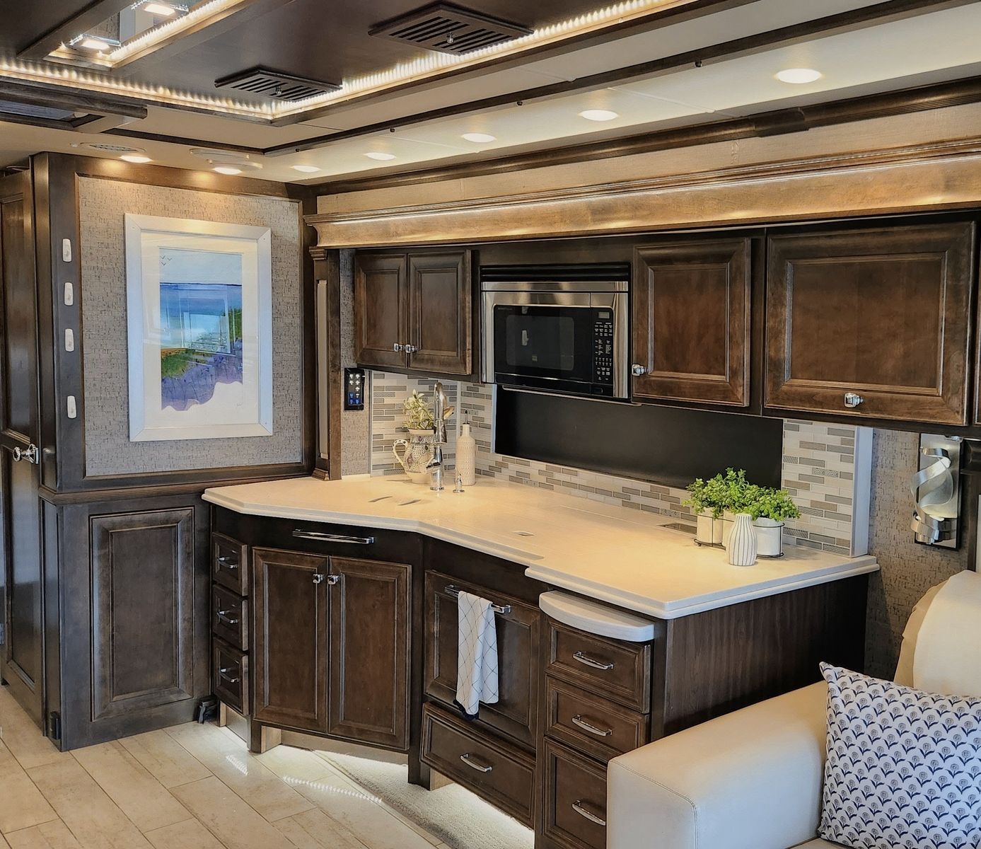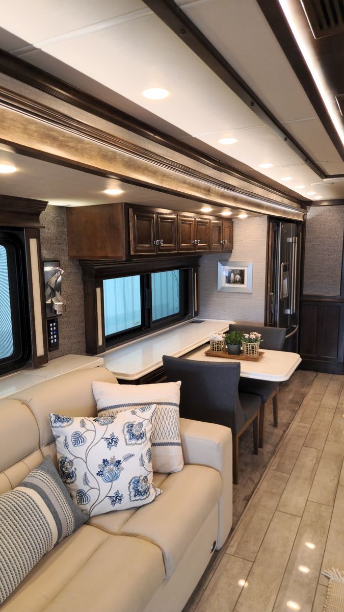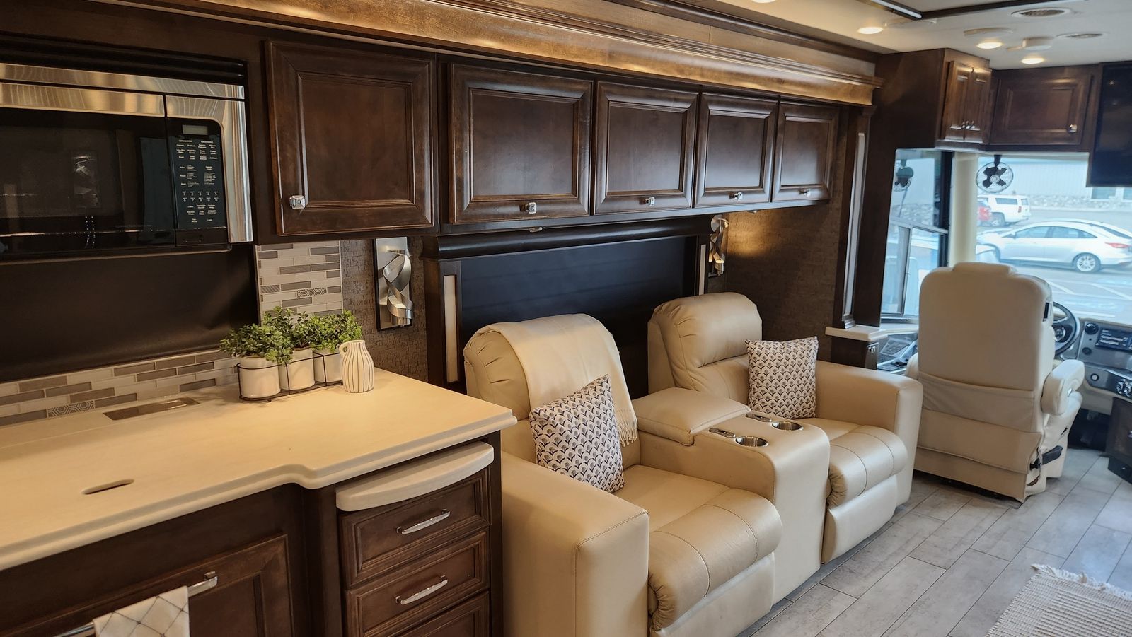 Inside, the 2020 Phaeton is designed for maximum comfort and elegance, featuring handcrafted wood cabinetry, polished solid surface countertops, and porcelain tile floors. The galley is fully appointed with stainless steel residential appliances, including a French door refrigerator, a convection microwave, and an optional drawer-type dishwasher. Living areas are equipped with theater seating or Ultra-leather sofas, surround sound systems, multiple TVs, and a "Lift TV" console, while the bedroom offers a memory foam queen or king-sized bed, generous wardrobe storage, and optional stacked washer/dryer units.