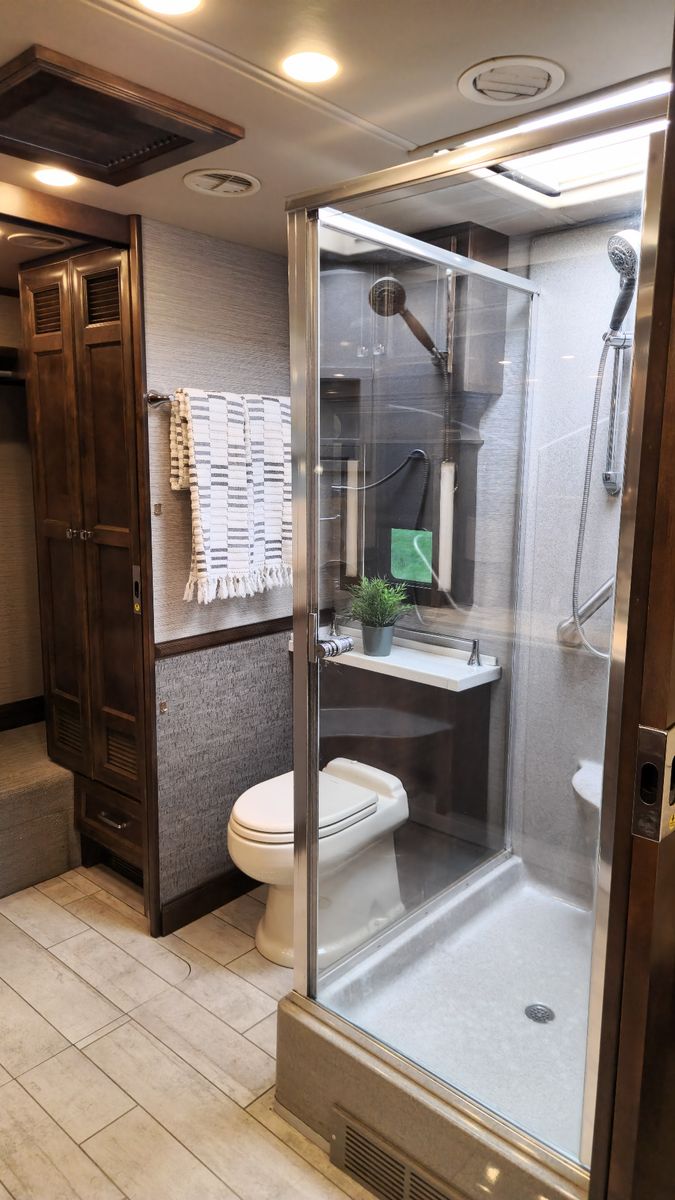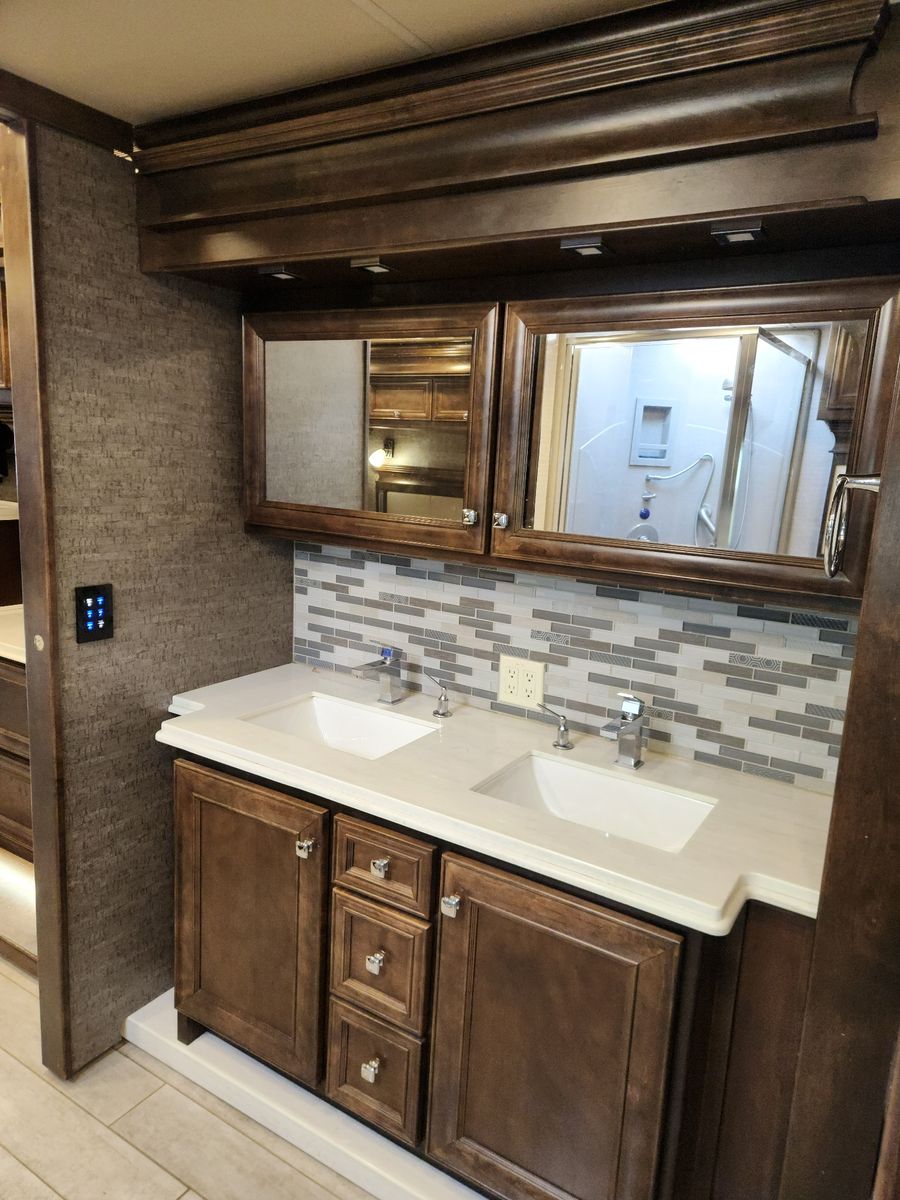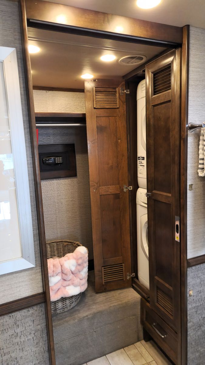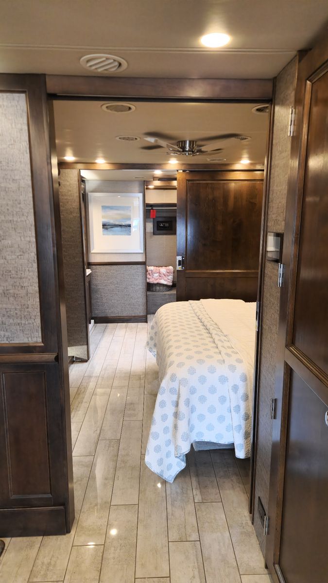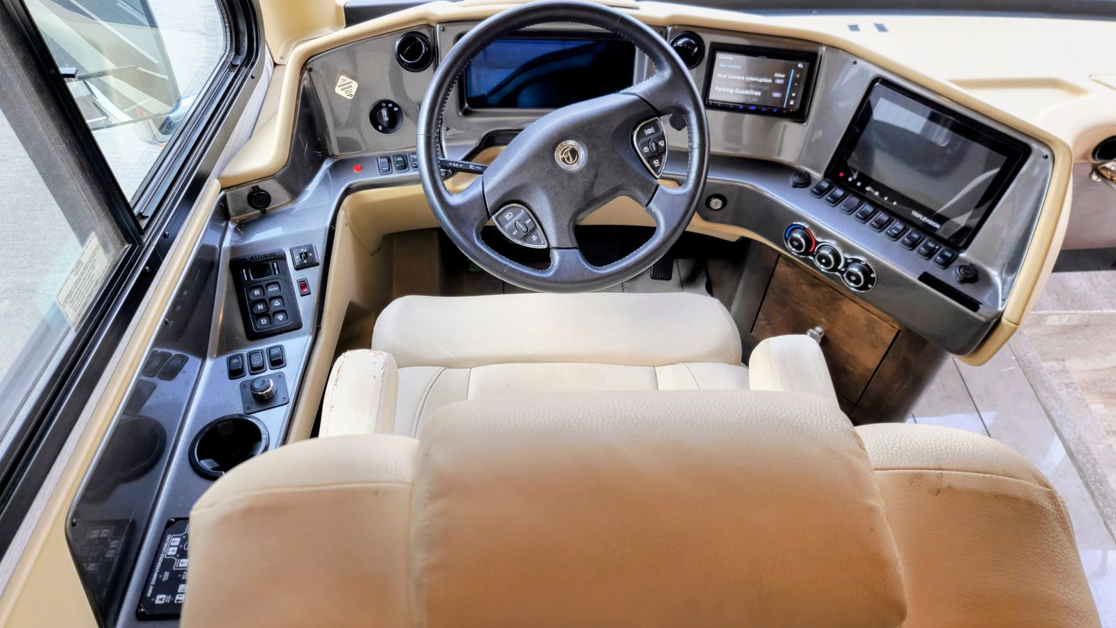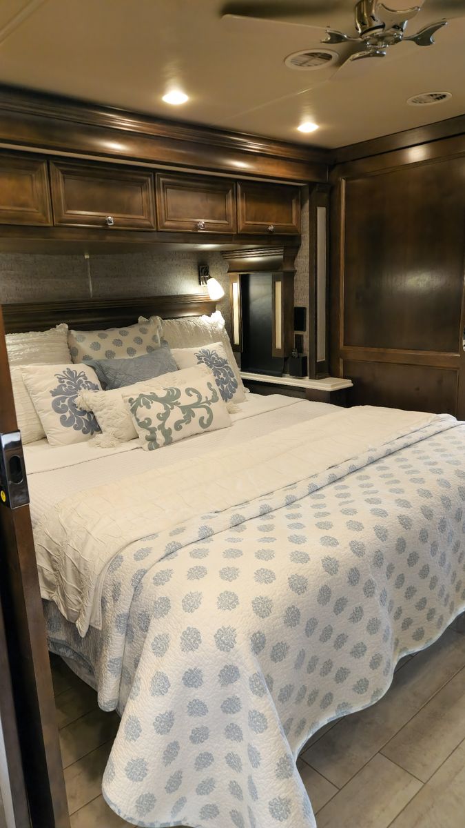 Inside, the 2020 Phaeton is designed for maximum comfort and elegance, featuring handcrafted wood cabinetry, polished solid surface countertops, and porcelain tile floors. The galley is fully appointed with stainless steel residential appliances, including a French door refrigerator, a convection microwave, and an optional drawer-type dishwasher. Living areas are equipped with theater seating or Ultra-leather sofas, surround sound systems, multiple TVs, and a "Lift TV" console, while the bedroom offers a memory foam queen or king-sized bed, generous wardrobe storage, and optional stacked washer/dryer units.