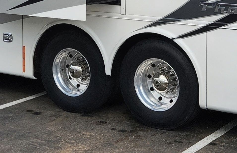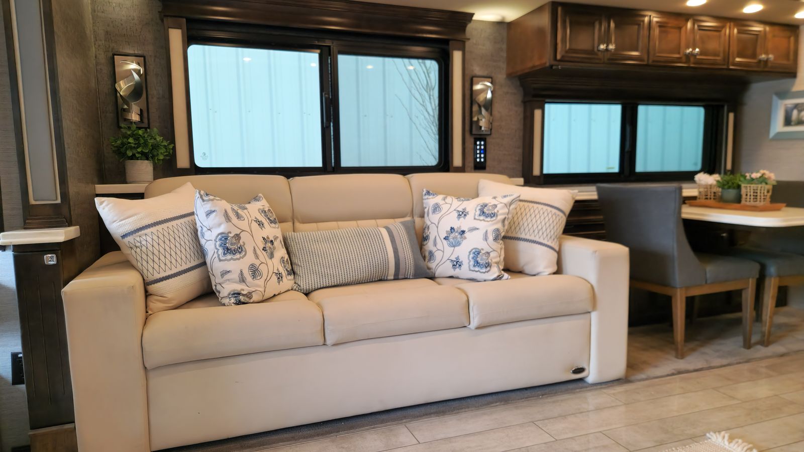Exterior features on a top-tier 2020 Phaeton include an 8-step, full-body paint system with three layers of clear coat and protective scratch-resistant film on the front cap. Further enhancing the exterior are Girard power patio and window awnings, LED lighting, and large basement storage compartments, some featuring pass-through slide-out trays. To facilitate year-round travel, it incorporates three high-efficiency 15k BTU air conditioners with heat pumps and a substantial 100-gallon fresh water tank.