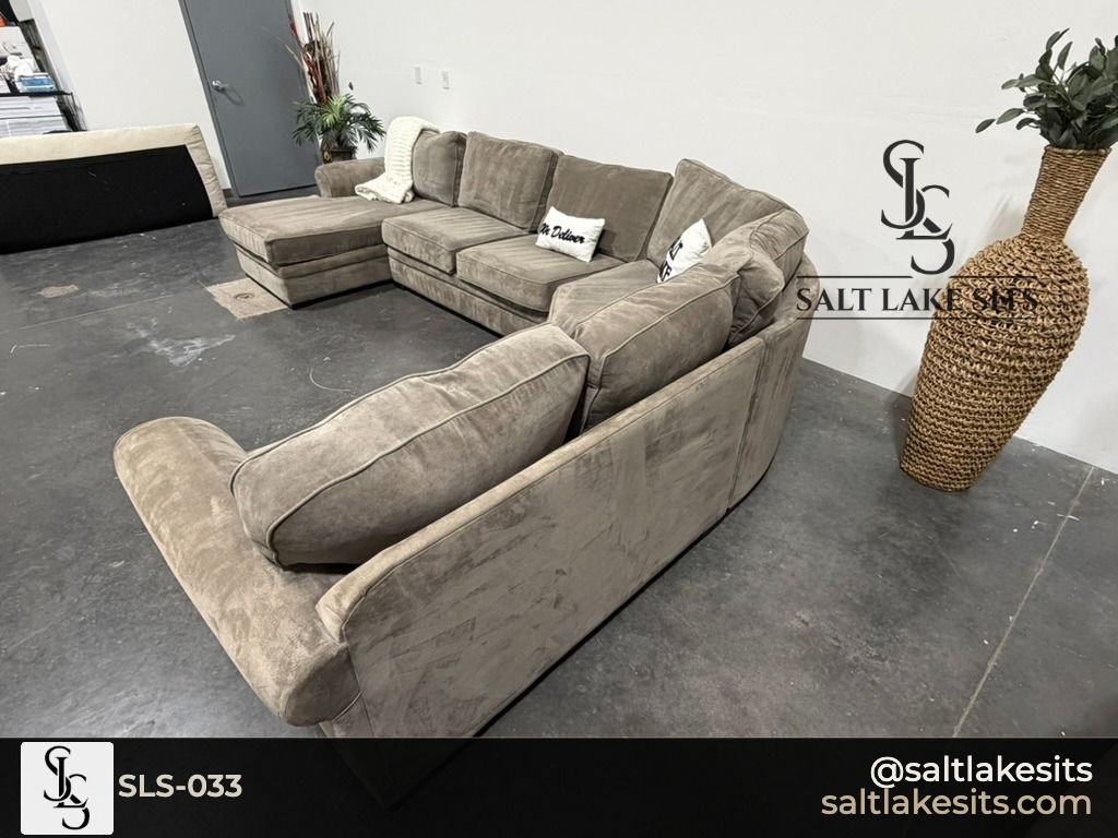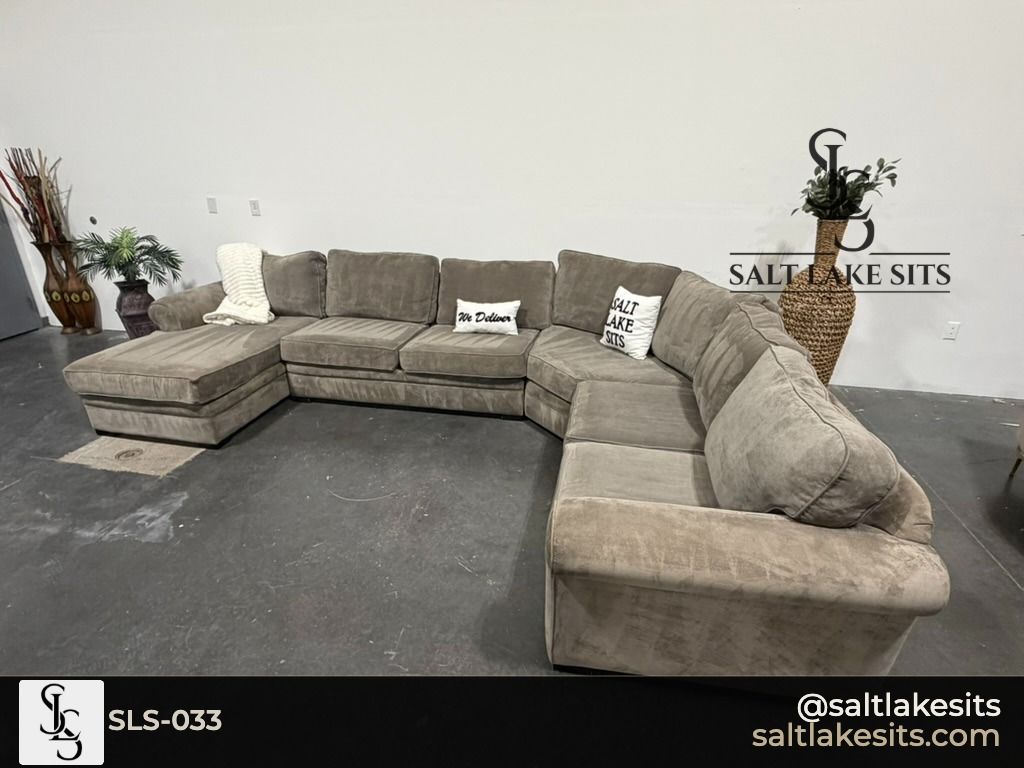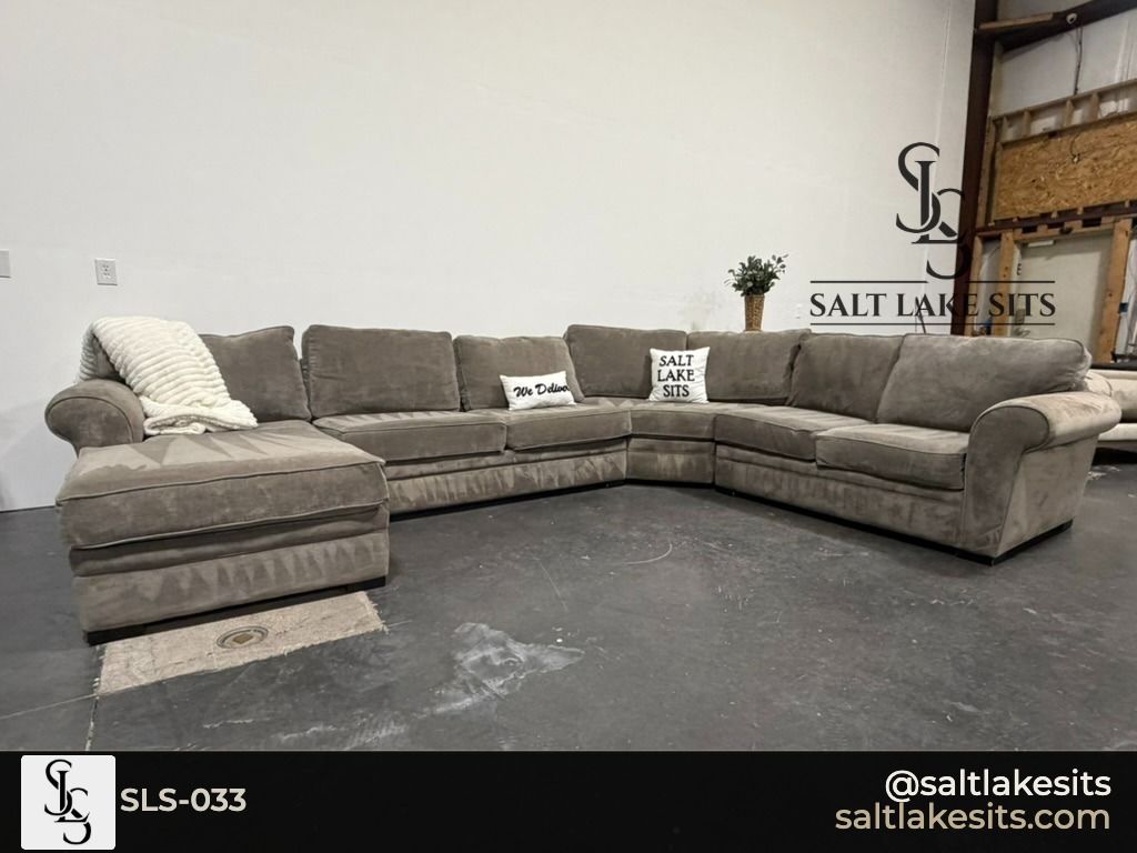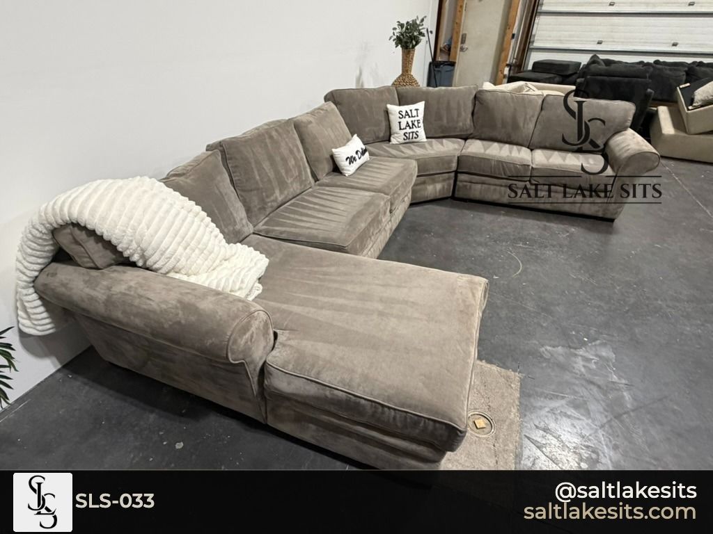 Large Taupe Chaise Sectional — Massive, oversized sectional with rolled arms and a generous left facing chaise. Warm taupe/mocha microfiber that works with any decor. Good condition, professionally cleaned. Dimensions in photos.
