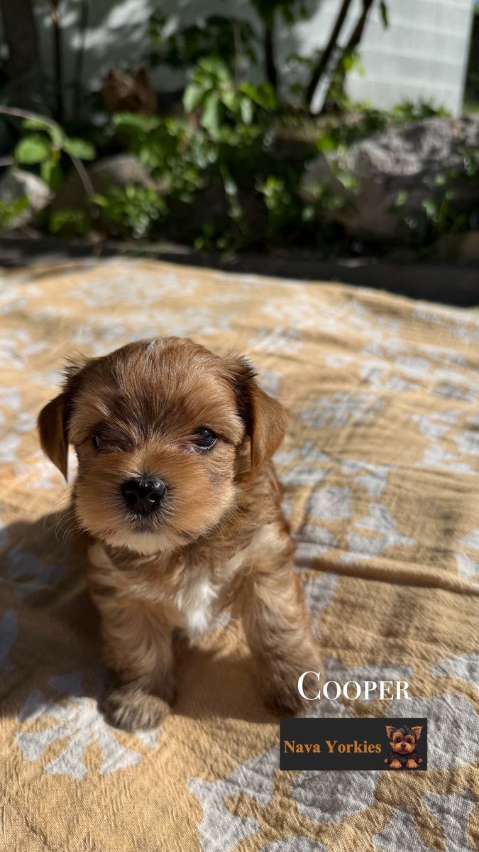 Mom, Ponyo, is our gorgeous blonde AKC Yorkie (5.5 lbs), and dad, Diggity, is a tiny 3.2 lb traditional AKC male. These pups are expected to stay small (around 3–5 lbs full grown).