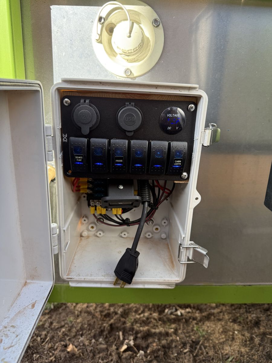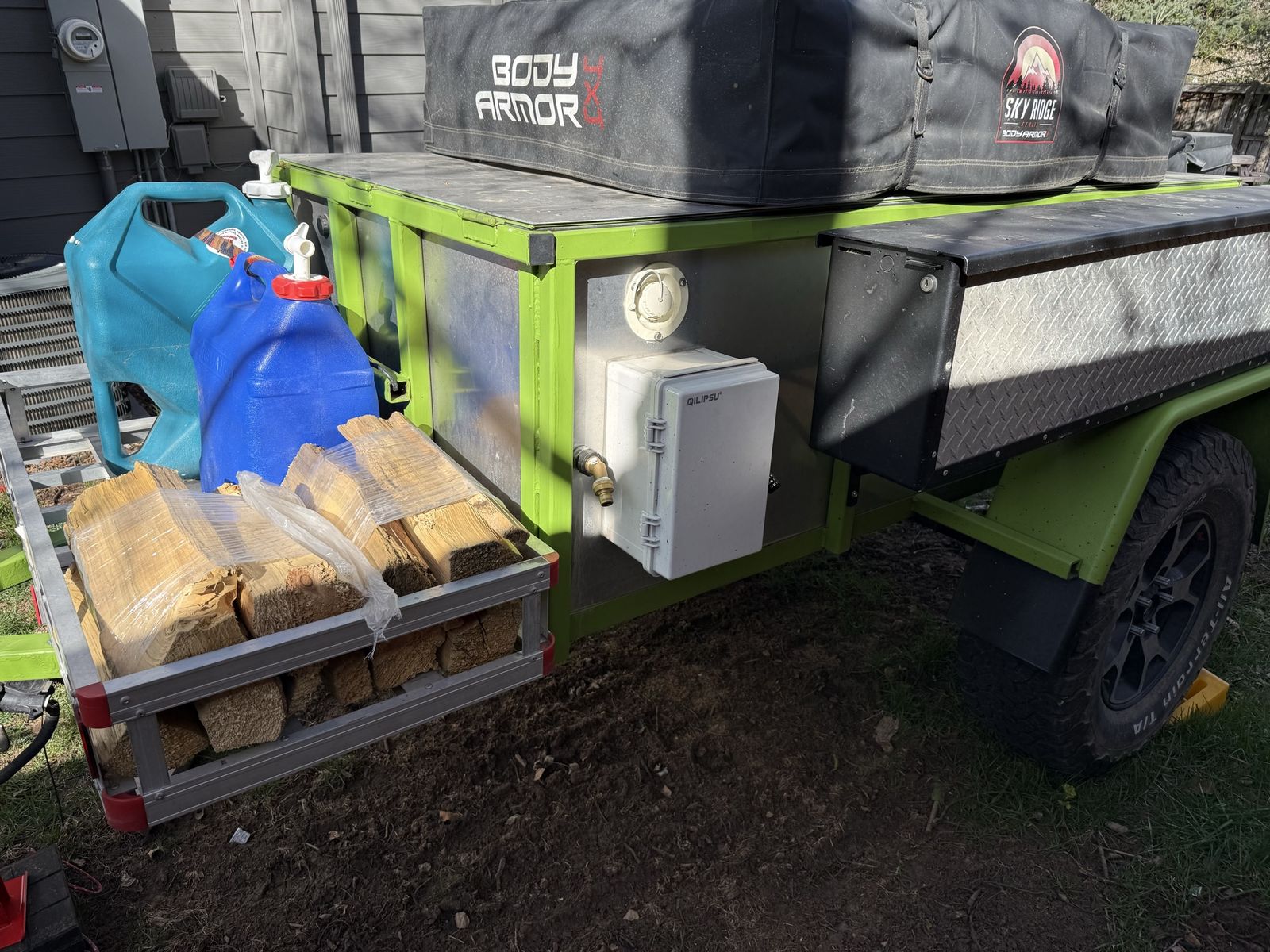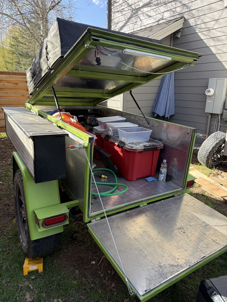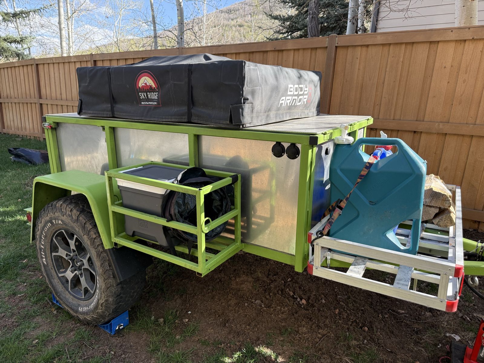 Custom overlanding trailer fully built out with 200ah Lithium Ion battery, 3000w inverter, solar and shore power charge controllers, onboard water pump, Body Armor 4x4 rooftop tent, dry storage box, cargo rack, hydraulic lift main storage area, jeep wheels mounted with 285/70r17 BF Goodrich Baja Champion KO2s (with full size spare), leaf suspension