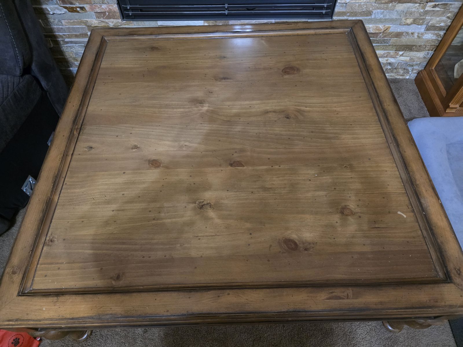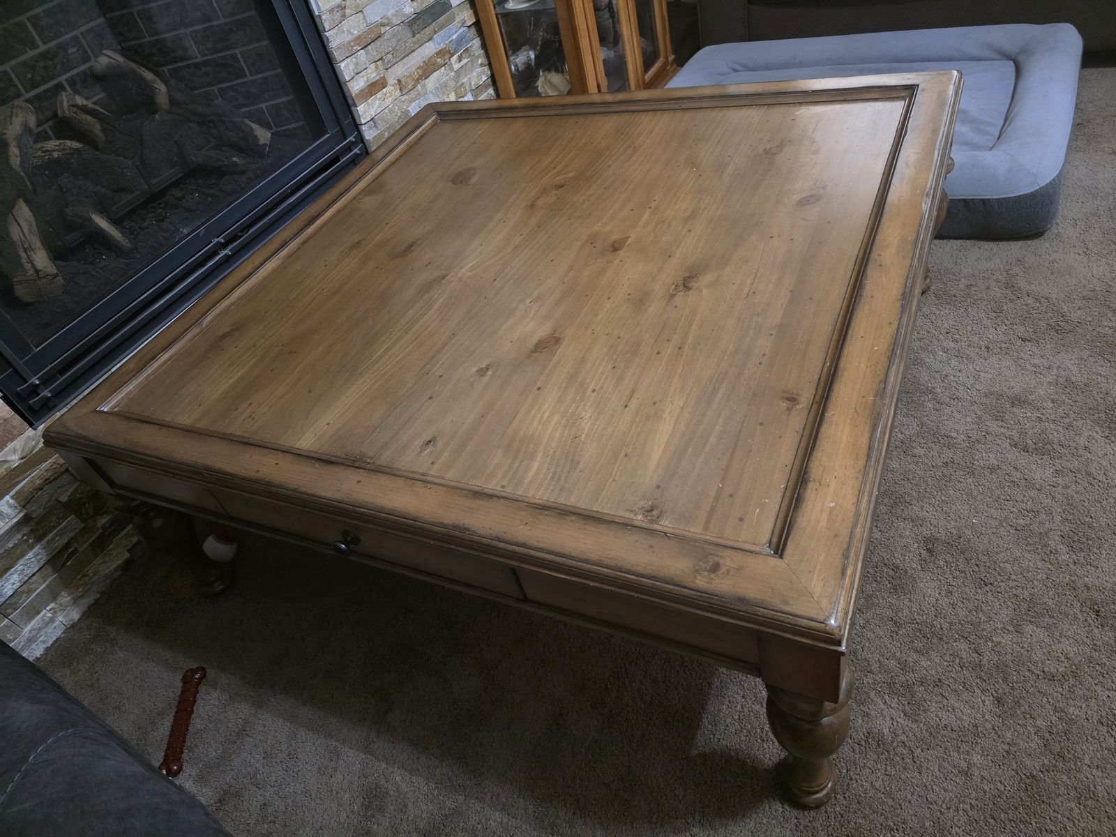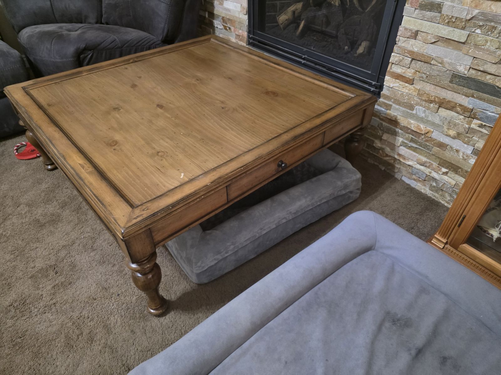 Making room in my house. Selling the coffee table for 100.00. Size is 47.5 in by 47.5 and 6 1/2 in tall. Has two drawers. used and in good shape. Please let me know if you have any questions. ( 3 feet 11.5 inches by 3 feet 11.5 inches square).