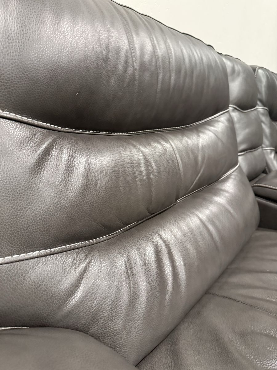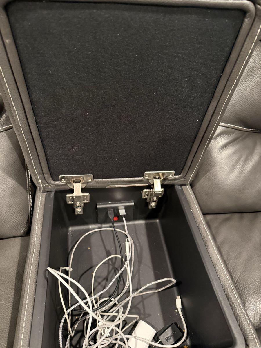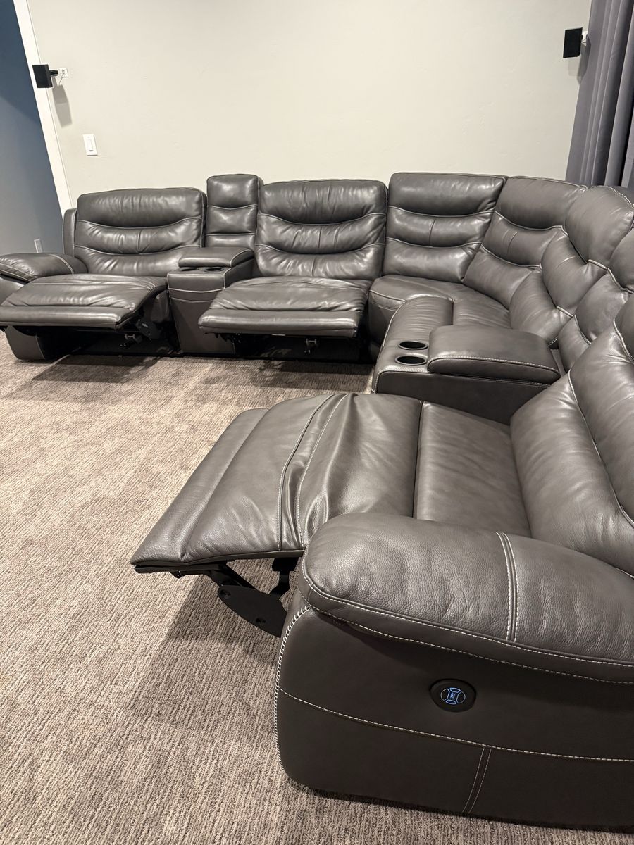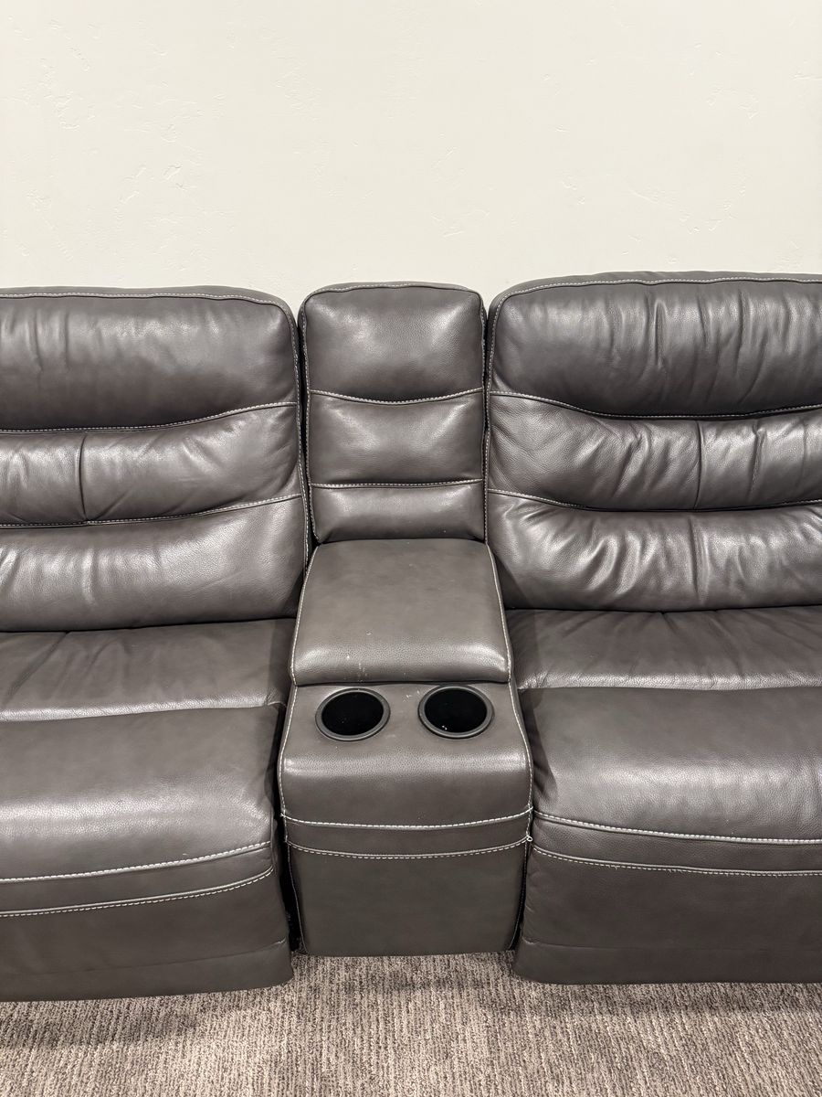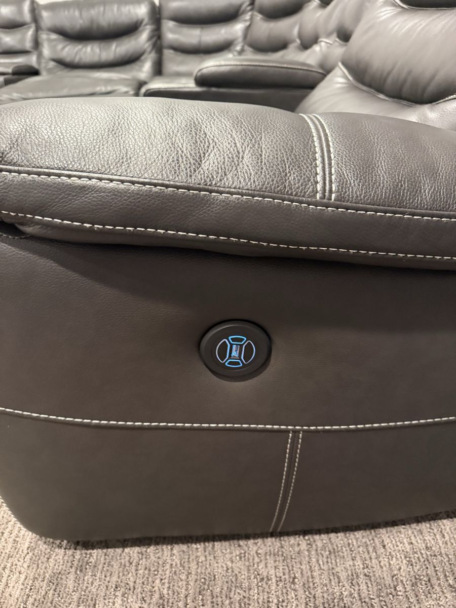 VenmoDark brown/charcoal grayish leather sectional with 3 power reclining chairs, and two storage compartments with chargers and drink holders. This is gently used and in excellent condition. This couch is currently $3200 at RC Willey.