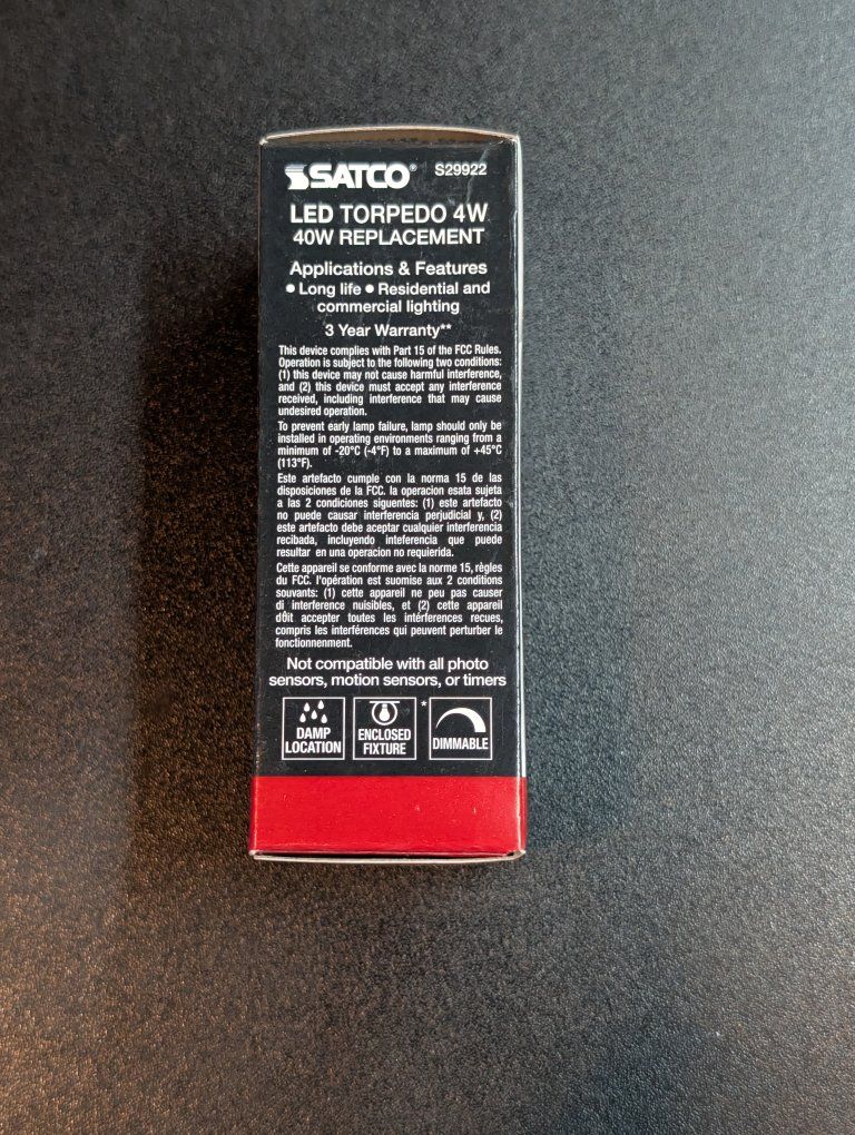 ZelleBrand: Satco Model: S29922 Type: Decorative LED Torpedo Base: Candelabra (E12) Condition: New