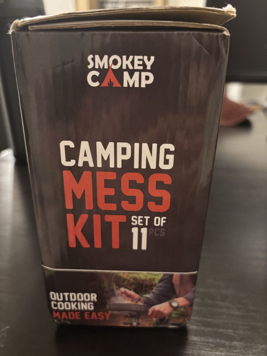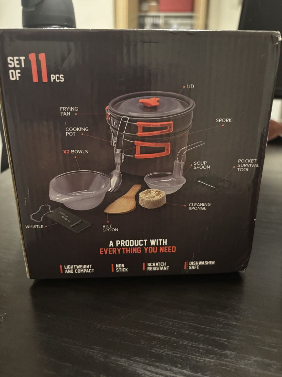 ApplePay11 Piece camping mess kit in original packaging. This stackable, lightweight, dishwasher safe compact set includes: • black drawstring mesh carrying bag