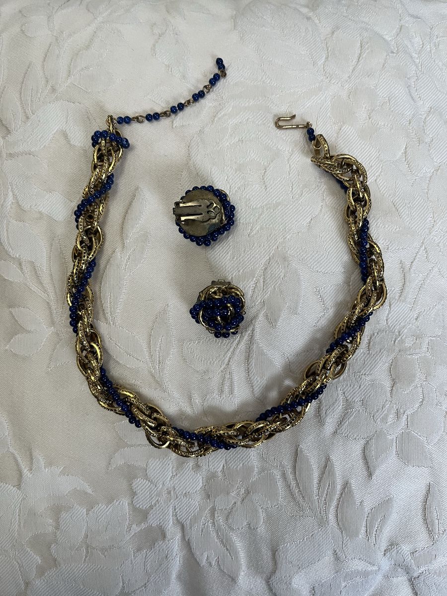 VenmoThis was made in the 1950's. The gold chains have a pretty detail on them. The dark blue bead is quite stunning mixed in with the gold. The matching earring are clip ons. This is a well made and a quality set. Sold as a set. Price is firm.