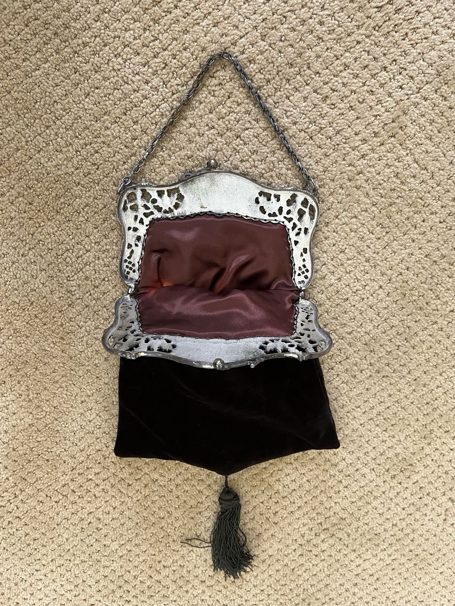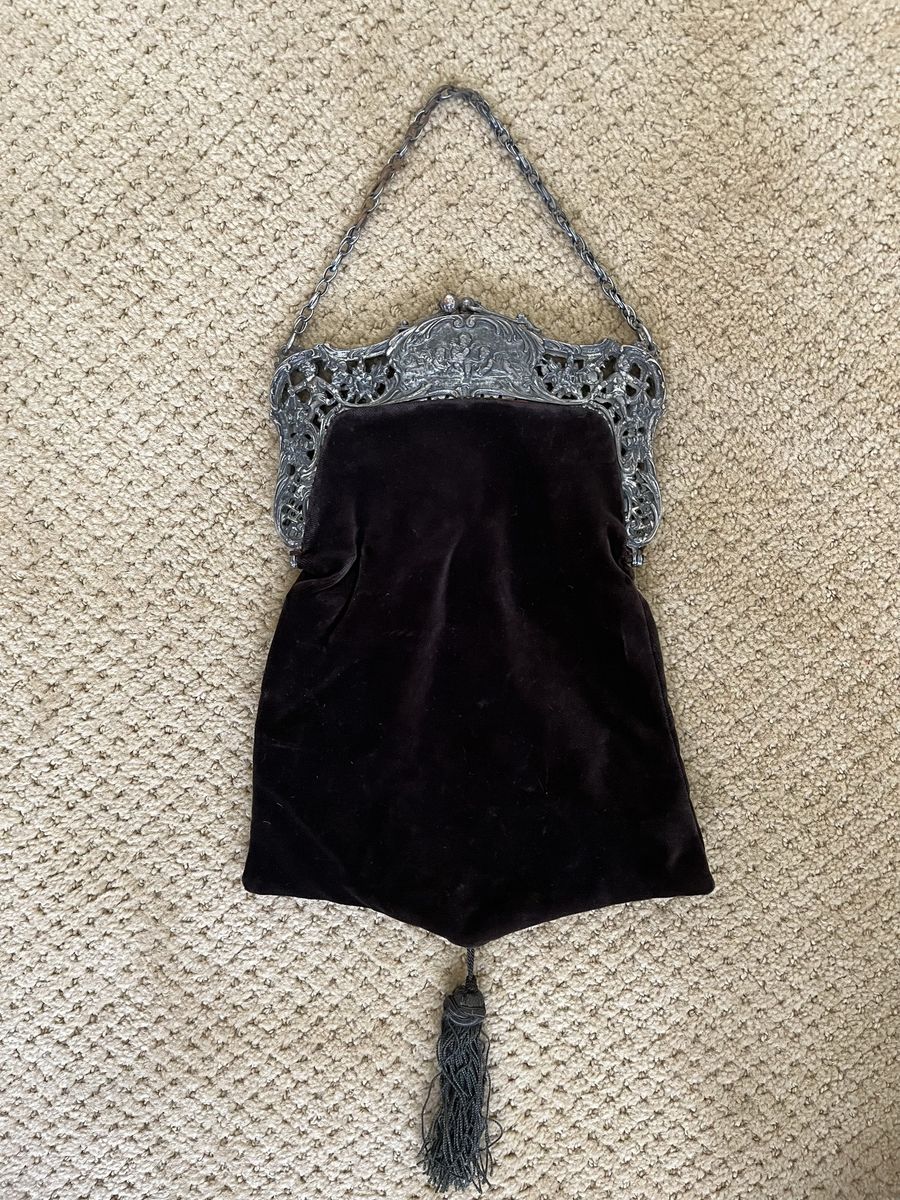 VenmoThis is a stunning and beautiful one of a kind find. It has a lovely pattern on the metal silver frame. It is embossed and has a cut out style. There are five cherubs on each side of the purse frame. By the clasp at the top of the purse are three cherubs. There are also cherubs on each edge of the purse frame. The frame has the same wonderful detail on each side, cherubs, leaves, and flowers. It is a heavy frame. This has a interlocking silver chain for the handle. The dark brown velvet and fun tassel at the bottom of the purse are in excellent condition. The inside of the purse is lined with a lighter brown satin/silk material. It shows some wear, which is very common for something this old. This is a large purse. I believe this is from the 1800's to very early 1900's. It has a Edwardian and a Art Nouveau feel to it. Overall the purse measures 20 inches long. From the top of the chain handle to the bottom of the tassel. From the bottom of the purse to the bottom of the tassel is 5 inches. Serious inquiries only. Helping a parent to sell. This is a must see piece!
