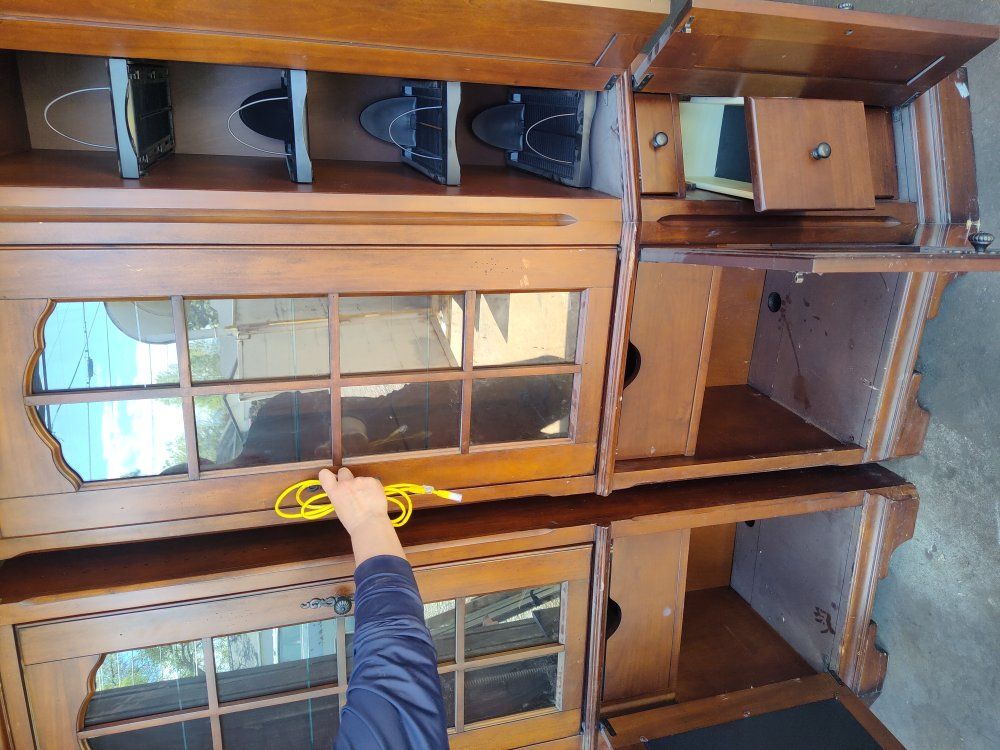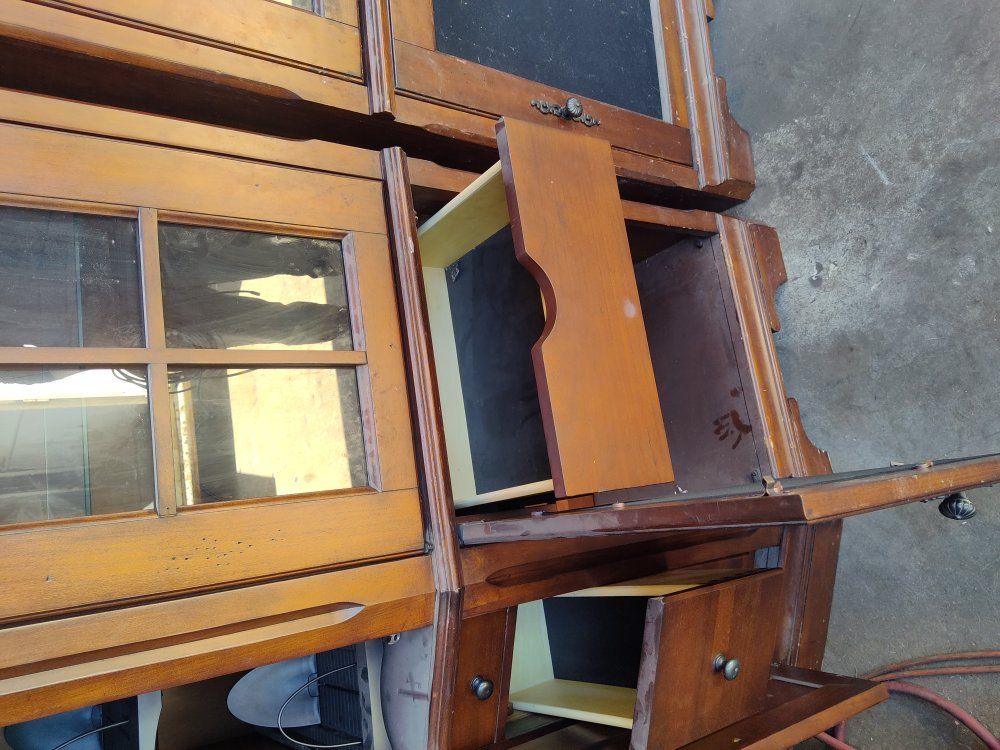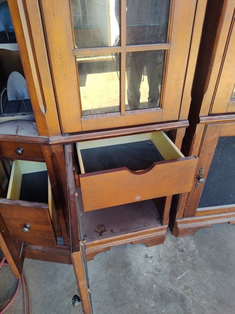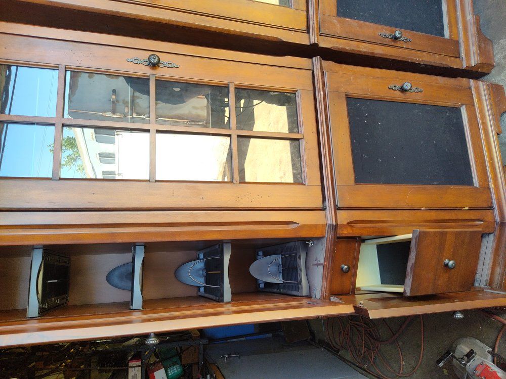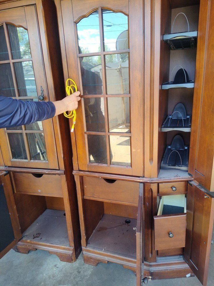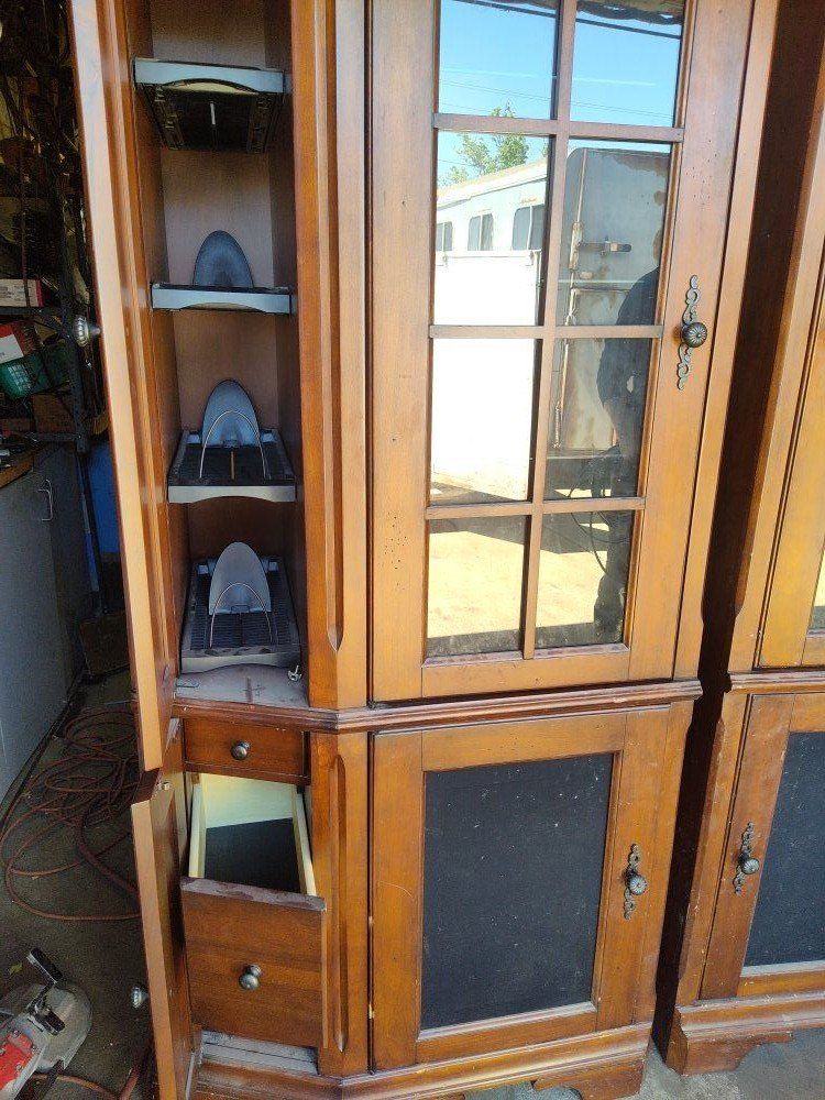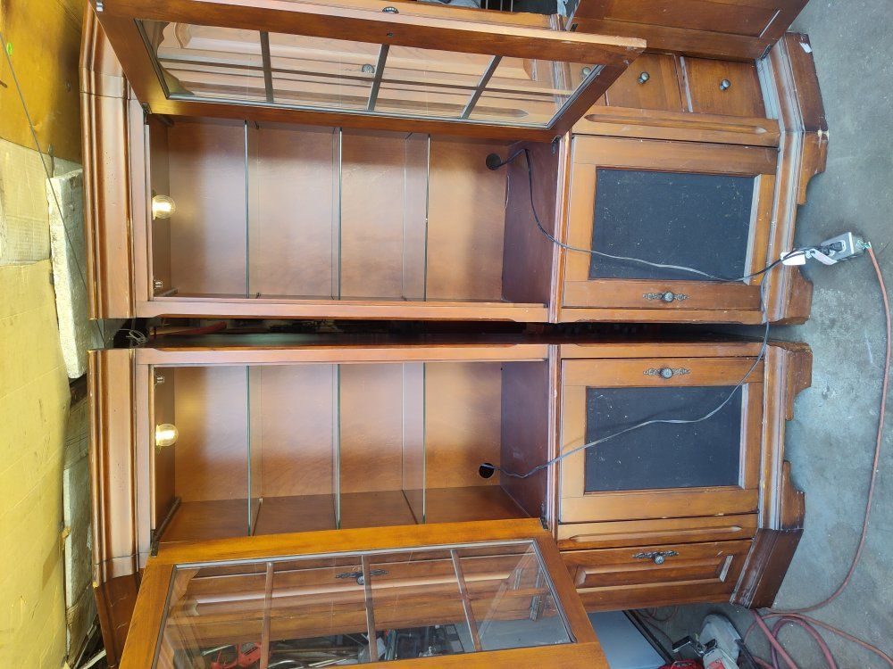 Large and heavy entertainment center ends with display case and lights. It's really beautiful, but does have come scratches and dings. It's a little over 6ft tall and has pin/dowel holes so that you could add shelves and connect the two pieces. Just changing furniture in our house. Make sure you bring a truck or trailer and lots of help, they are HEAVY. Please text or message with questions.