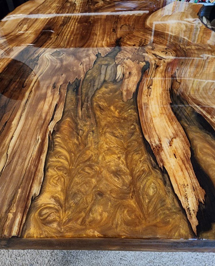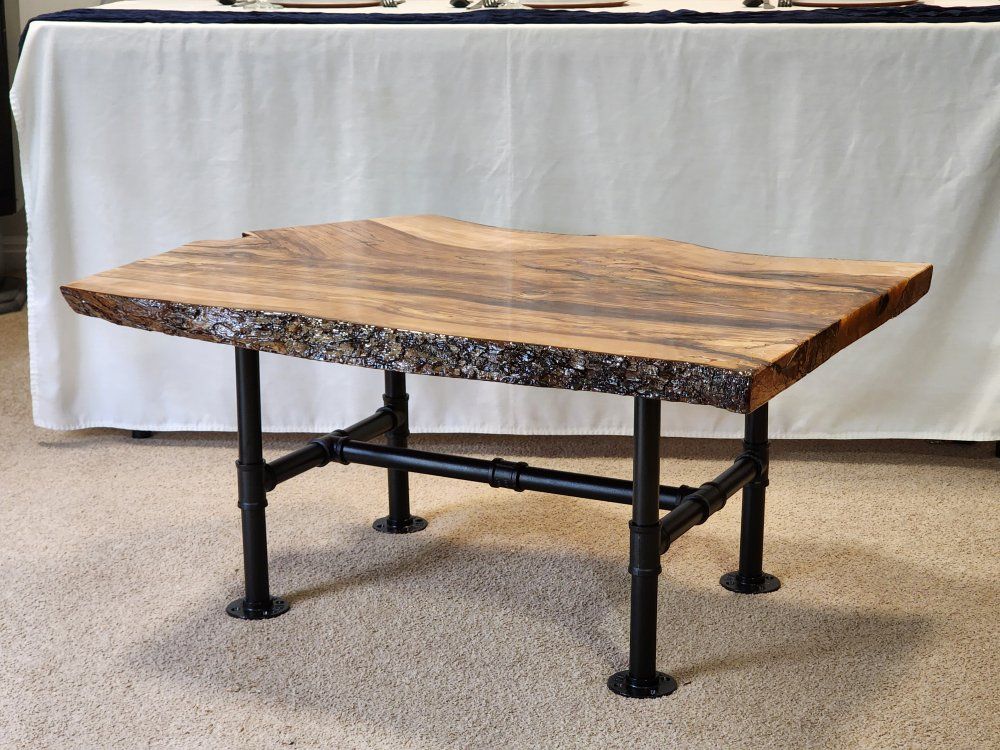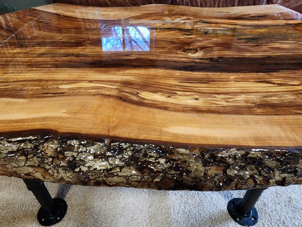 PayPalThis is a new handmade coffee table. All the beautiful features met in one table! The slab is from an apple tree that was removed locally several years ago. You'll have a hard time finding another apple slab this wide. Live edge, bark-intact, areas of flamed wood grain, spalted, reddish-brown heart wood with lighter sapwood- the wood is gorgeous! A void has been filled with deep-pour epoxy mixed with mica powder that blends with the natural tones of the wood instead of some garish color. Fully sealed and stabilized with epoxy. Black metal pipe legs.