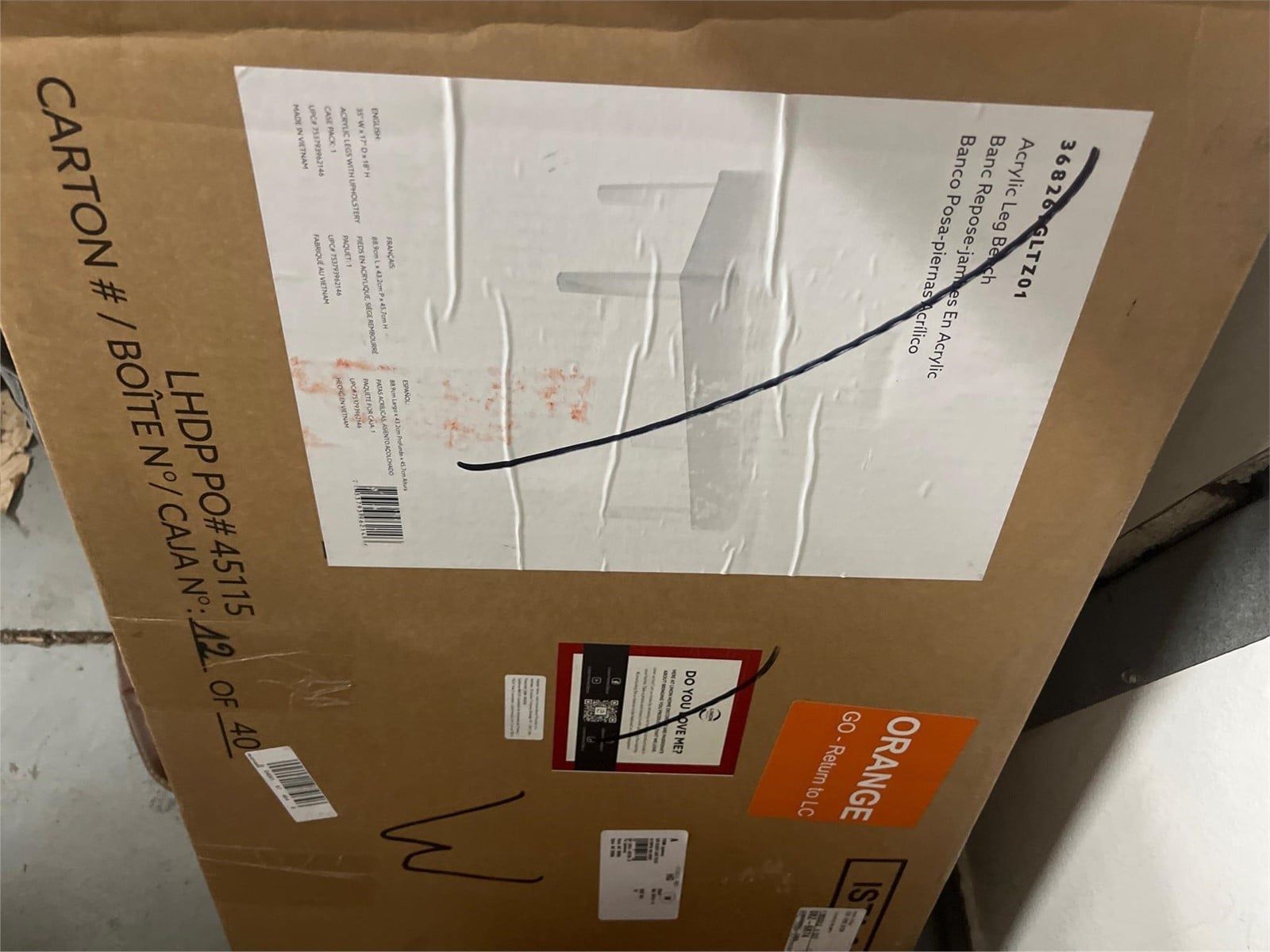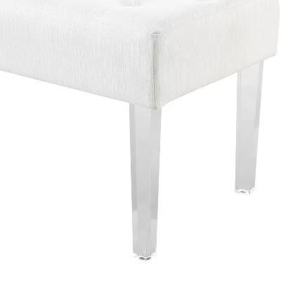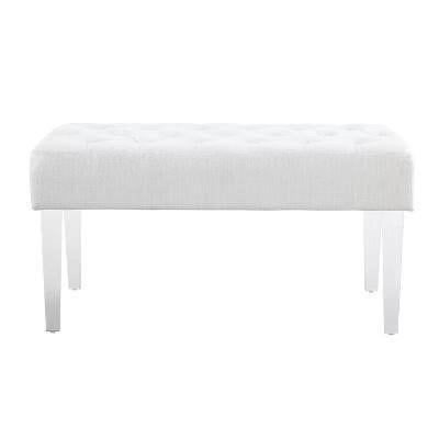 VenmoExuding modern design and appeal, the Ella Acrylic Leg Bench is perfect for adding eye-catching style to any space. The clear acrylic legs offer a dramatic look to the simple shape. The plush seat is upholstered in a linen weave fabric and features simple tufted details. Perfect for placing in a bedroom, dressing area or living space. 18" Seat Height Overall Width: 35 Overall Depth: 17 Overall Height: 18 Leg Height: 12 Cushion Height: 6 Highlights: Softly upholstered polyester fabric bench Button tufted cushion Slightly tapered plastic legs Specifications: Features: Rectangle (shape) Number of Pieces: 1 Seats up to: 1 Dimensions (Overall): 18 Inches (H) x 35 Inches (W) x 17 Inches (D) Seat Dimensions: 35 Inches W, 17 Inches D, & 18 Inches floor to seat top Seat Cushion Dimensions: 6 Inches (Thick) Weight: 21.43 Pounds Holds up to: 275 Pounds Material: Acrylic (Frame) Finish: Glossy Fill Material: 100% Polyester Features: Tufted Furniture Legs Material: Acrylic Textile Material: 100% Linen Upholstery: Upholstered Assembly Details: Adult Assembly Required, Tools Not Provided. Original price 190$