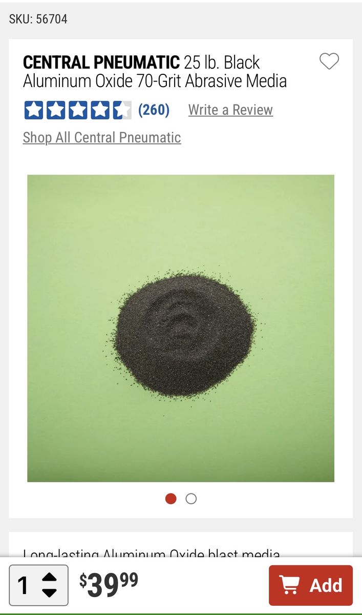 ZelleHarbor Freight blast media. Black Iron Oxide. New in box. Never opened. Harbor Freight says its Non Returnable. $39.99 at Harbor Freight