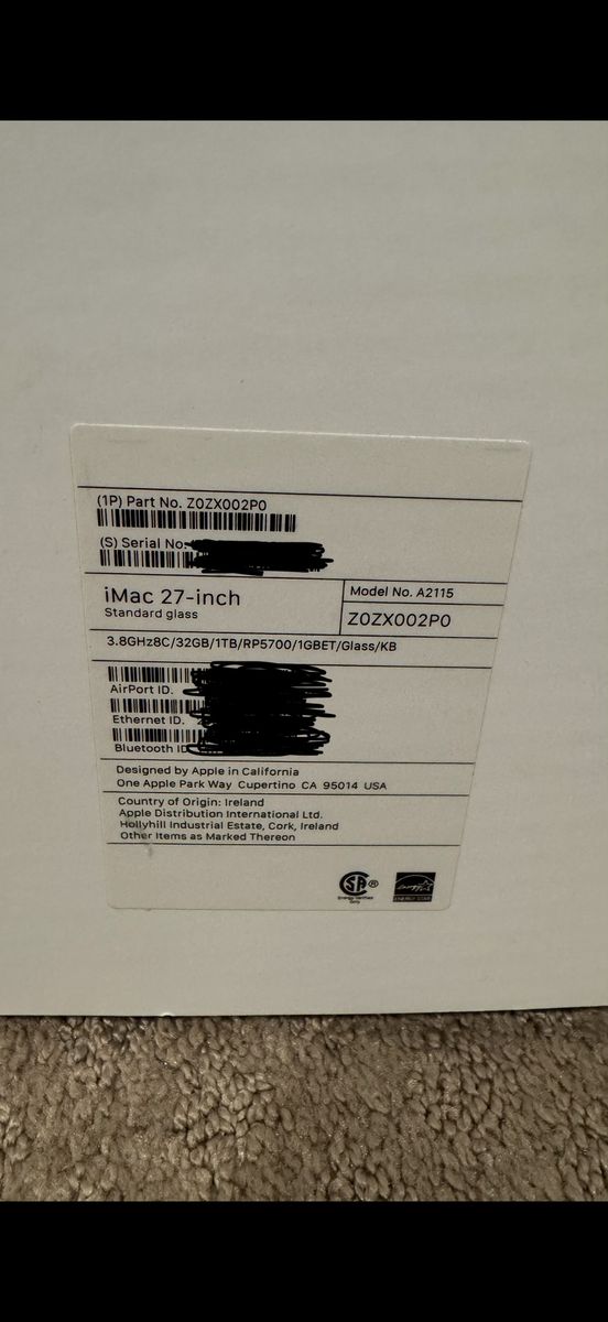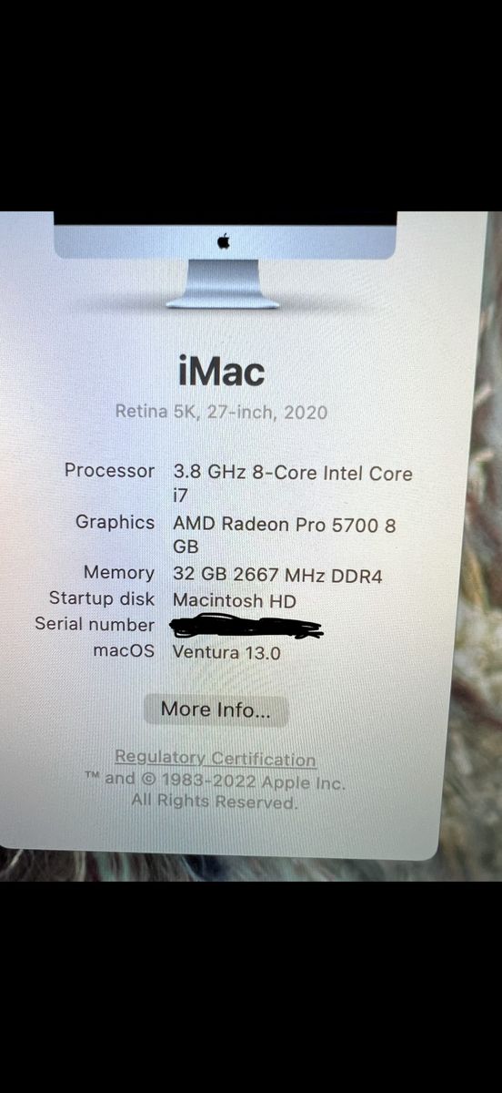 Processor: 3.8 GHz 8-Core Intel Core Graphics: AMD Radeon Pro 5700 8 GB Memory: 32GB 2667 MHz DDR4 Storage: 1 TB SSD