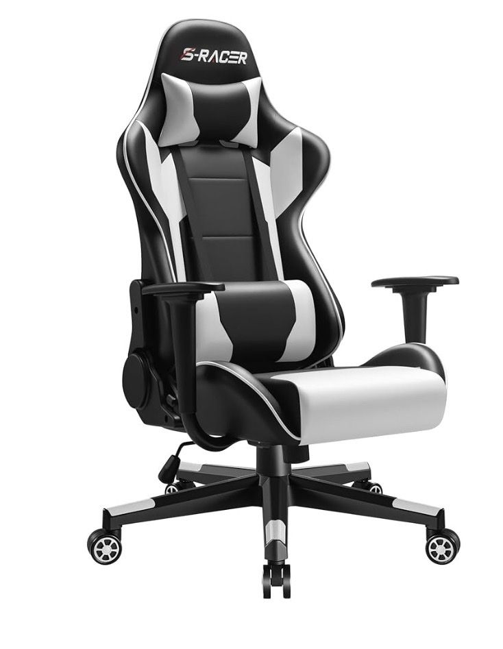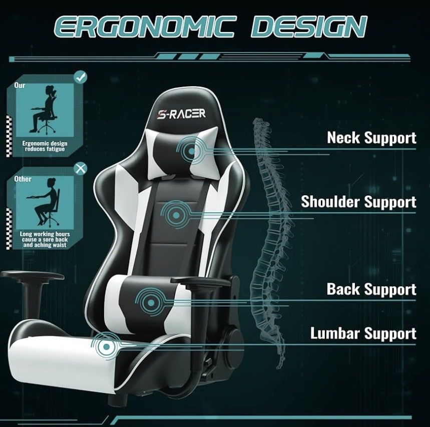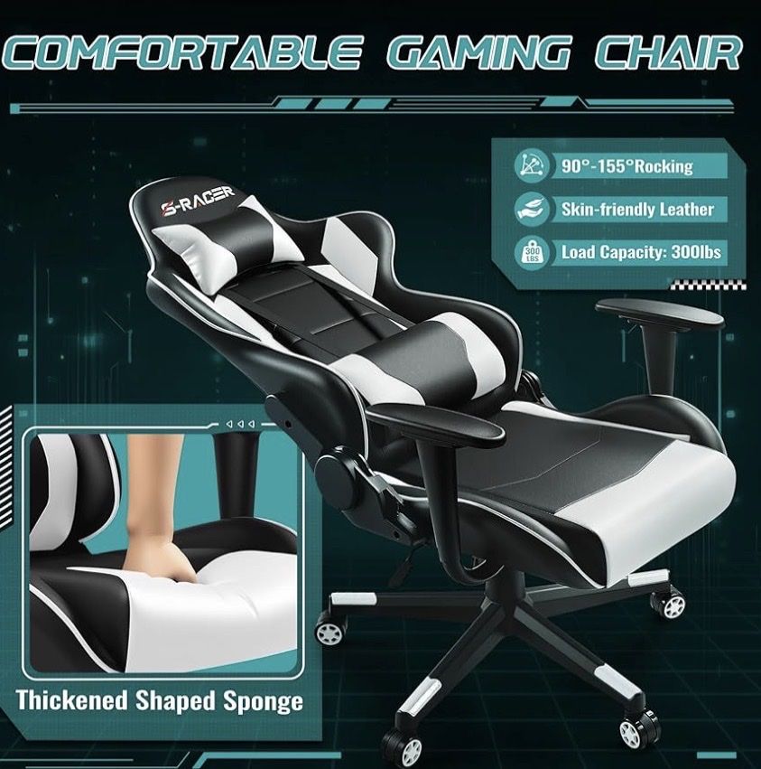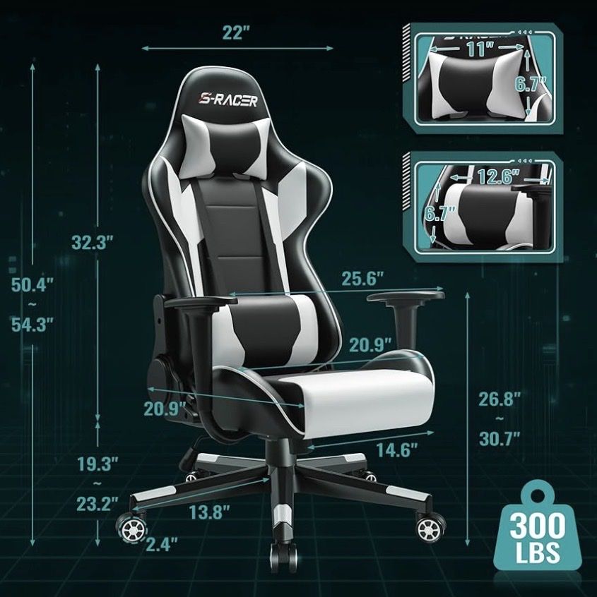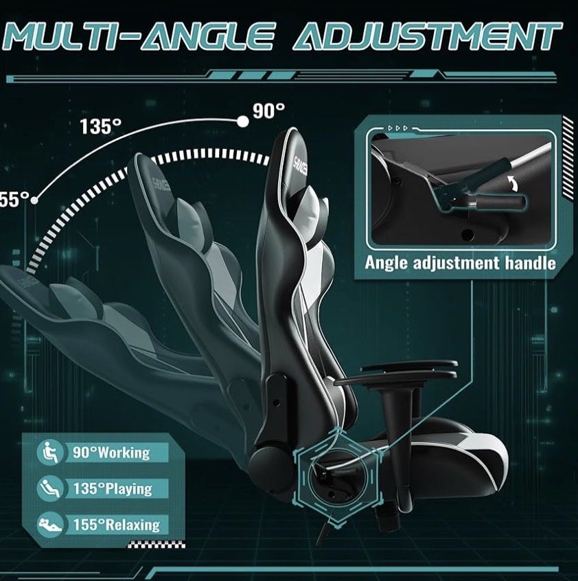 Multi-angle Adjustment for Work and Relaxation: The game chair reclines smoothly from 90 to 155 degrees, effortlessly supporting various postures for focused gaming, comfortable working, or moments of rest Effortless Height Adjustment for Optimal Posture: A user-friendly pneumatic lever allows for seamless height customization, ensuring proper alignment and ergonomic support for users of different statures Sturdy Construction with 300lbs Weight Capacity: Engineered with a strengthened frame and base, this gamer chair delivers reliable stability and support, accommodating up to 300 pounds for long-term durability Customizable Support for Neck and Lumbar: The adjustable headrest and lumbar pillow are designed to provide targeted support, helping to maintain spinal alignment and reduce pressure points during extended use Premium Materials for Style and Comfort: Crafted with high-quality synthetic leather and breathable mesh, the gaming chair offers a balance of sophisticated style, lasting resilience, and enhanced airflow for all-day comfort.