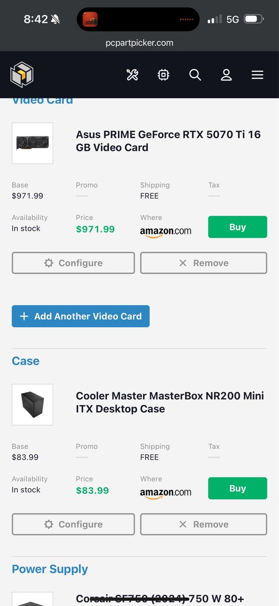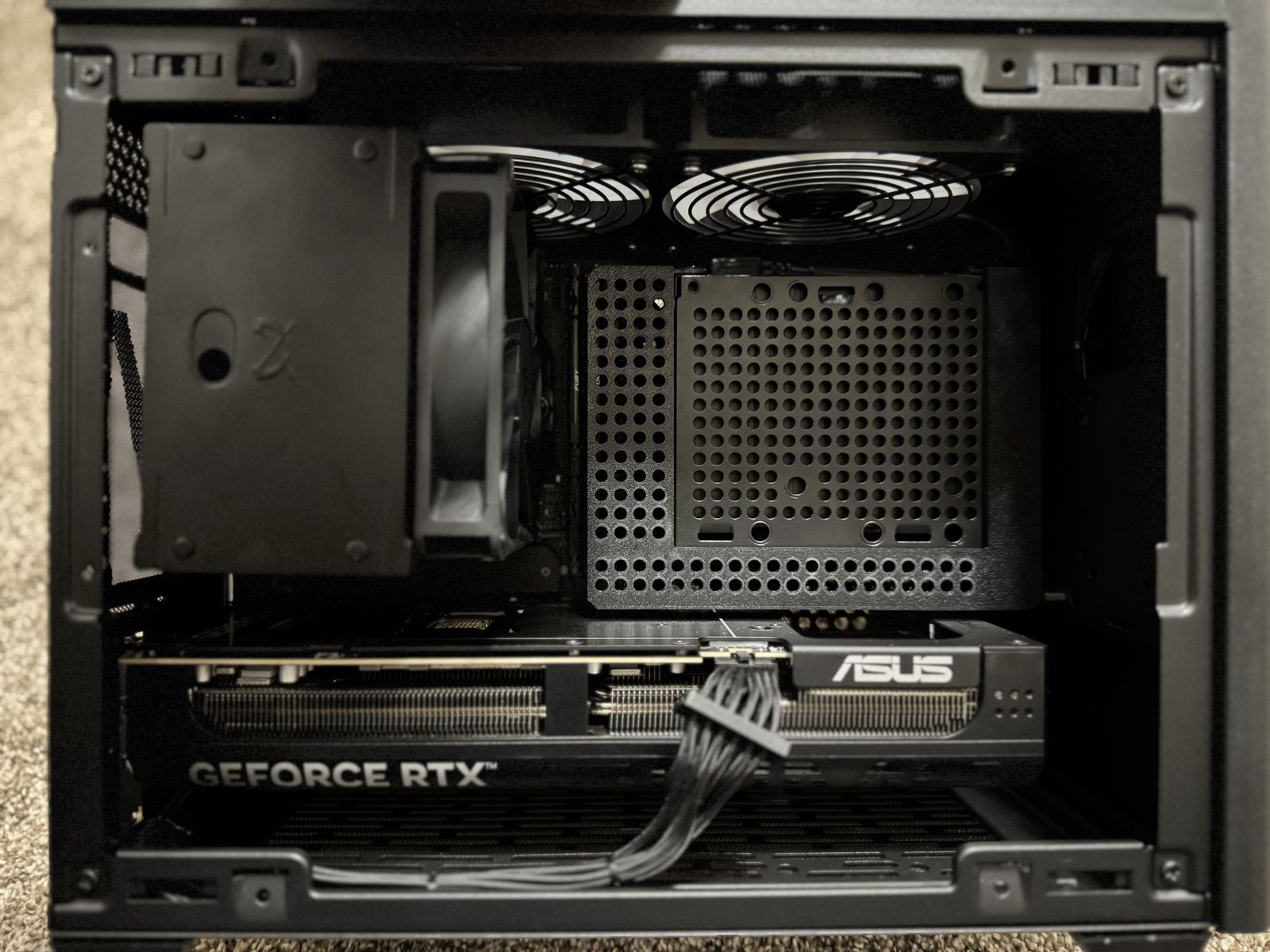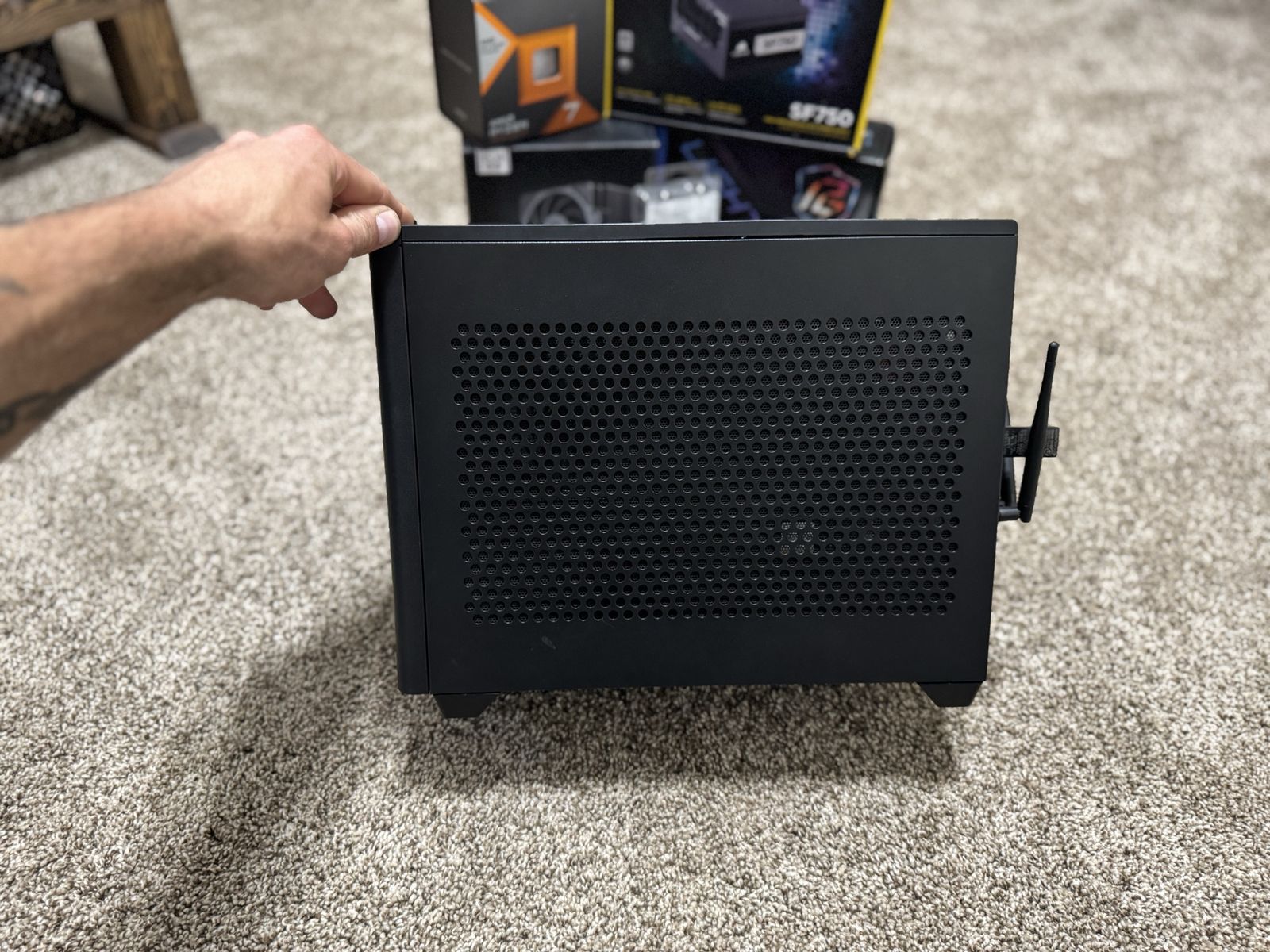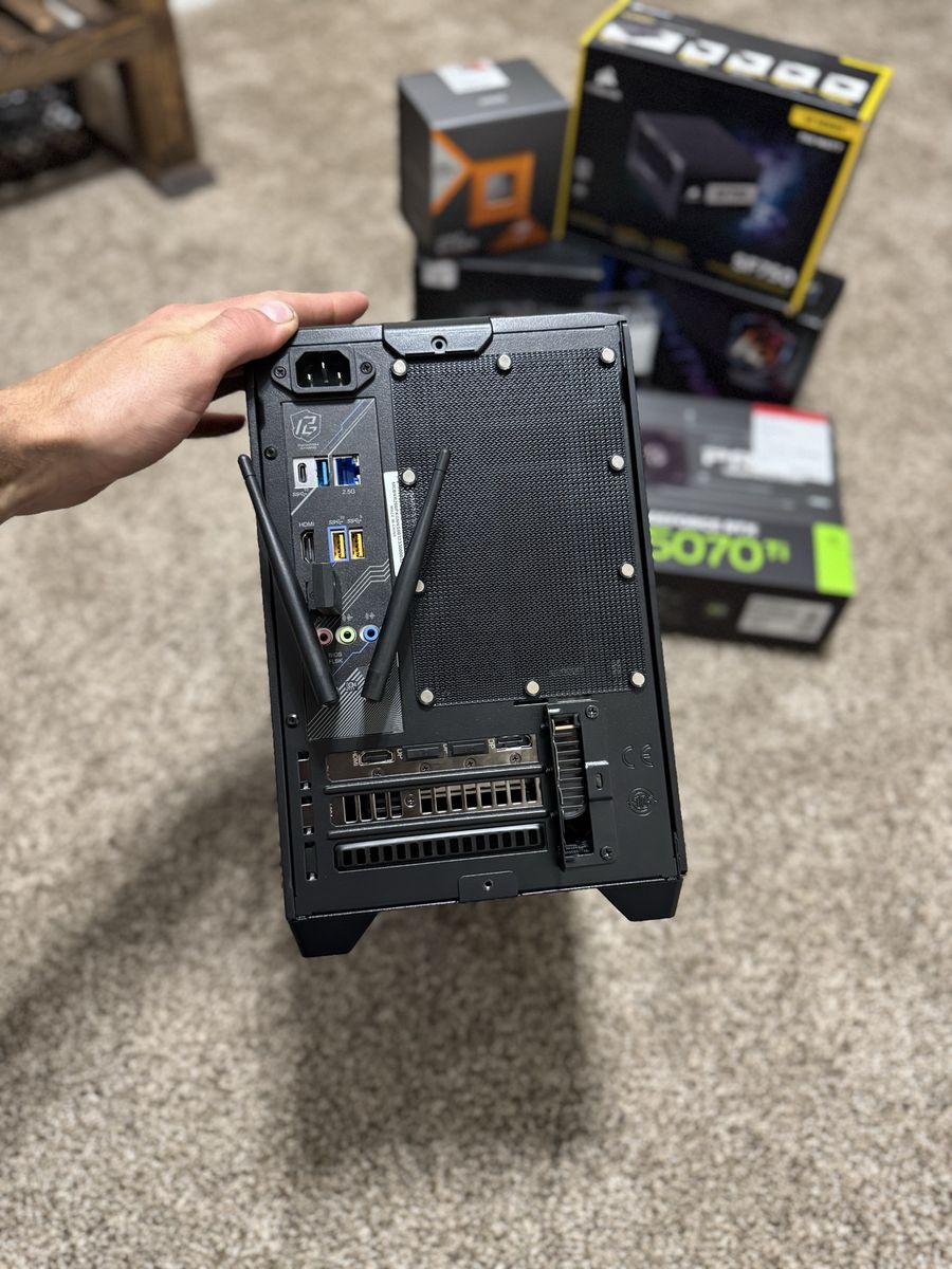 The build was tastefully built with the following components. -ASUS Prime 5070TI 16gb -AMD Ryzen 7 7800X3D -Kingston Fury Beast 32gb DDR5-6000 CL30 -2TB Crucial P3+ -1TB Crucial P3+ -Cooler Master NR200 Mini ITX -Corsair SF750 -ASROCK A620I Lightning WiFi -Scythe Mugen 6 cooler -Corsair ARGB 120mm fans.