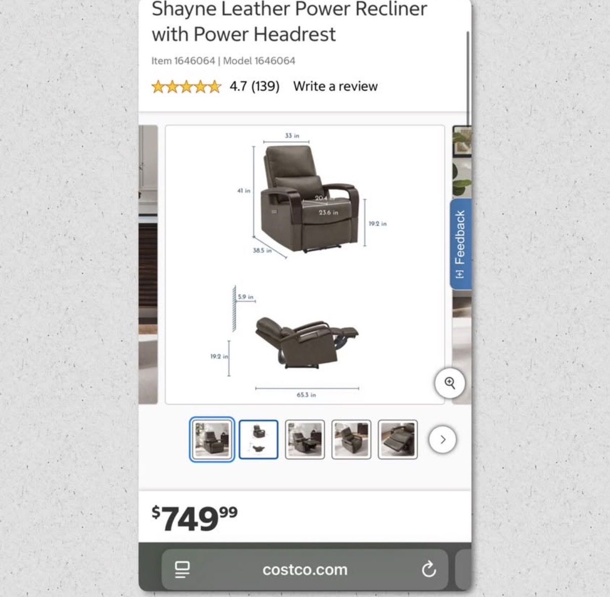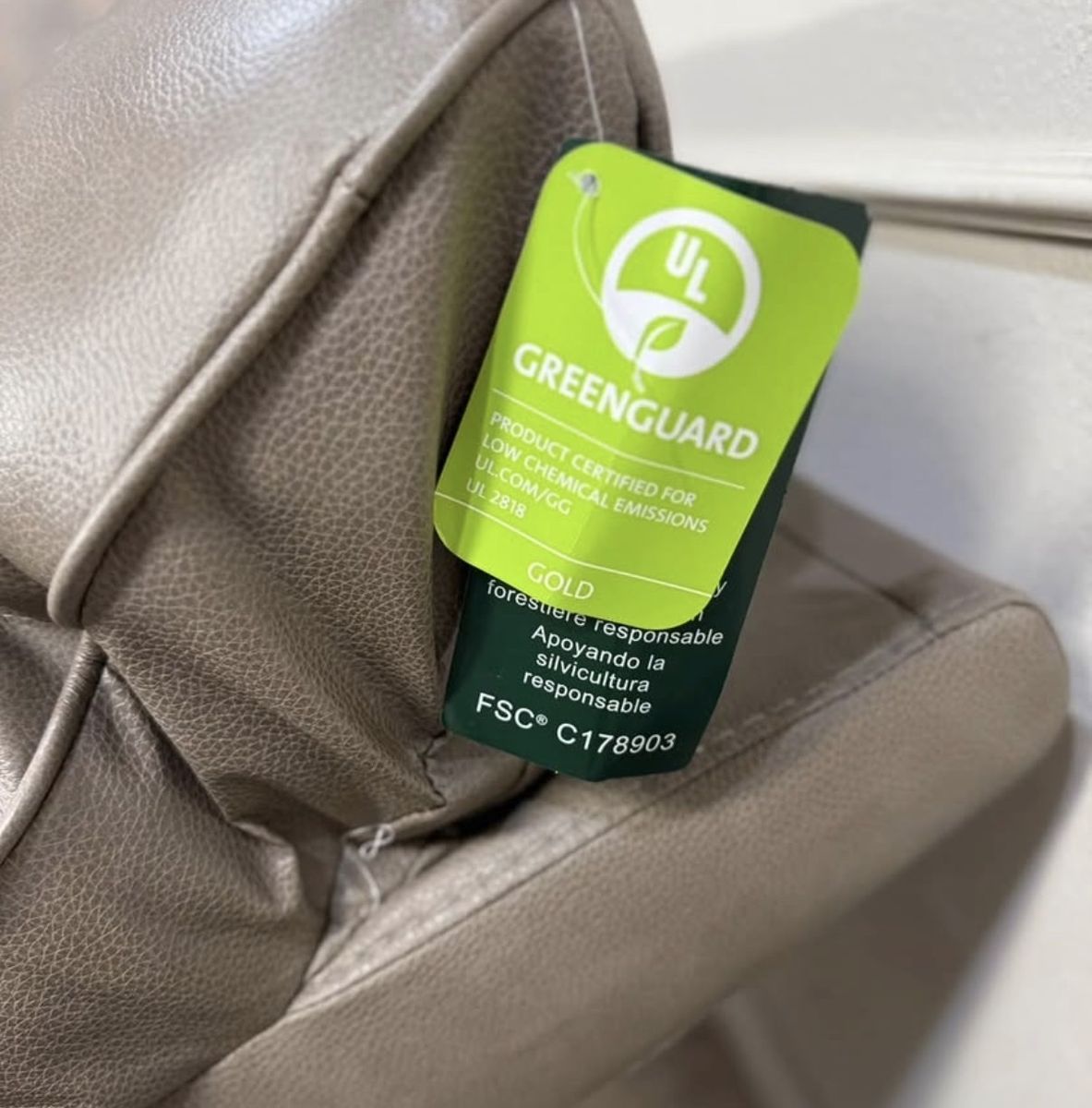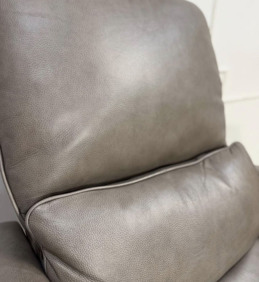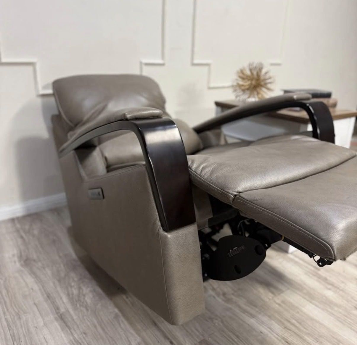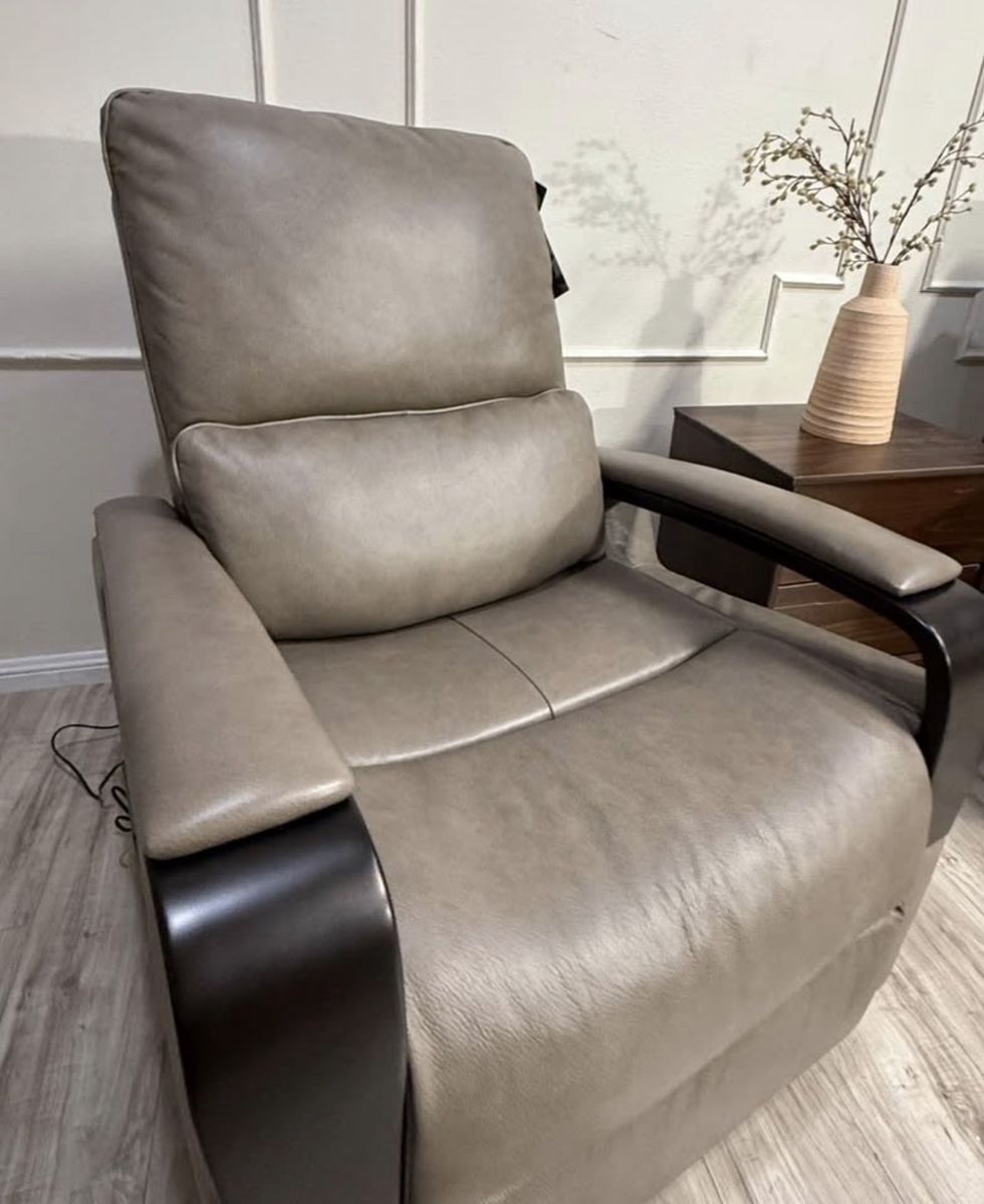 Shayne Leather Power Recliner with Power Headrest. This is a stylish set of recliner chairs. Color is a taupe with expression Vynil arm rests Top Grain Leather & Vinyl Match on Sides and Back Leggett & Platt® CLOUDZERO® Reclining Mechanism Power Recliner with Power Headrest Solid Wood Curved Arms USB-A and USB-C Port