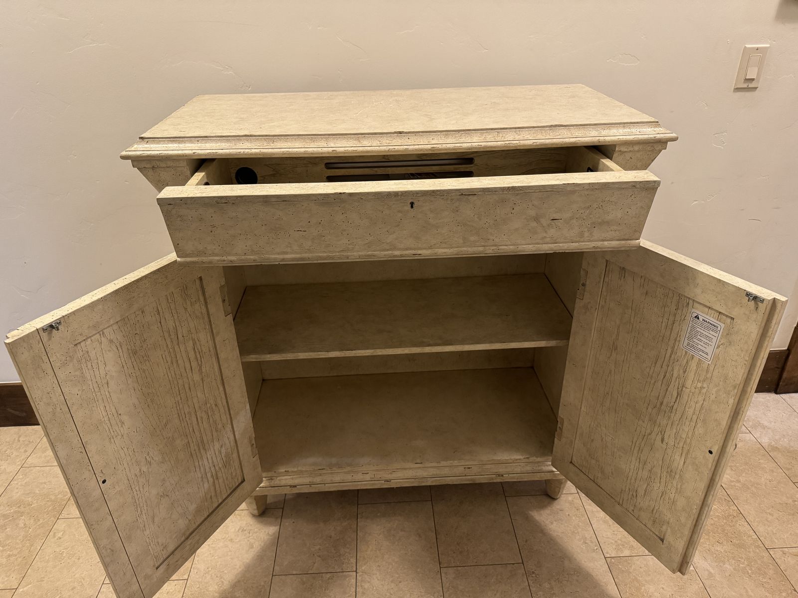 VenmoBeautiful and well-made Stanley Furniture media chest, originally purchased for $1,500. This piece combines style and functionality with a unique distressed cream finish that adds a rustic, high-end look to any space.