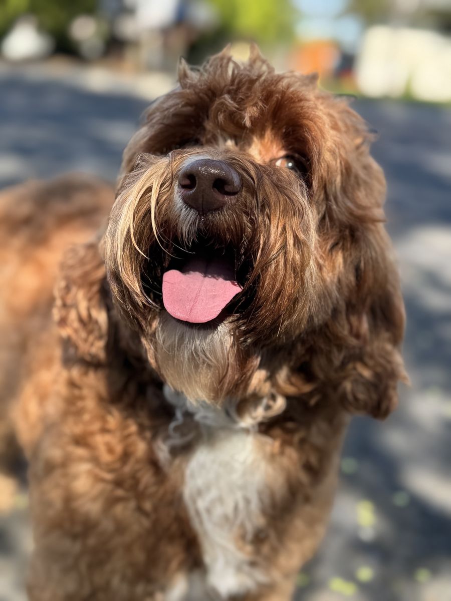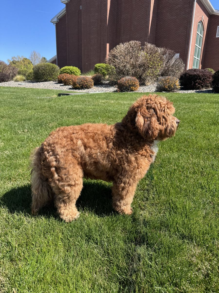 Missy is around 27 lbs and has a compact, balanced build. She has a lovely wavy fleece that is silky soft and so touchable. She is mellow, quiet, gentle, kind, playful and happy. She can be a bit shy at times, but is also a very sweet, good girl. She also gets along well with other dogs and rides well in a car.