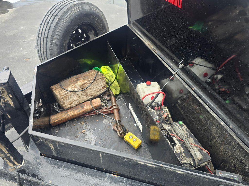 7' x 16' concrete-grade deck Full tubular framework 16,000 lb GVW 8k axles Upgraded 16‑ply tires 13 lb beam materials Spreader gate Heavy-duty ramps Tie-downs/tie-down tabs Tarp and battery included Large lockable storage compartment Spare tire