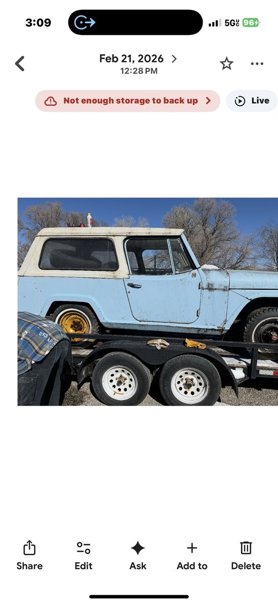 $6500 OBO Jeep Commander Blue and white what you see is what you get the glass is all intact. Dauntless Buick V6 engine 25,000 Miles Gas tank in good shape Has not been run for 30 years needs a new battery been in storage.