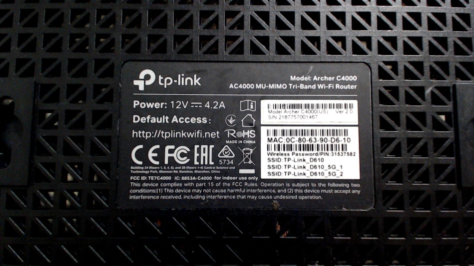 Good working tp-link ac-4000 Tri-Band WiFi Router Archer C4000 with Power Adapter and Ethernet cable