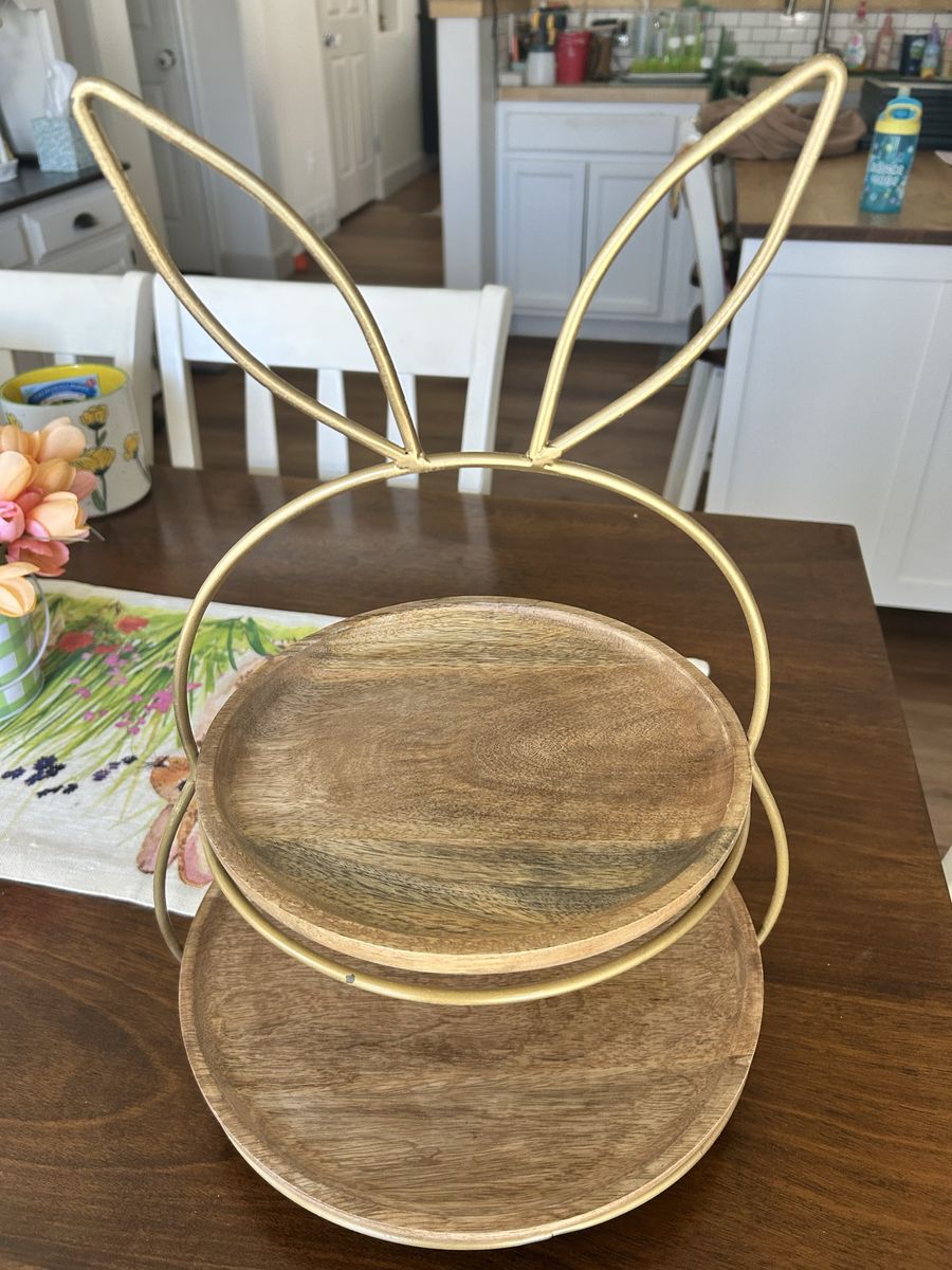 VenmoFor sale is a super cute decorative tray featuring gold, metal bunny ears. Wooden “plates” for holding lots of decor. Tray is about 18.5” tall by 12” at widest point. Brand new, without tags. Never used! Was $29.99 originally.