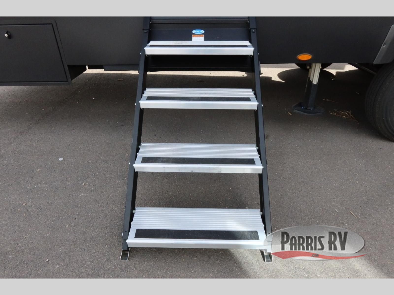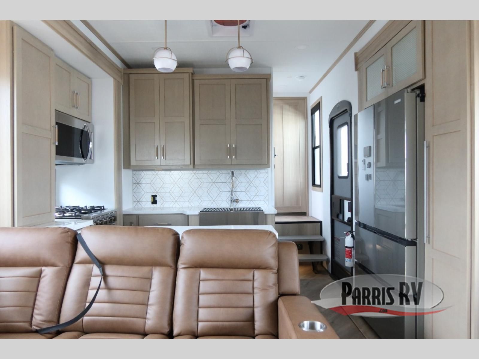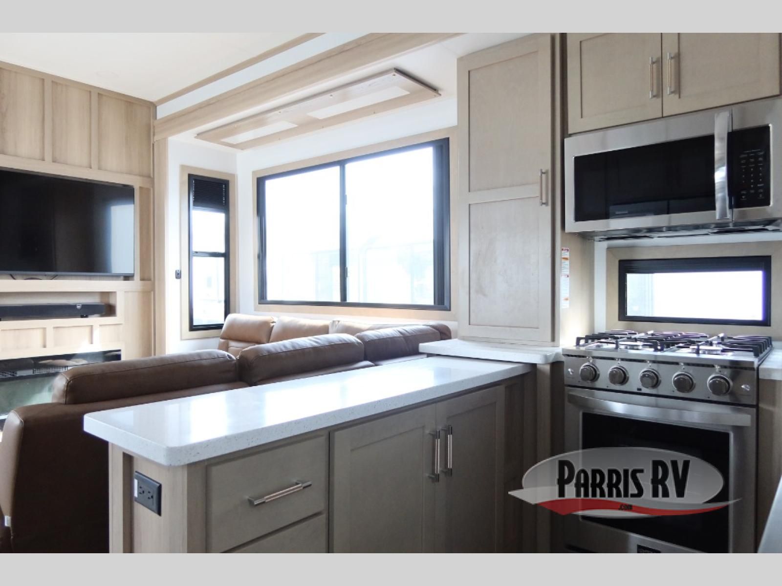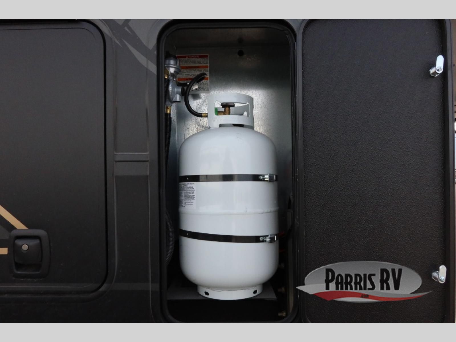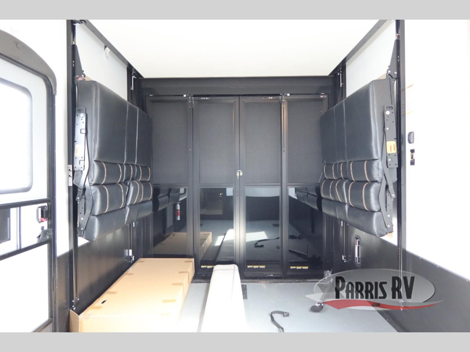The whole family will love camping in this fifth wheel toy hauler! The front private bedroom has a king bed slide for more interior space, a Smart LED TV, a front large wardrobe, plus washer and dryer prep. Freshen up each morning in the full bathroom with the fiberglass one-piece shower then head to the kitchen to fry up some eggs on the four-burner range and bake some cinnamon rolls in the 24" stainless steel oven. Grab a cold cup of orange juice from the 20-cu. ft. 12-volt refrigerator and enjoy it along with the eggs at the dinette table or in the 15' garage on one of the dual opposing sofas with cupholders. The L-shaped hide-a-bed sofa is conveniently across from the entertainment center with a 50" Smart LED TV and fireplace. As you head into the 15' garage area, you will notice a loft with a twin bed, a queen bed above the opposing sofas, Adjust-A-Track frame welded tie downs, and one of the dual entry doors to the unit!
