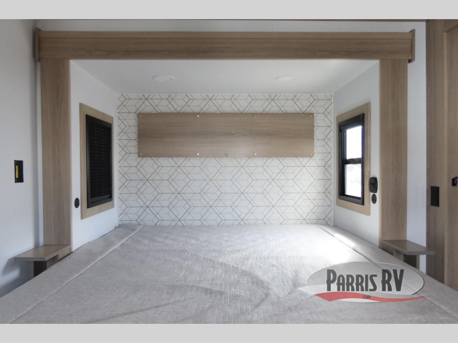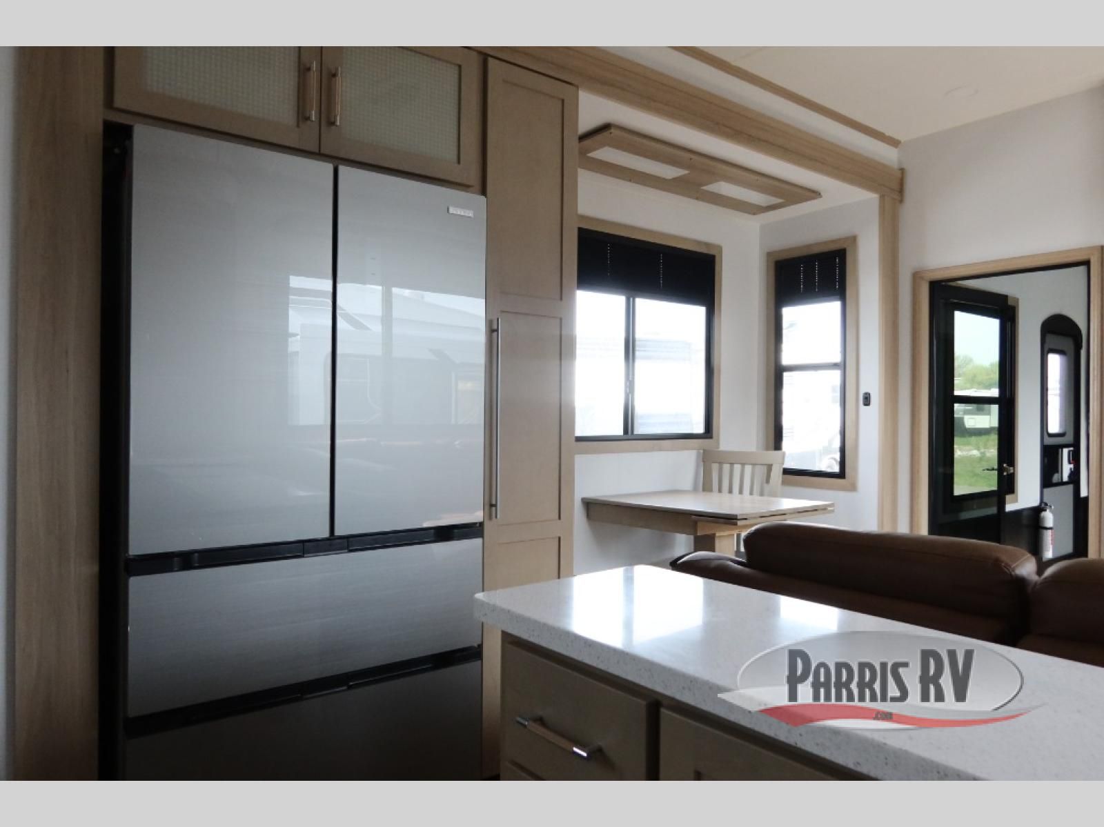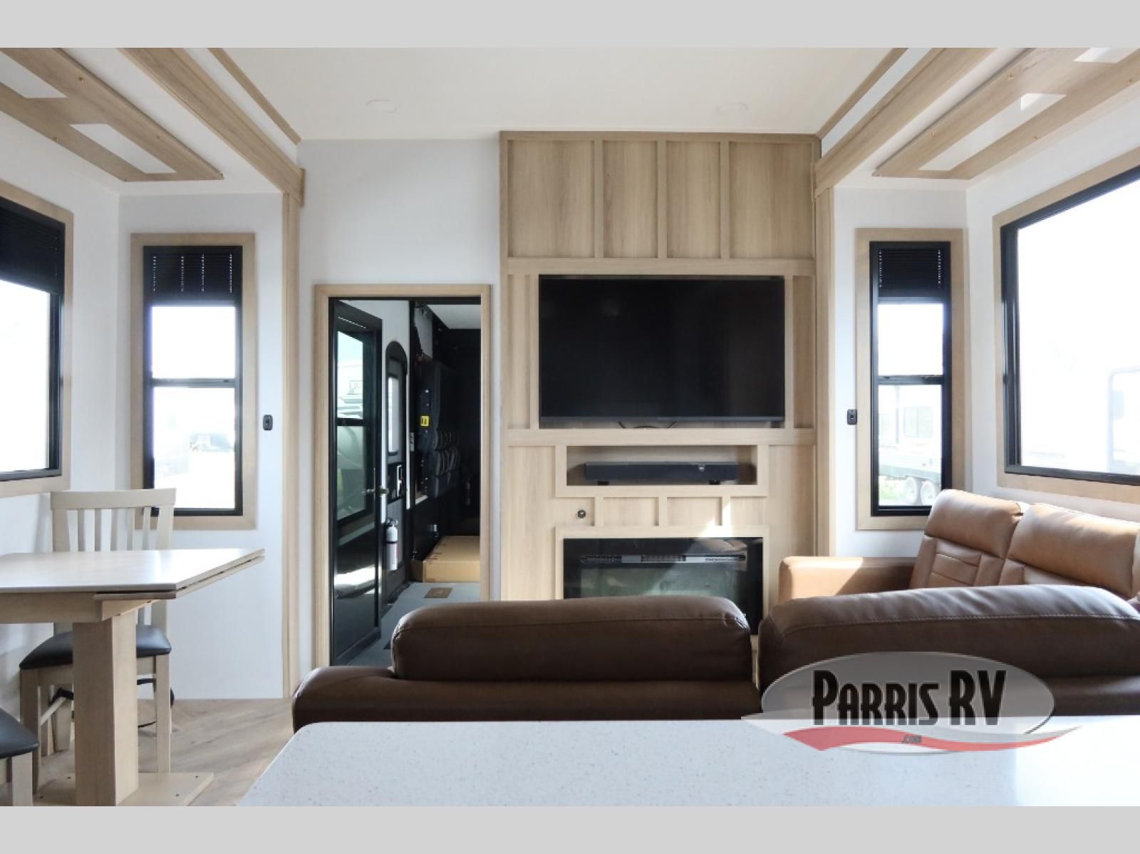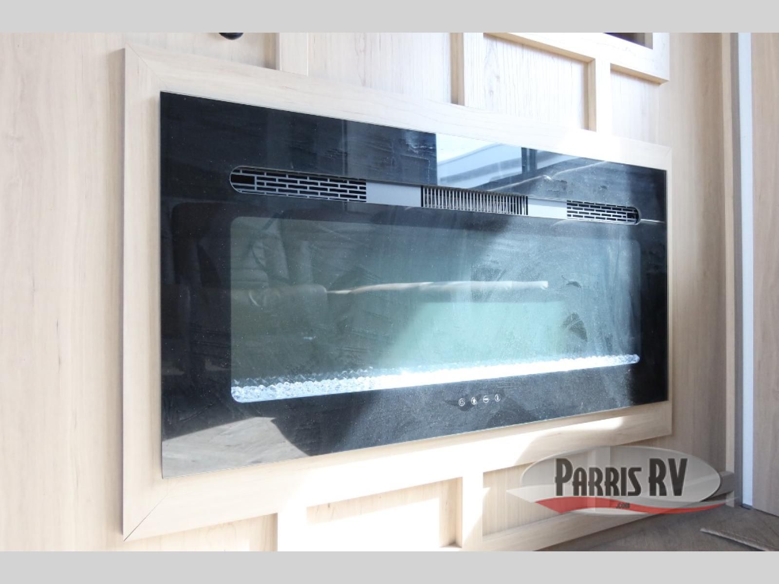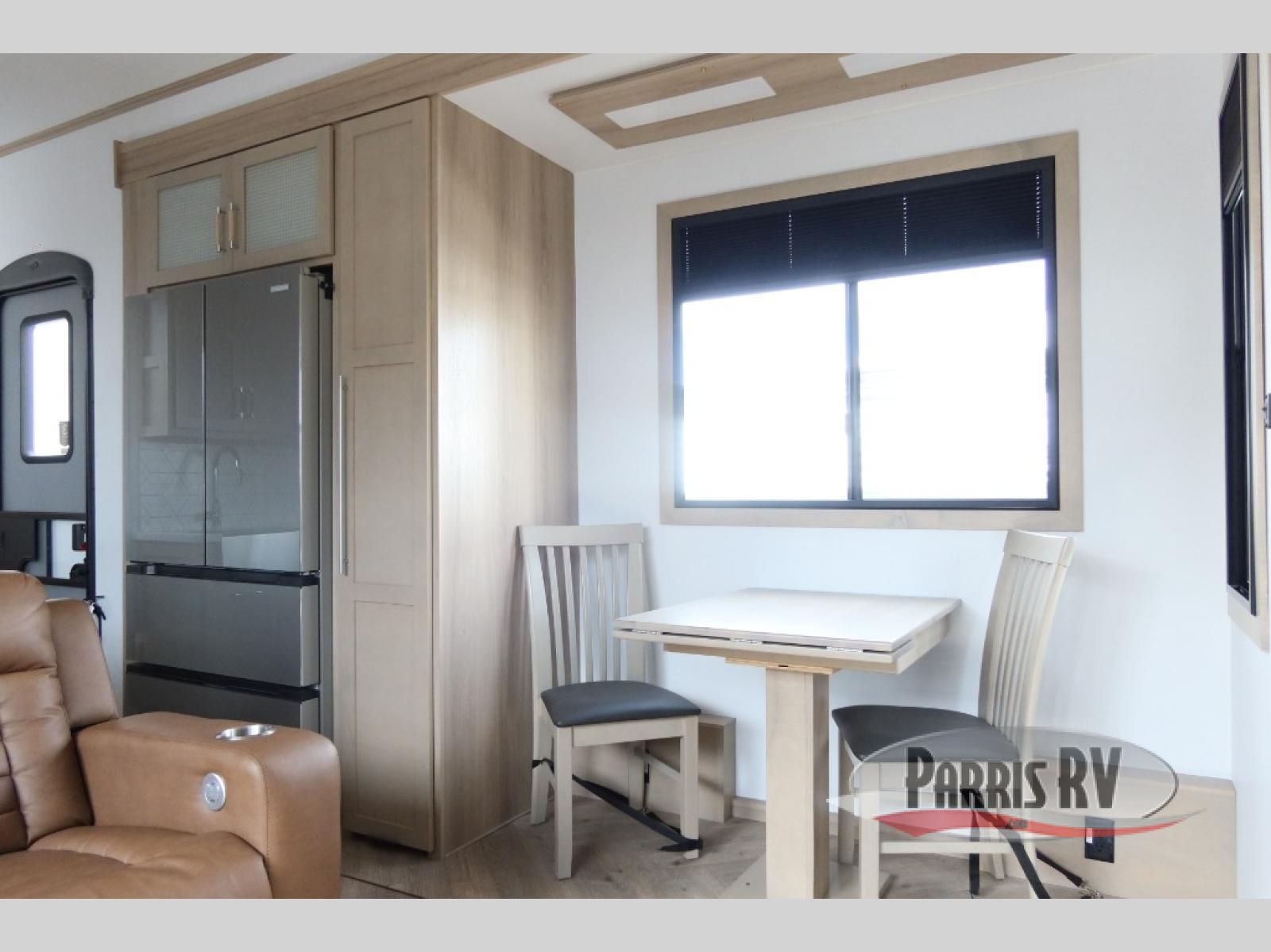 The whole family will love camping in this fifth wheel toy hauler! The front private bedroom has a king bed slide for more interior space, a Smart LED TV, a front large wardrobe, plus washer and dryer prep. Freshen up each morning in the full bathroom with the fiberglass one-piece shower then head to the kitchen to fry up some eggs on the four-burner range and bake some cinnamon rolls in the 24" stainless steel oven. Grab a cold cup of orange juice from the 20-cu. ft. 12-volt refrigerator and enjoy it along with the eggs at the dinette table or in the 15' garage on one of the dual opposing sofas with cupholders. The L-shaped hide-a-bed sofa is conveniently across from the entertainment center with a 50" Smart LED TV and fireplace. As you head into the 15' garage area, you will notice a loft with a twin bed, a queen bed above the opposing sofas, Adjust-A-Track frame welded tie downs, and one of the dual entry doors to the unit!