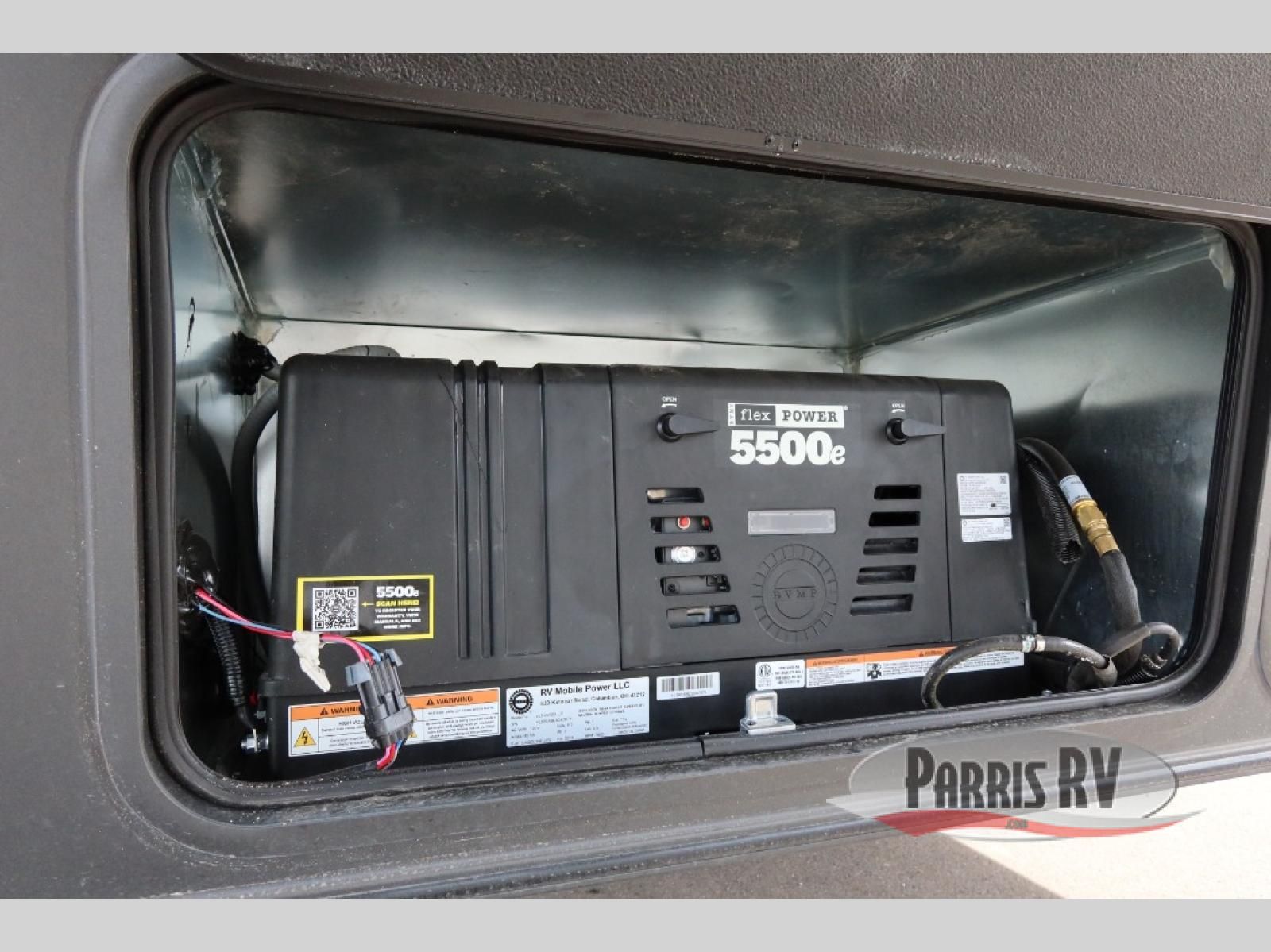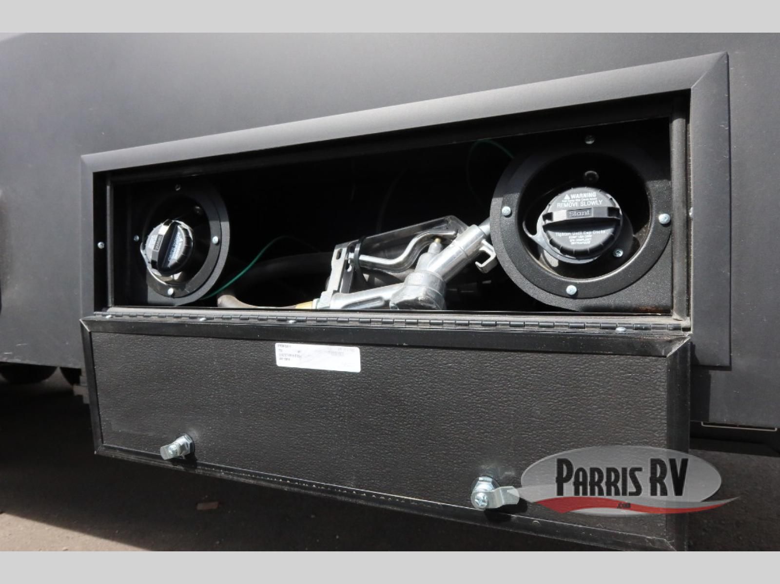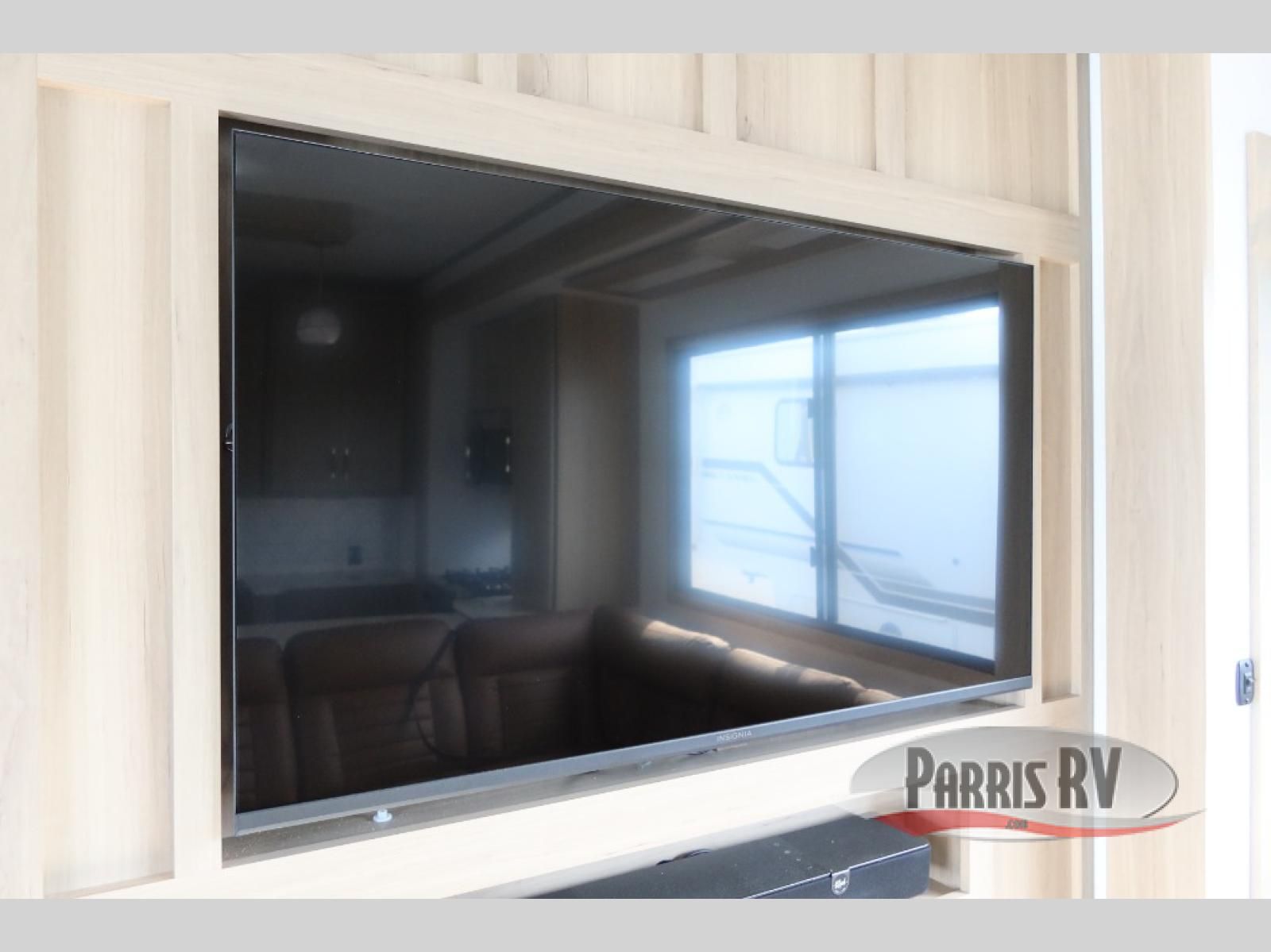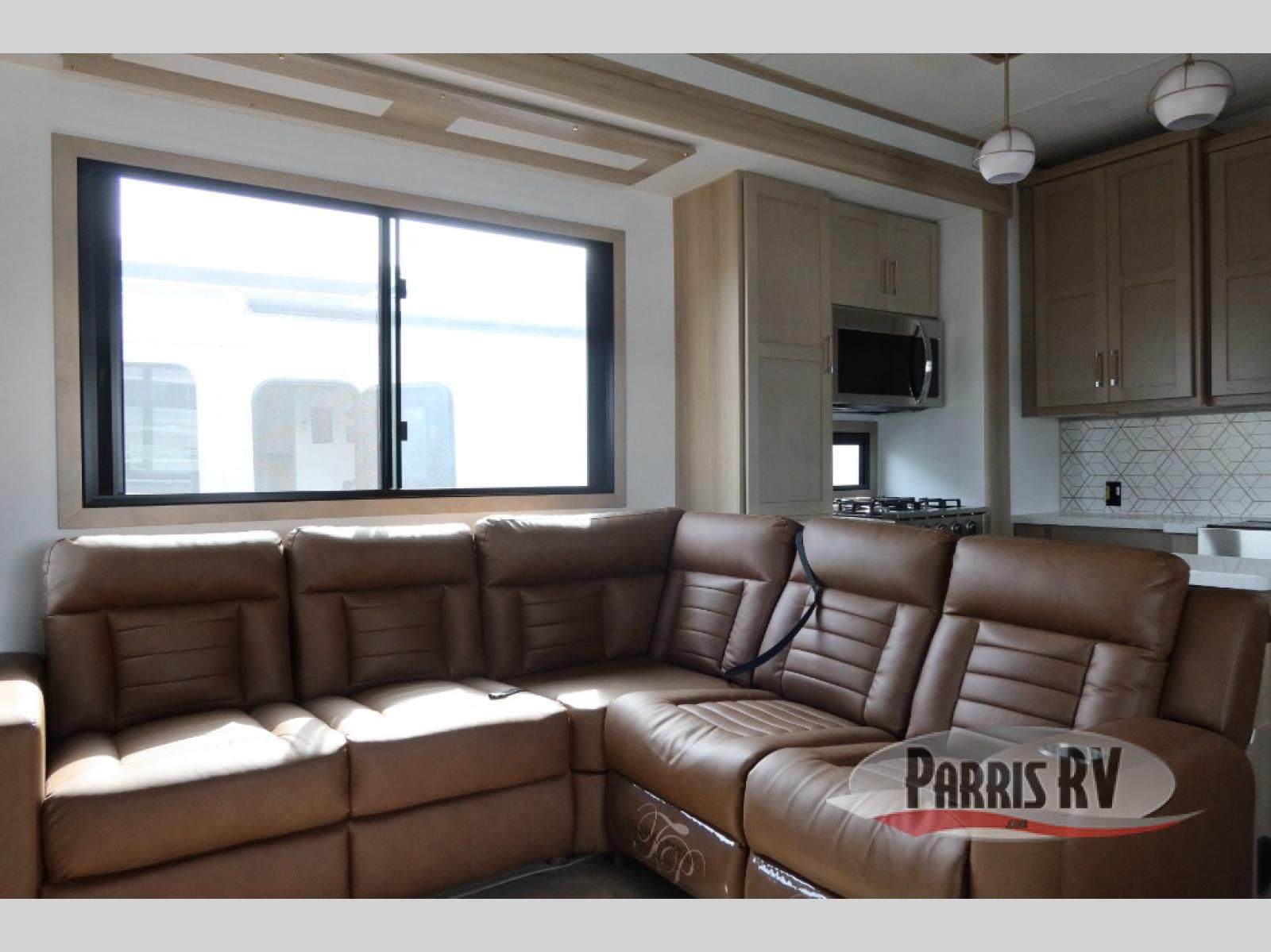 The whole family will love camping in this fifth wheel toy hauler! The front private bedroom has a king bed slide for more interior space, a Smart LED TV, a front large wardrobe, plus washer and dryer prep. Freshen up each morning in the full bathroom with the fiberglass one-piece shower then head to the kitchen to fry up some eggs on the four-burner range and bake some cinnamon rolls in the 24" stainless steel oven. Grab a cold cup of orange juice from the 20-cu. ft. 12-volt refrigerator and enjoy it along with the eggs at the dinette table or in the 15' garage on one of the dual opposing sofas with cupholders. The L-shaped hide-a-bed sofa is conveniently across from the entertainment center with a 50" Smart LED TV and fireplace. As you head into the 15' garage area, you will notice a loft with a twin bed, a queen bed above the opposing sofas, Adjust-A-Track frame welded tie downs, and one of the dual entry doors to the unit!