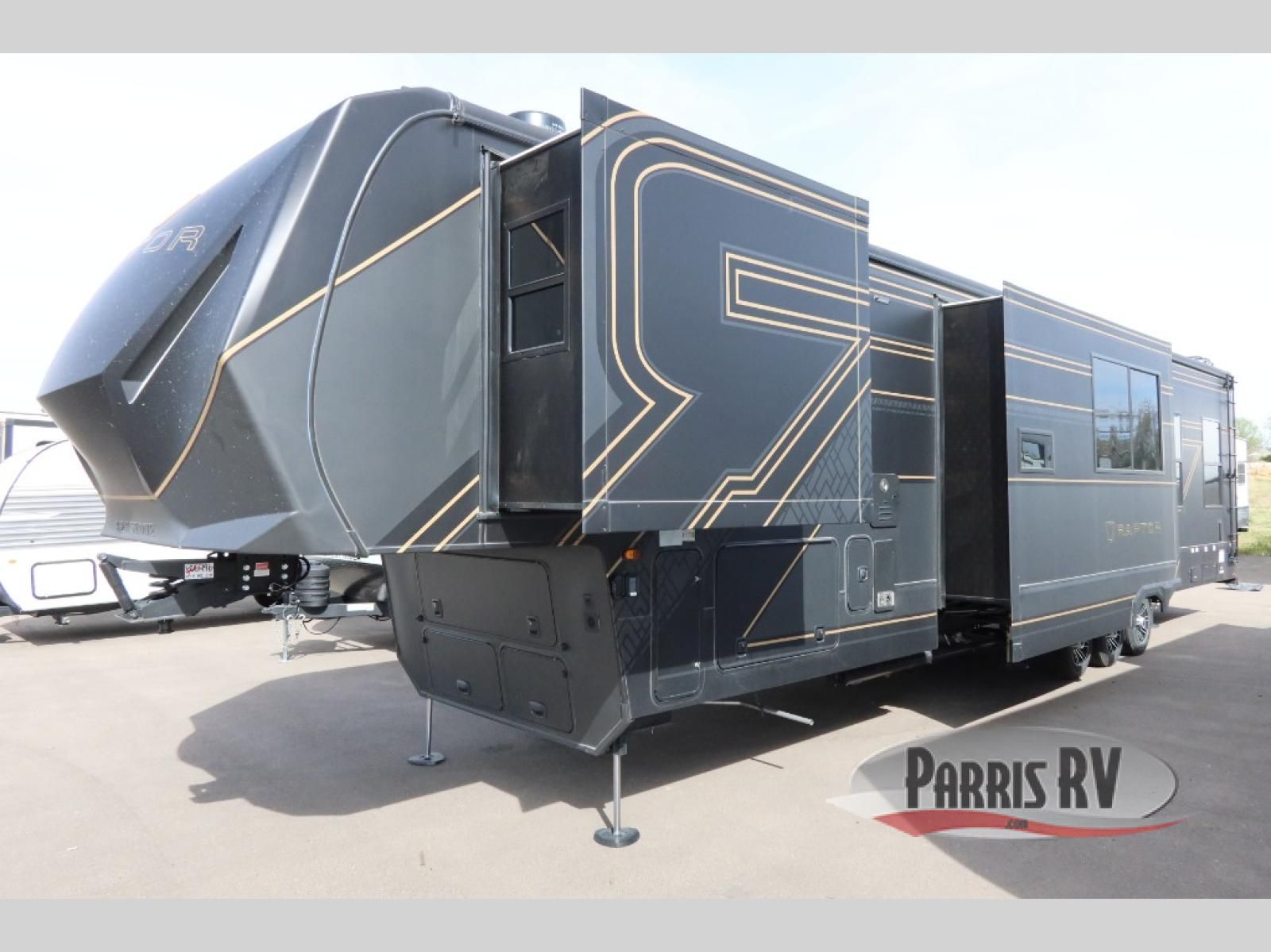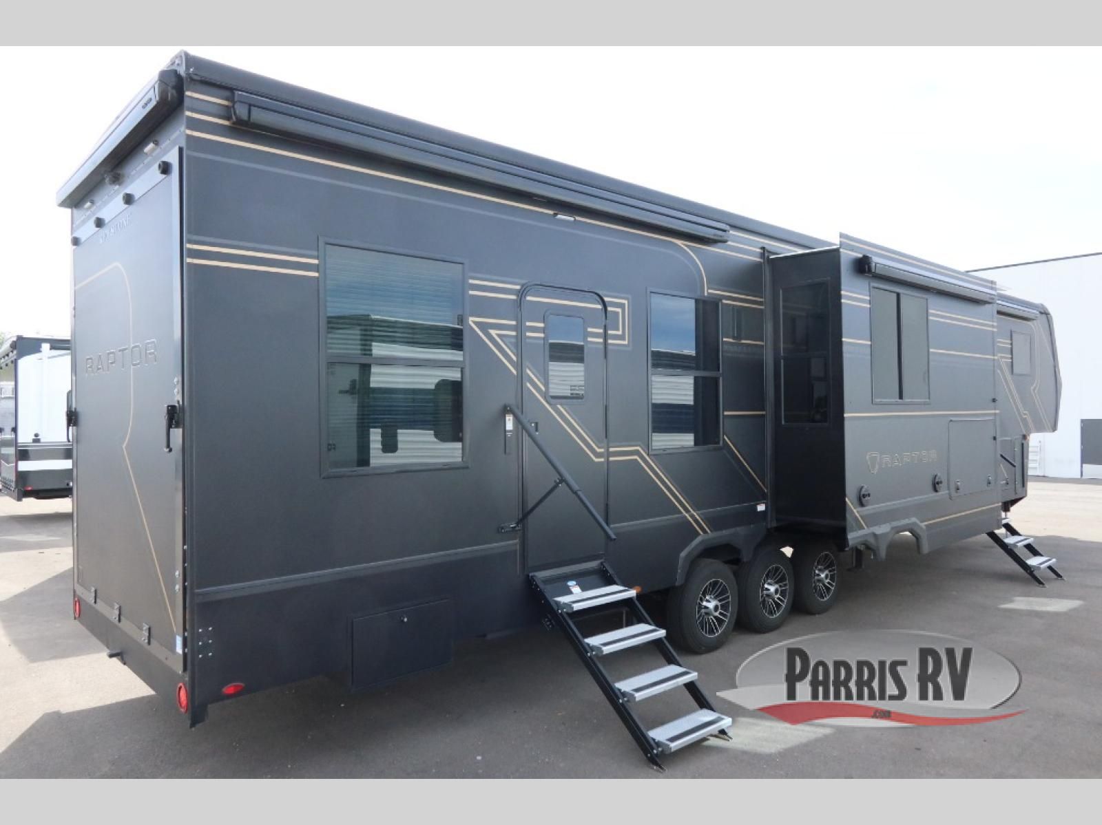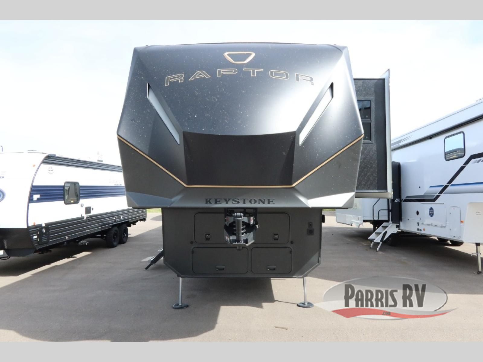 Experience a breath of fresh air with one of these Keystone RV Raptor fifth wheel toy haulers! Their rugged construction consists of a one-piece Alpha Super Flex TPO roof membrane, Dyna Span floor decking, and 5,000 lb. frame-welded tie- downs to keep your toys in place as you travel. Some unexpected conveniences you will appreciate include an Omni-Chill A/C system to keep you cool on those hot summer days, a Furrion backup camera, MaxTurnTM technology with a HeluxTM pin box, and a Generation 3 iN-Command smart automation system with Global Connect to make life easier. There is also designer style vinyl flooring throughout, along with new ceiling treatment with LED accent lighting, beach wood and white cabinetry, and many more interior comforts!