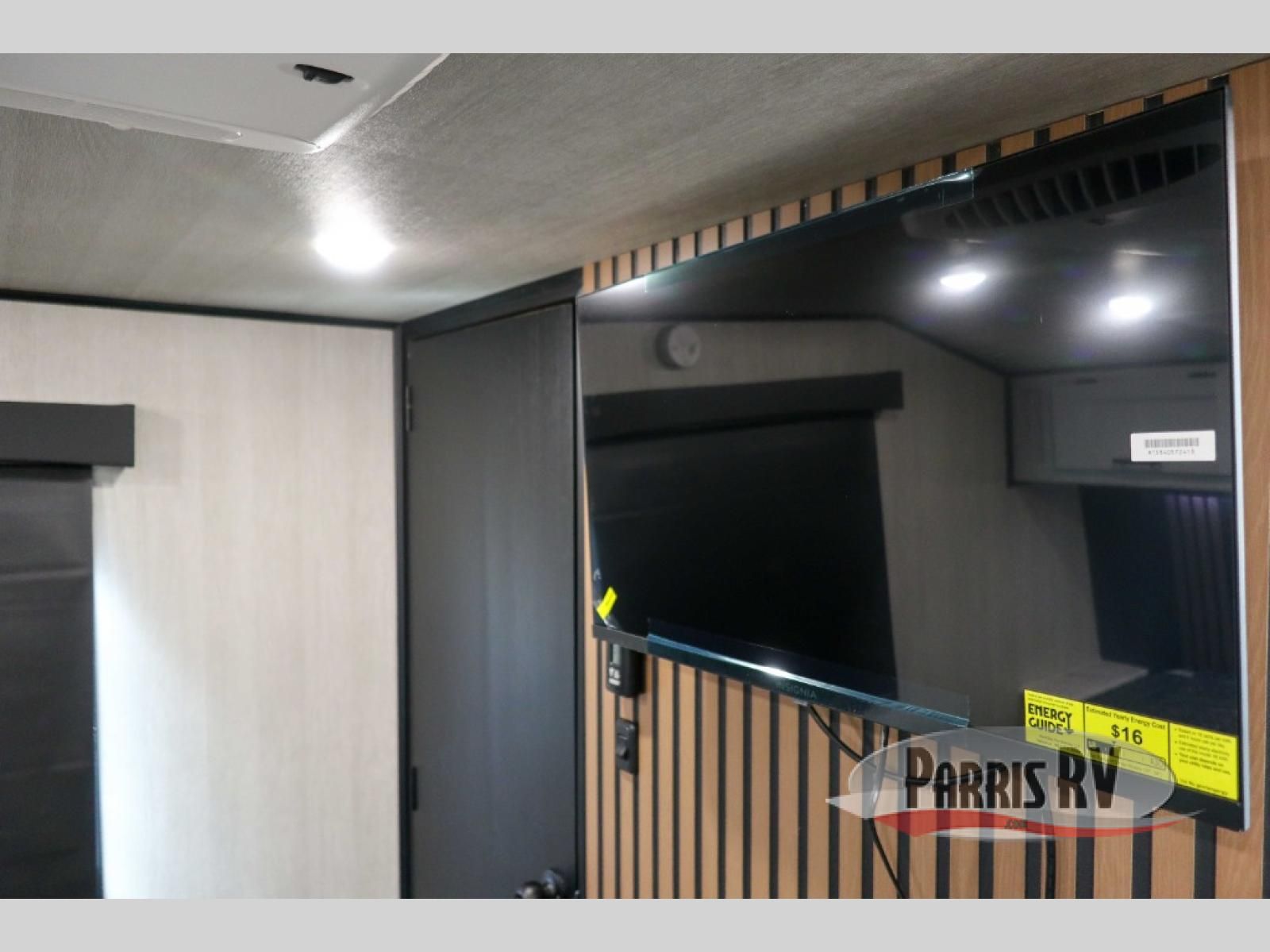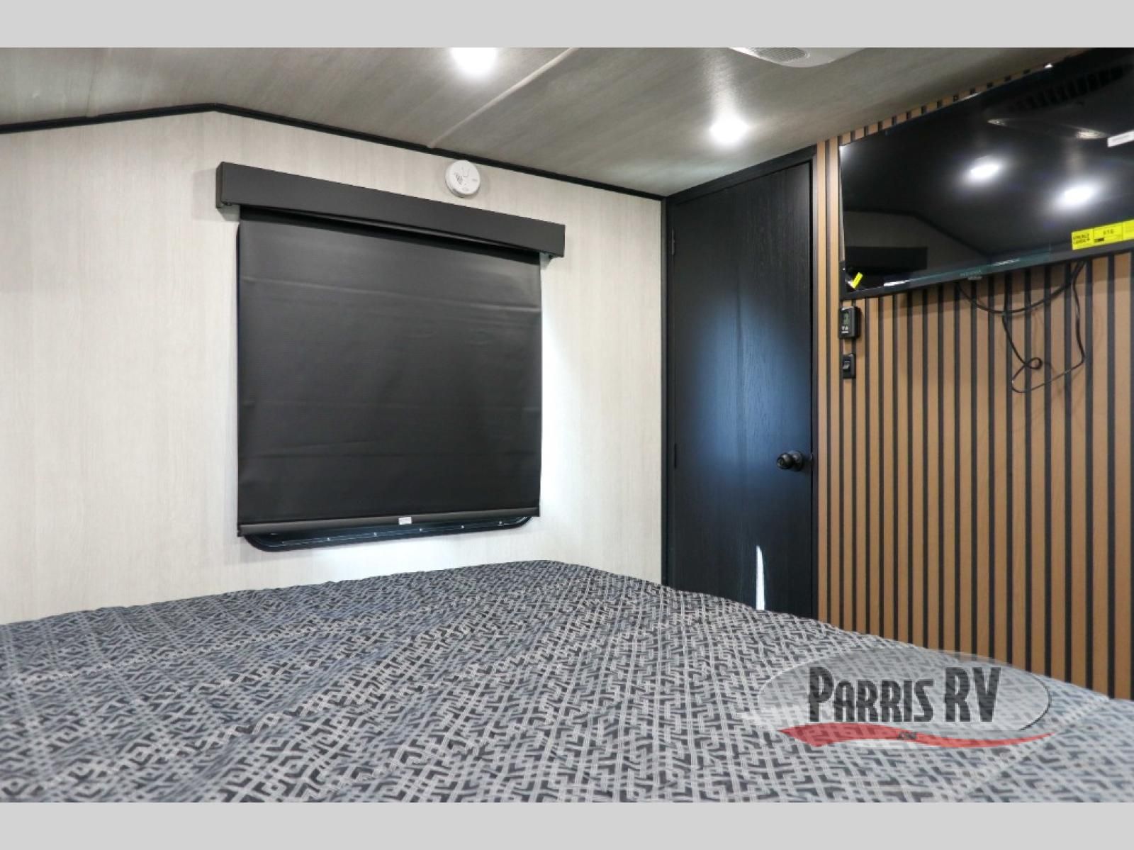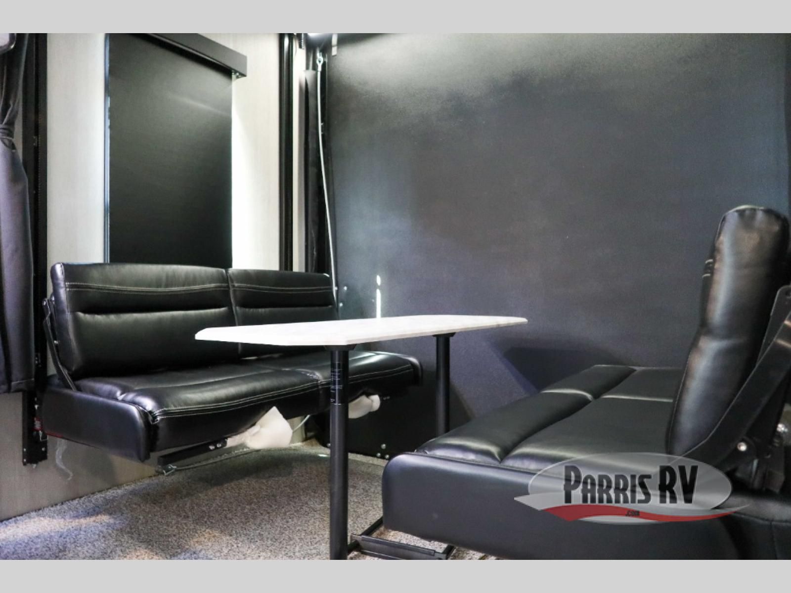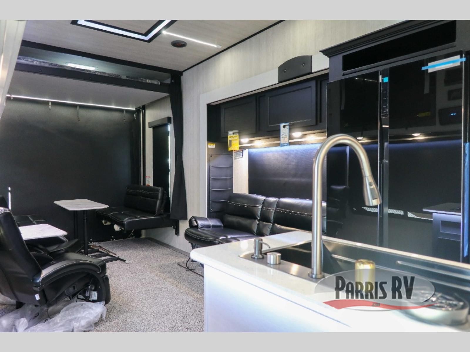 If you want to get away for the weekend with your toys, get away with this Vortex toy hauler. It has a 16' 4" garage to keep your ATVs and dirt bikes secure while you travel. You can accommodate a group of six for sleeping with the king-size bed, power queen bunk and sofas, and everyone will benefit from a hot meal prepared on the three-burner range in the kitchen. You can even keep your cold items fresh by storing them in the refrigerator. The dual-entry bathroom has a door within the main hallway, but it also has a private entrance that leads into the bedroom.