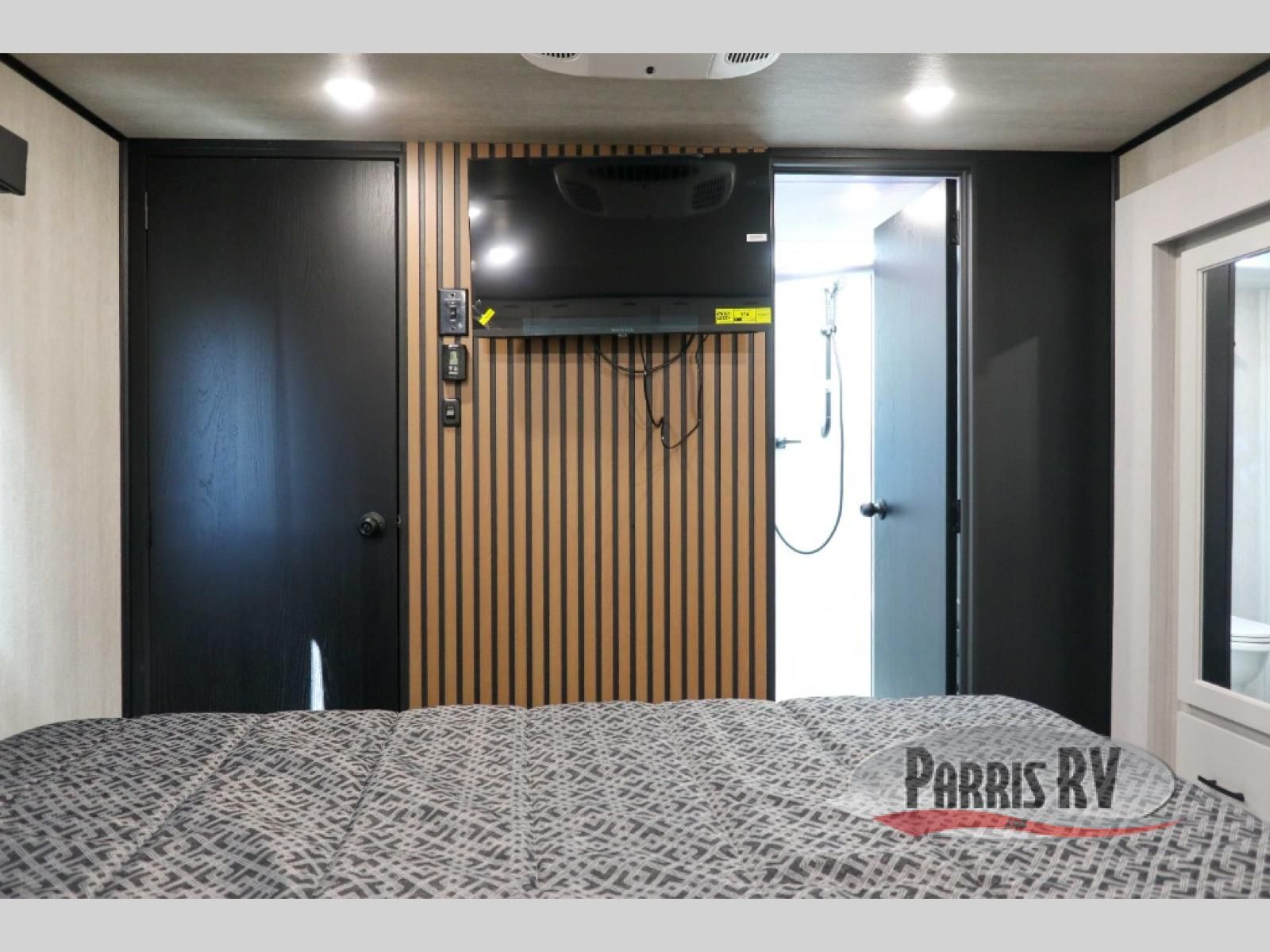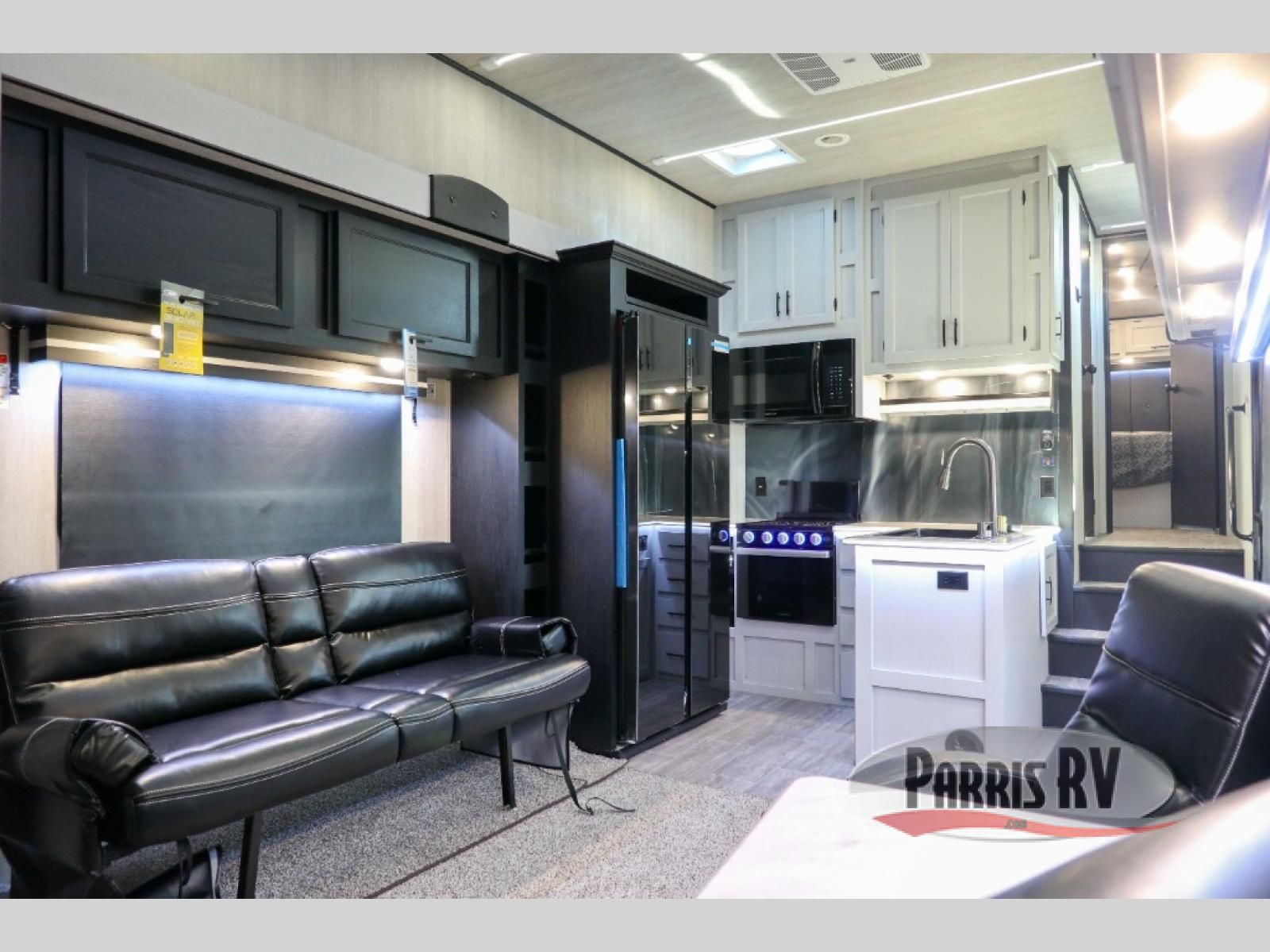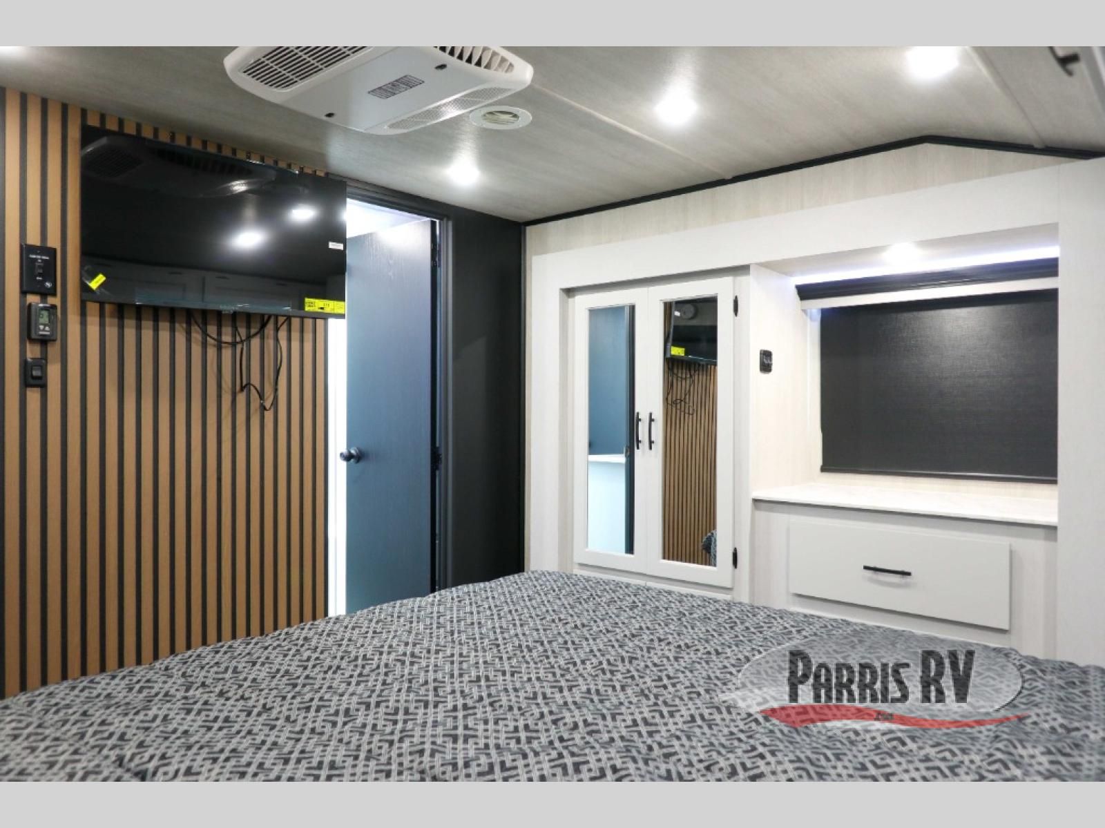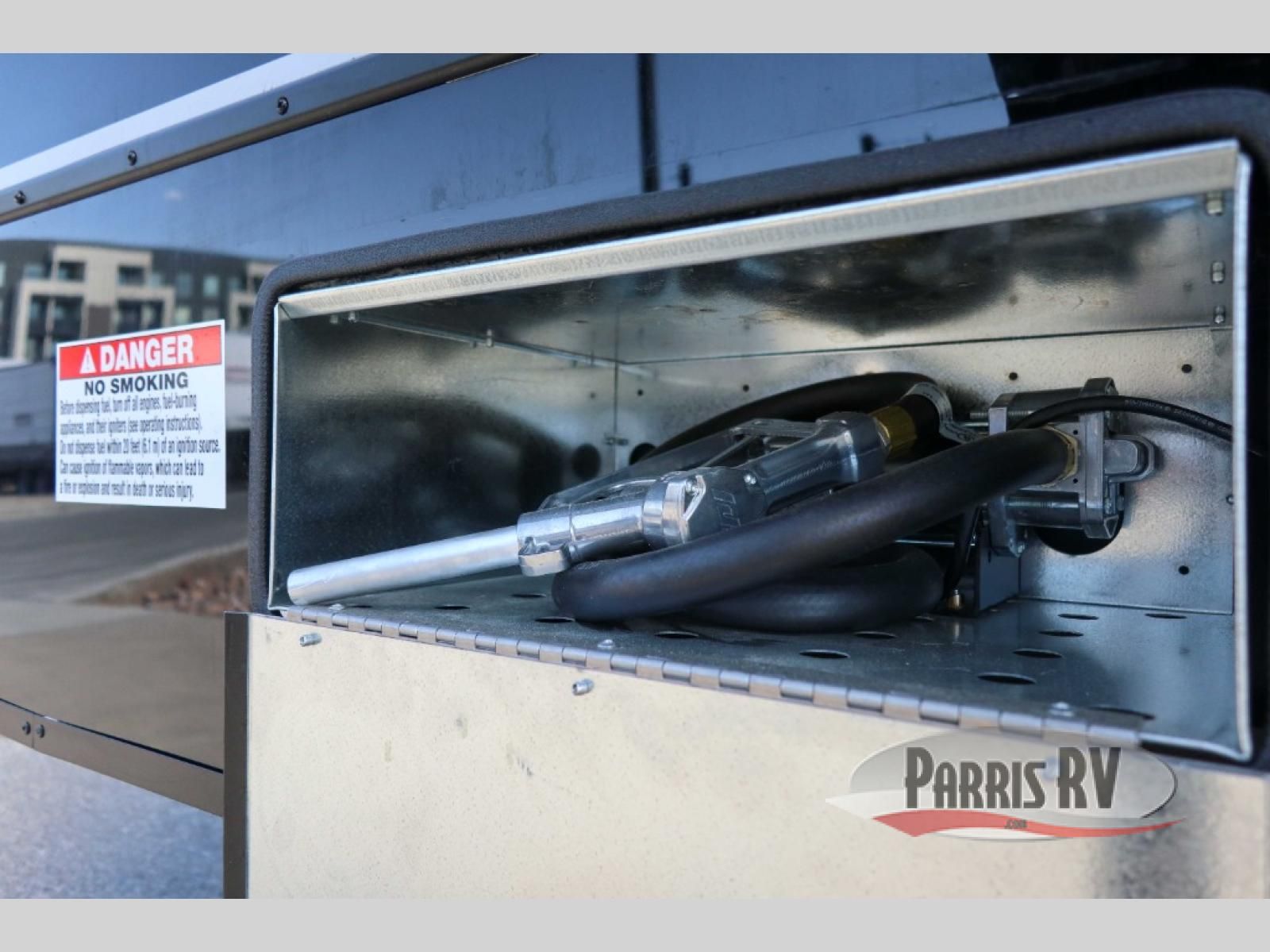 If you want to get away for the weekend with your toys, get away with this Vortex toy hauler. It has a 16' 4" garage to keep your ATVs and dirt bikes secure while you travel. You can accommodate a group of six for sleeping with the king-size bed, power queen bunk and sofas, and everyone will benefit from a hot meal prepared on the three-burner range in the kitchen. You can even keep your cold items fresh by storing them in the refrigerator. The dual-entry bathroom has a door within the main hallway, but it also has a private entrance that leads into the bedroom.