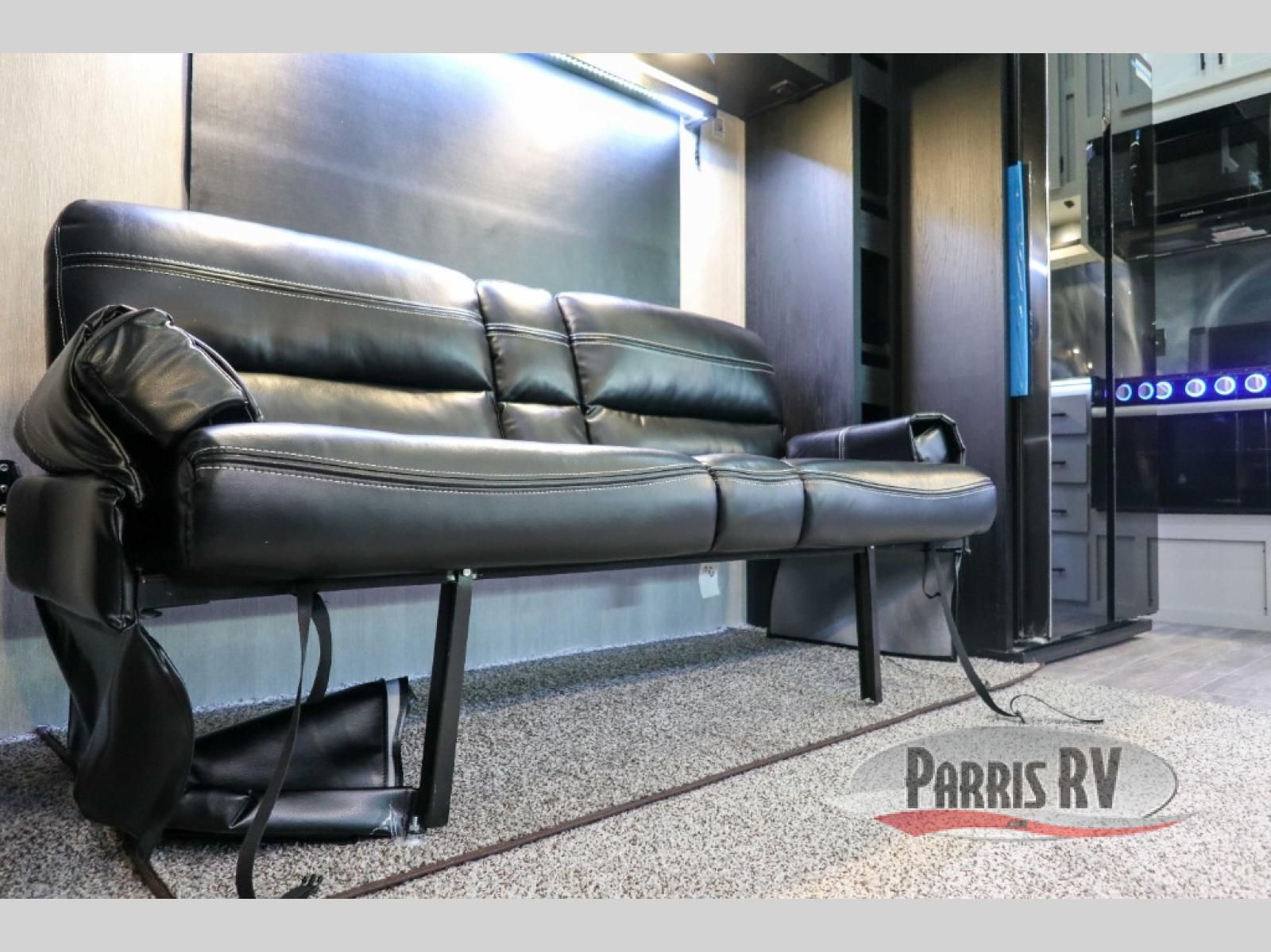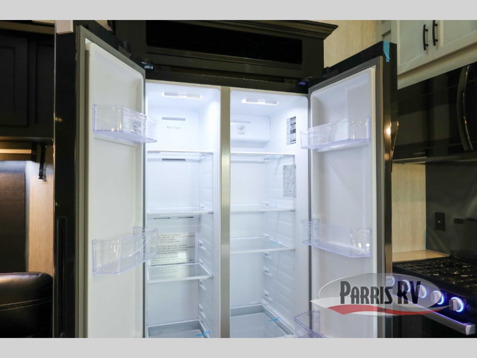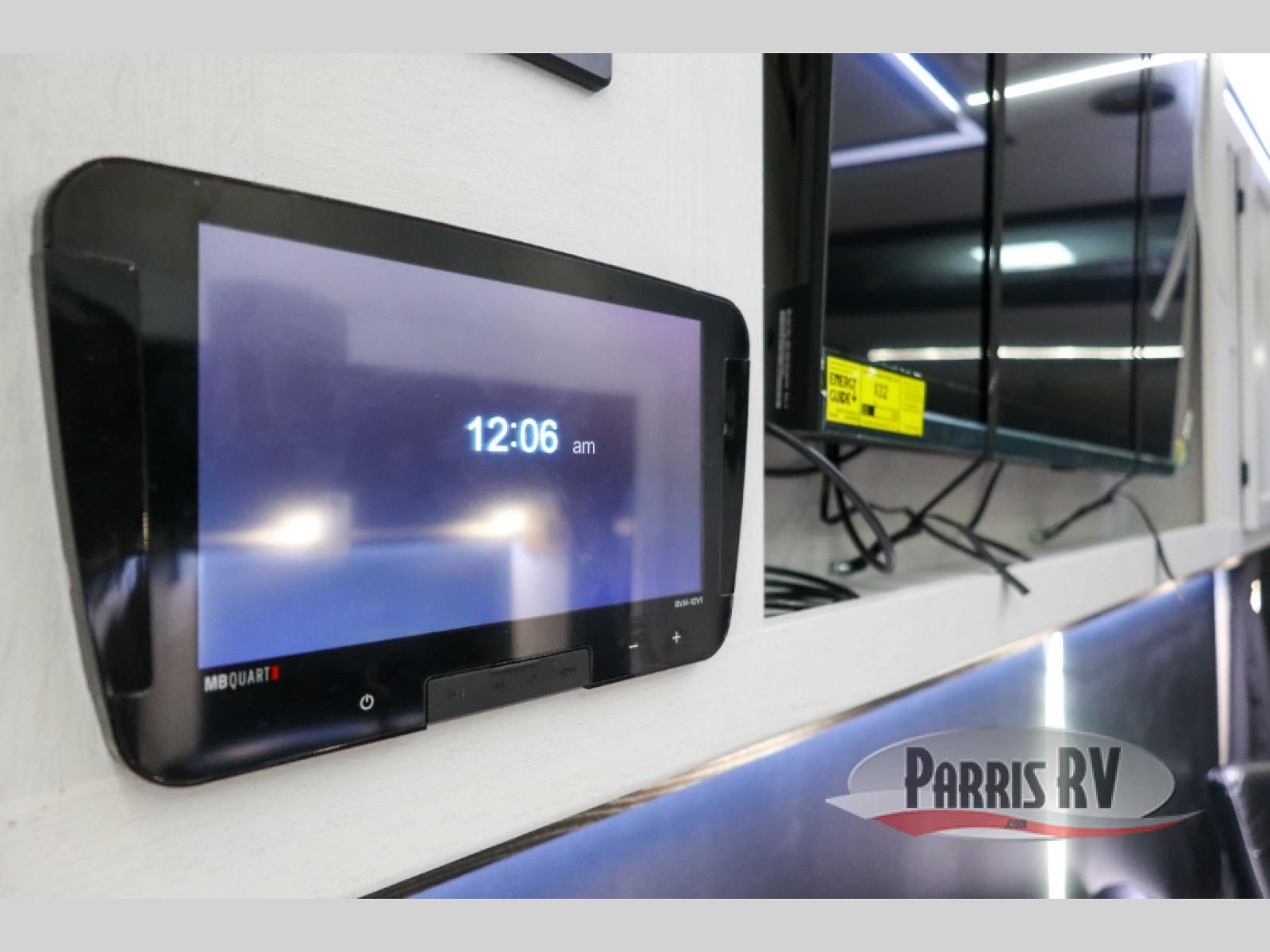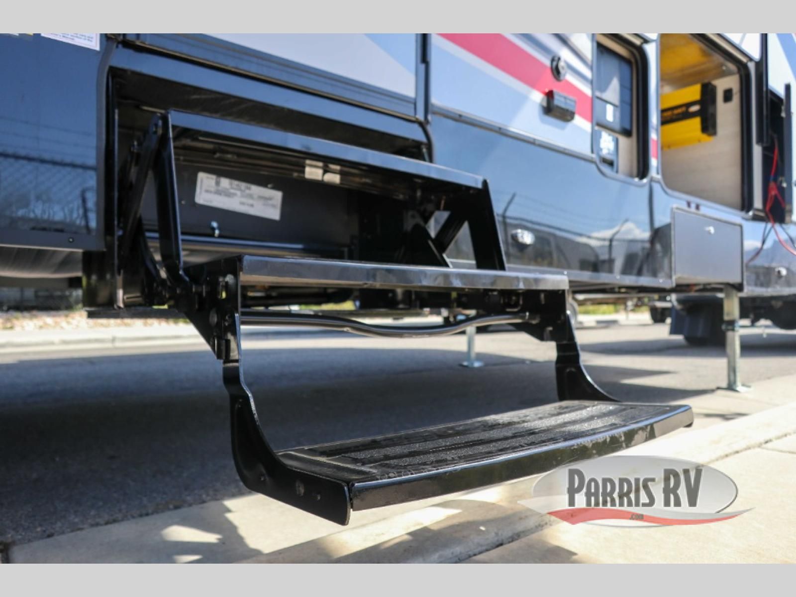 If you want to get away for the weekend with your toys, get away with this Vortex toy hauler. It has a 16' 4" garage to keep your ATVs and dirt bikes secure while you travel. You can accommodate a group of six for sleeping with the king-size bed, power queen bunk and sofas, and everyone will benefit from a hot meal prepared on the three-burner range in the kitchen. You can even keep your cold items fresh by storing them in the refrigerator. The dual-entry bathroom has a door within the main hallway, but it also has a private entrance that leads into the bedroom.