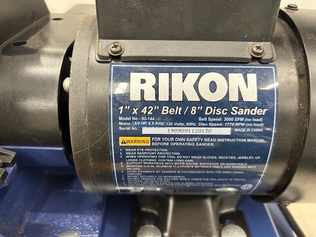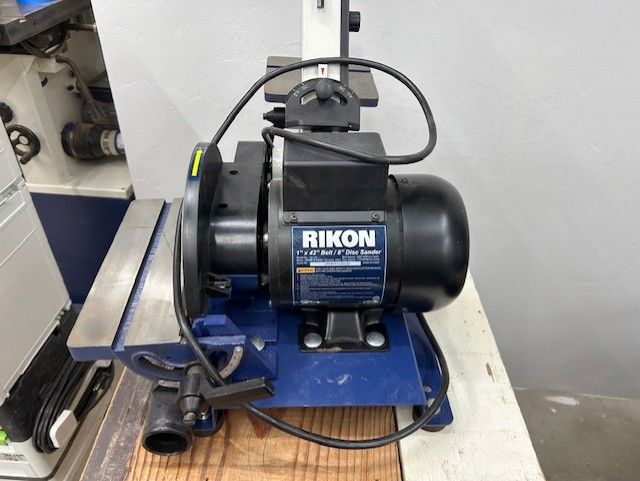VenmoFor sale is my Rikon 1" x 42" Belt/ 8" Disc Sander. This is Rikon 50-144. Both of the tables/support are cast iron. This has the 3/4 hp motor and runs the belt at 3000 SFM, and the disc at 1770 RPM. I bought this new several years ago for a project I was working on at the time, and have only used it a few times since. Other than that it has just sat on a shelf. It is still in great condition. It did get a little water dripped on the belt table while it was in storage when we were redoing our garage. There was some minor surface rust there that has been cleaned off and waxed. This is visible in the last picture. Everything runs and works like it is supposed to.
