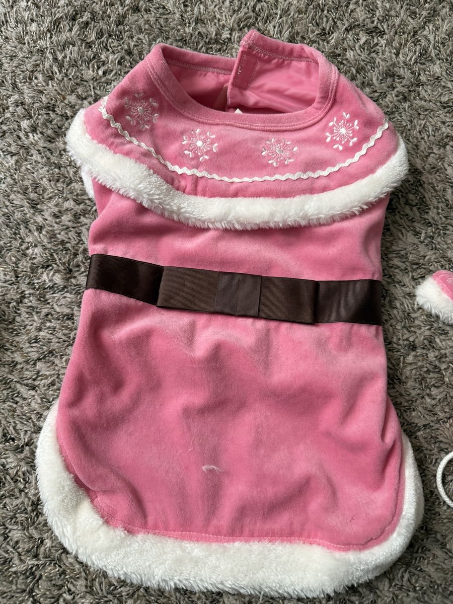ApplePayChristmas theme Chalk rose pink with faux fur and brown belt 2 pet set medium dog dress and small puppy or teacup dog or cat hat and collar