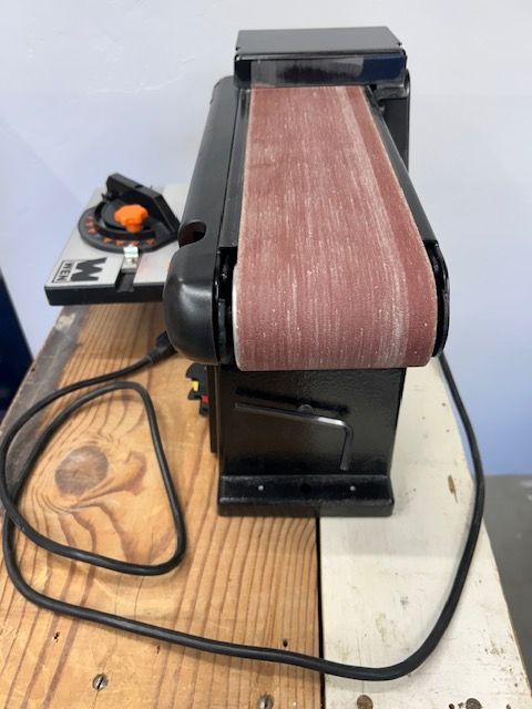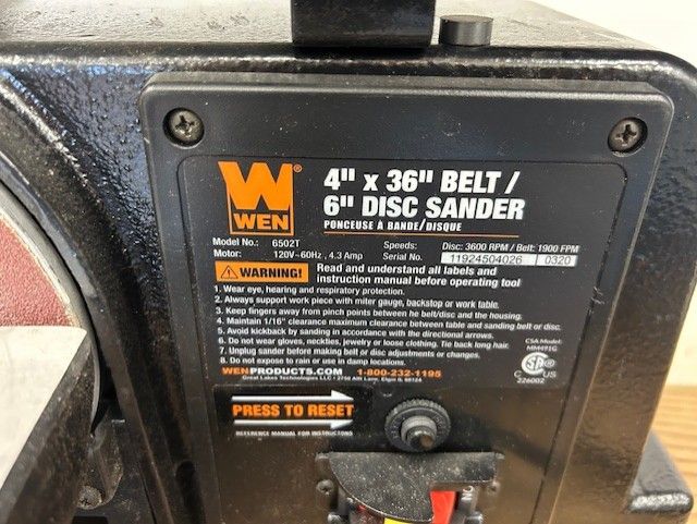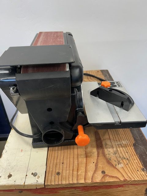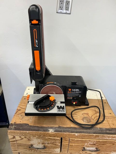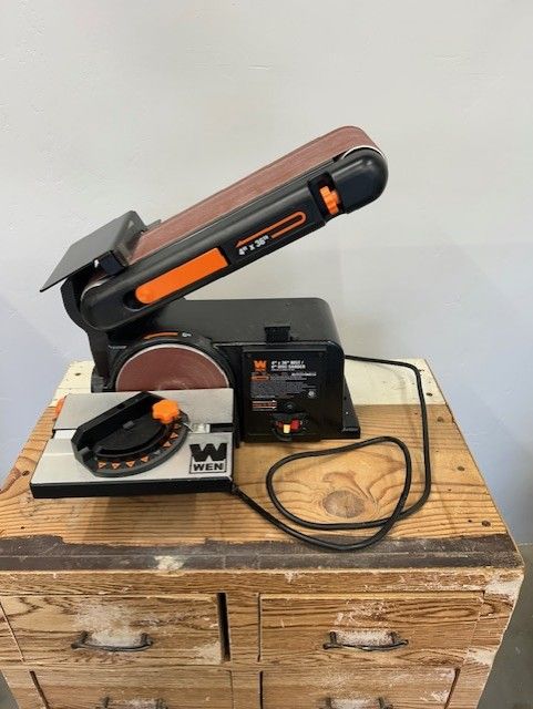 VenmoFor sale is my WEN 4" x 36" Belt / 6" Disc Sander. WEN 6502T. This has the 4.3 amp motor that moves the disc at 3600 RPM and the belt at 1900 fpm. The belt easily adjusts anywhere from 0 to 90 degrees, and can be held at any position in between. It has a sturdy cast iron base that keeps it on the bench during use. It has a quick release lever that makes changing belts easy (although I haven't used it enough to have to change the belt). This is a great little sander that is in great shape. I bought this new several years ago for a project, and haven't used it as often as I hoped I would, so it has mainly sat on a shelf.