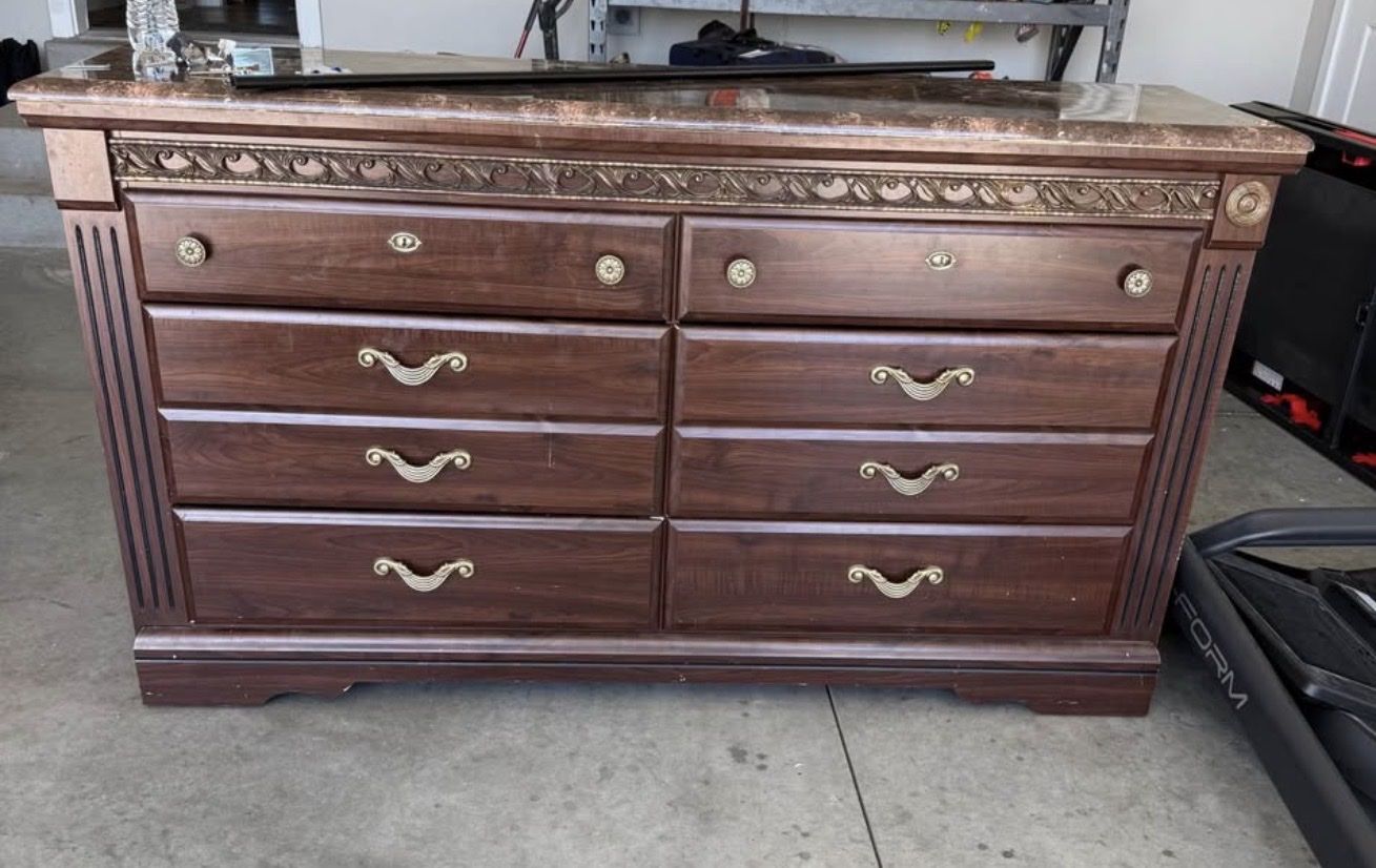 Dresser with mirror and bed frame. I don’t have pictures of the bed frame. Has couple scratches. $200. Is at Smithfield