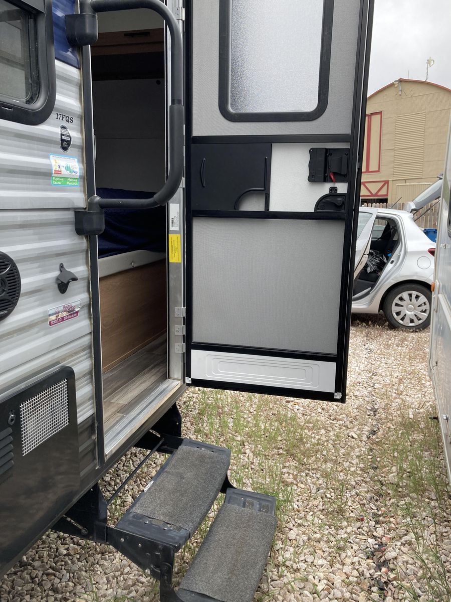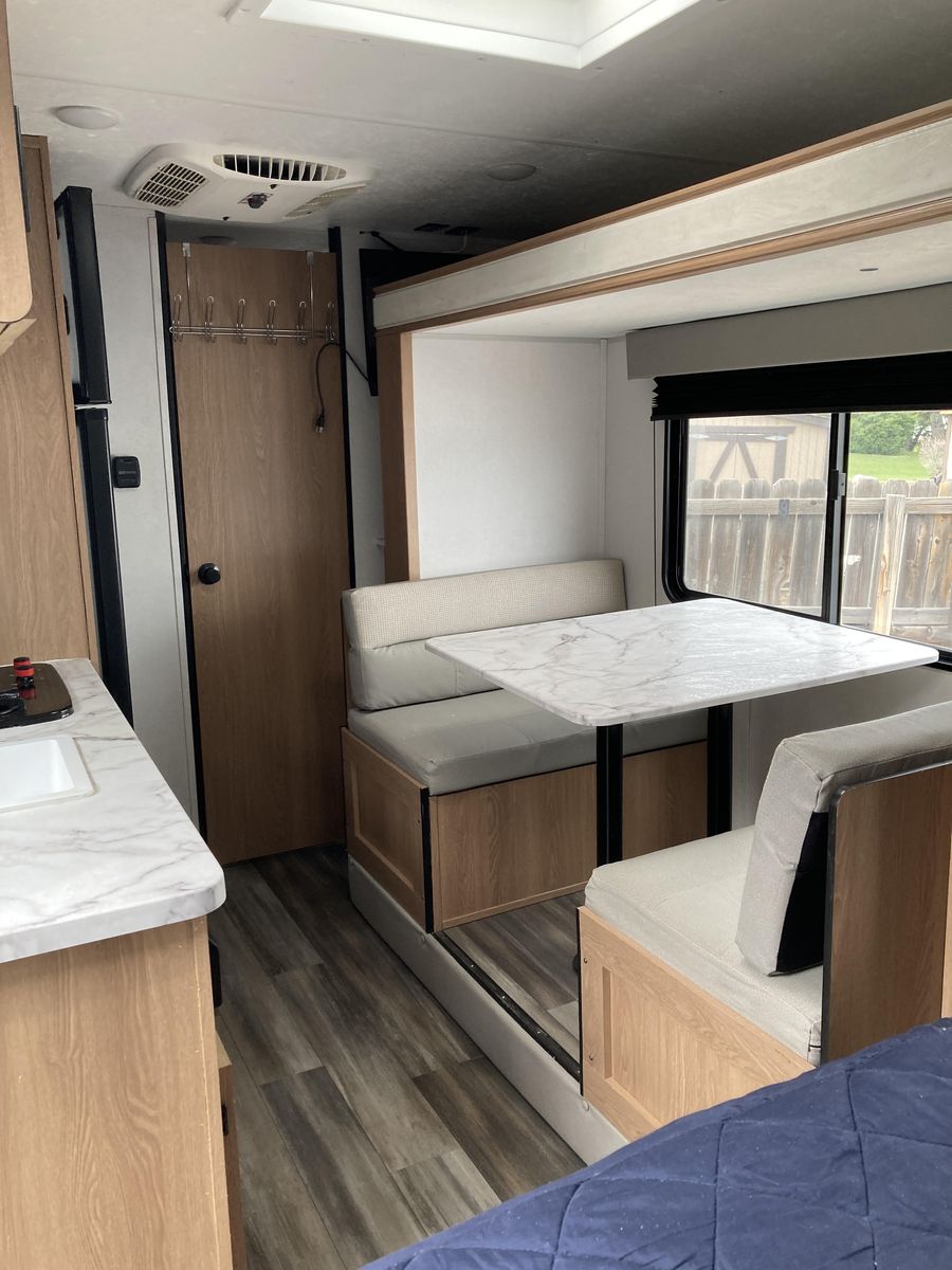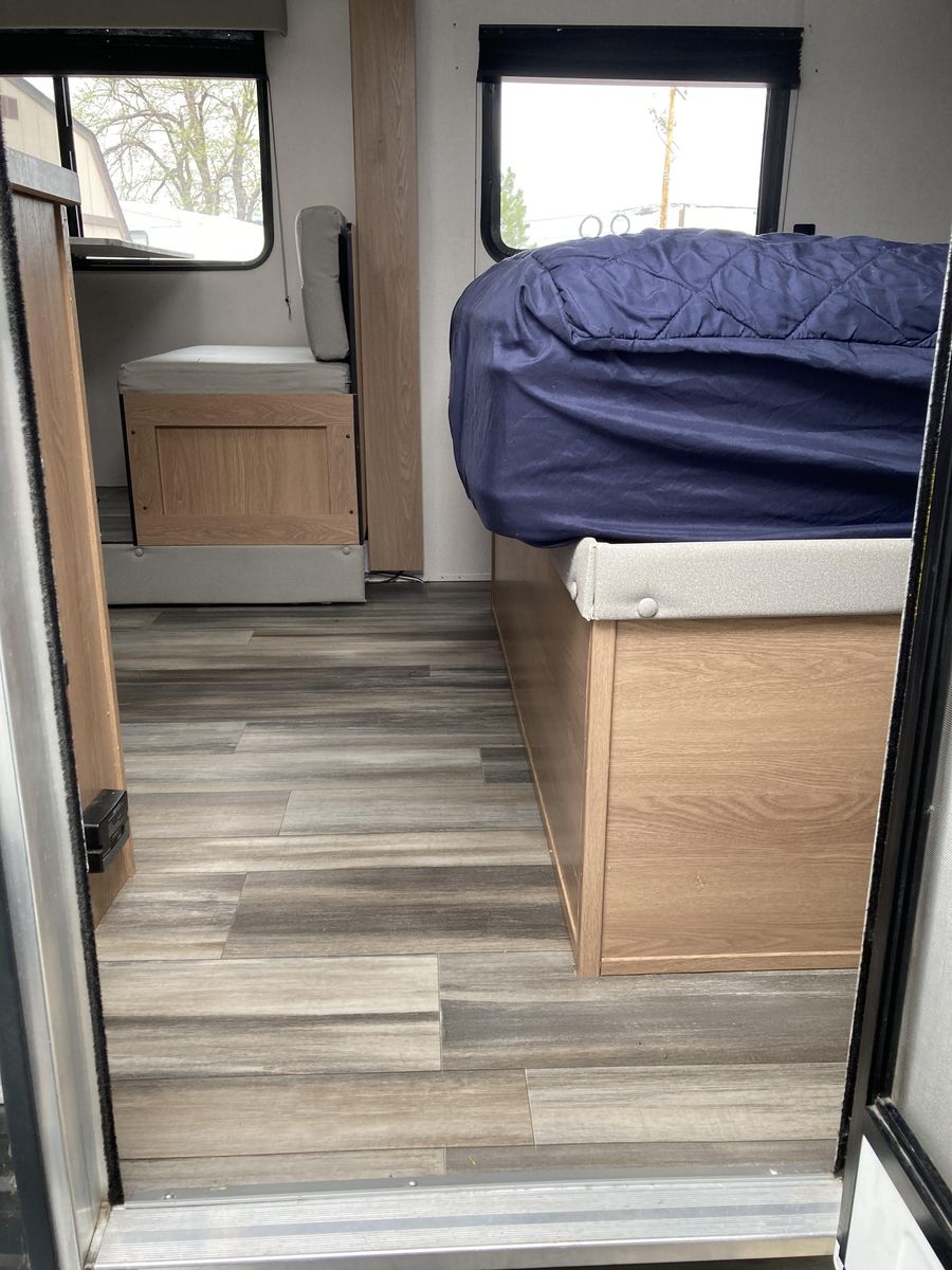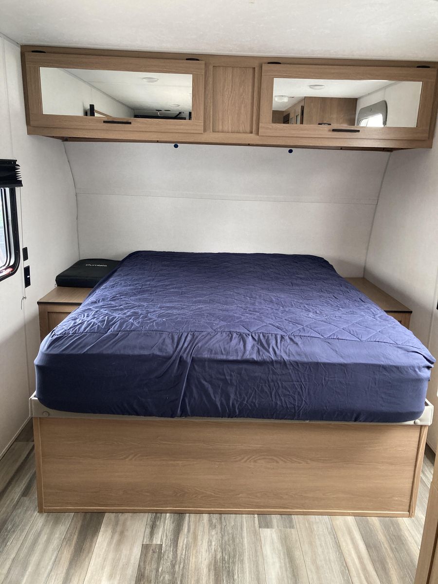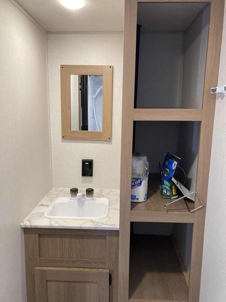Please help us rehome our sweet trailer! We have loved her dearly, but circumstances have changed and it's time for her to find a new family for adventures! Brand new never used tall porcelain toilet, newer queen mattress, only 2000-2500 miles of towing. Never had any trouble from her! She's tiny enough to be pulled by a half-ton truck and she fits perfectly into any campsite, but you'll be surprised at her roomy interior. Bathroom is accessible even with the slide closed.