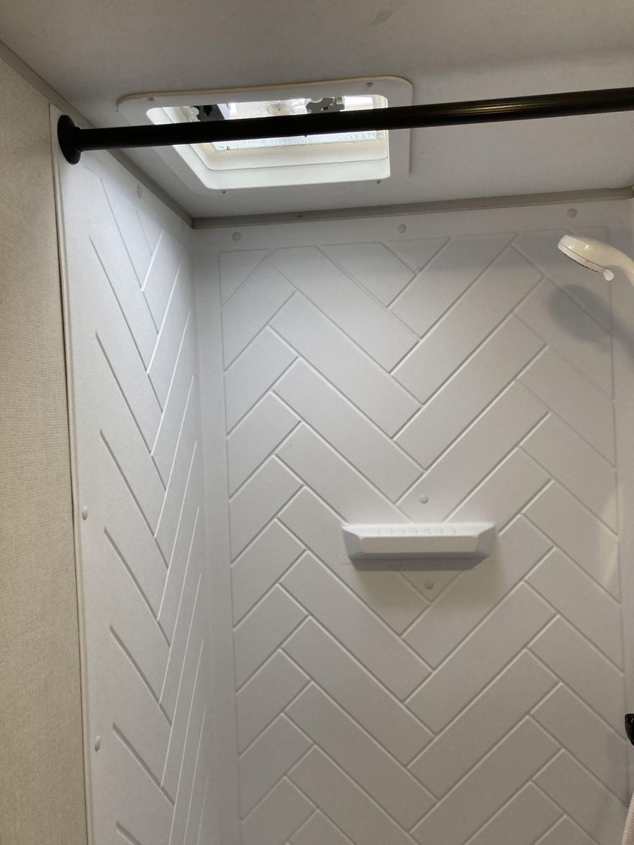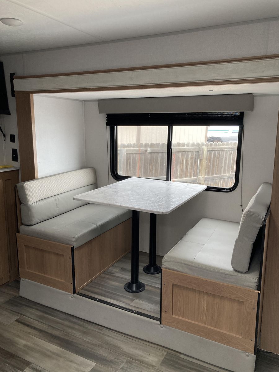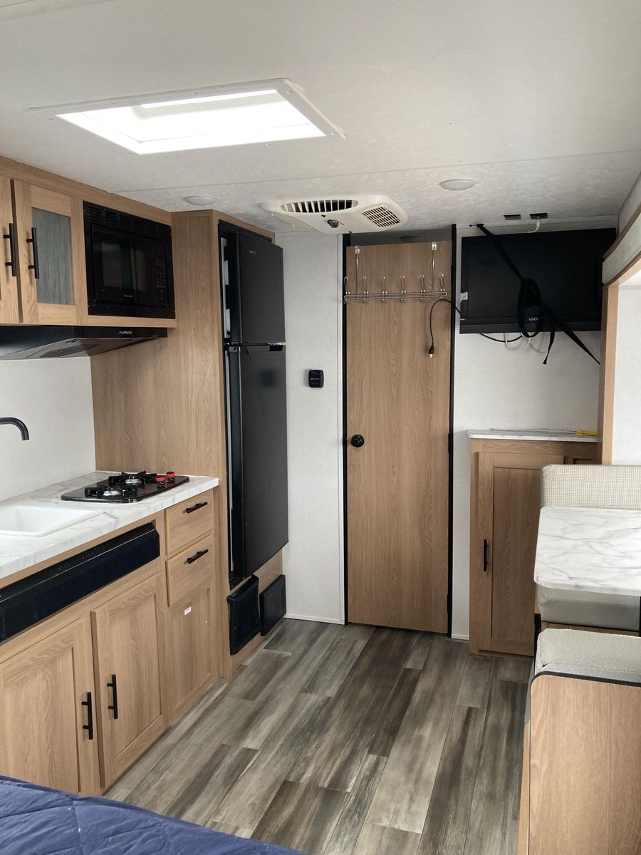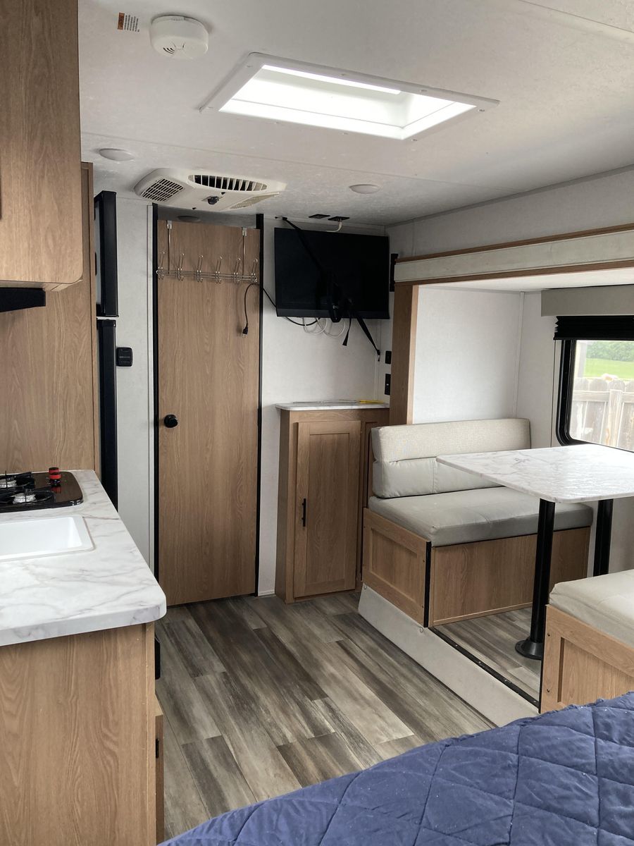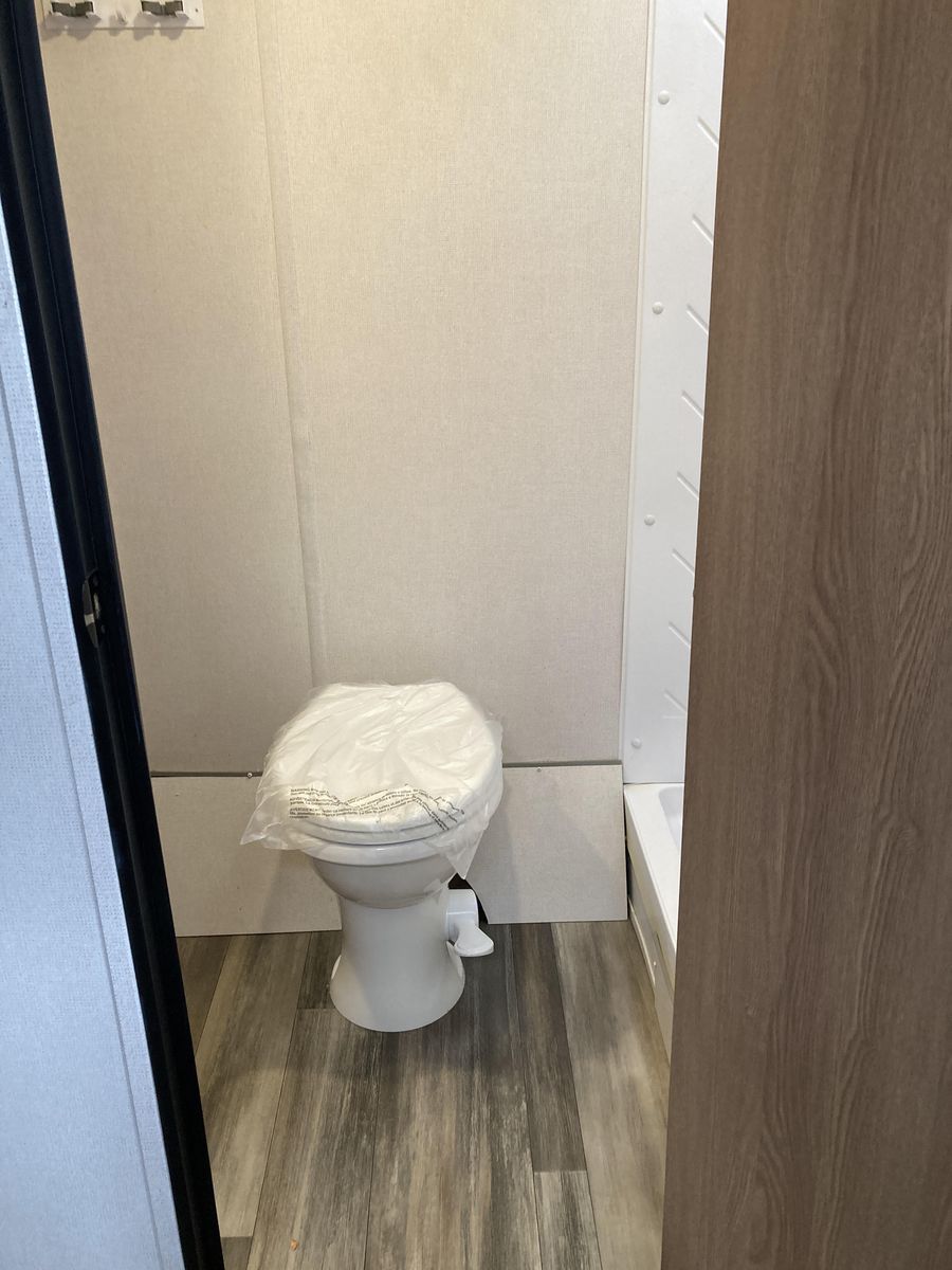 Please help us rehome our sweet trailer! We have loved her dearly, but circumstances have changed and it's time for her to find a new family for adventures! Brand new never used tall porcelain toilet, newer queen mattress, only 2000-2500 miles of towing. Never had any trouble from her! She's tiny enough to be pulled by a half-ton truck and she fits perfectly into any campsite, but you'll be surprised at her roomy interior. Bathroom is accessible even with the slide closed.