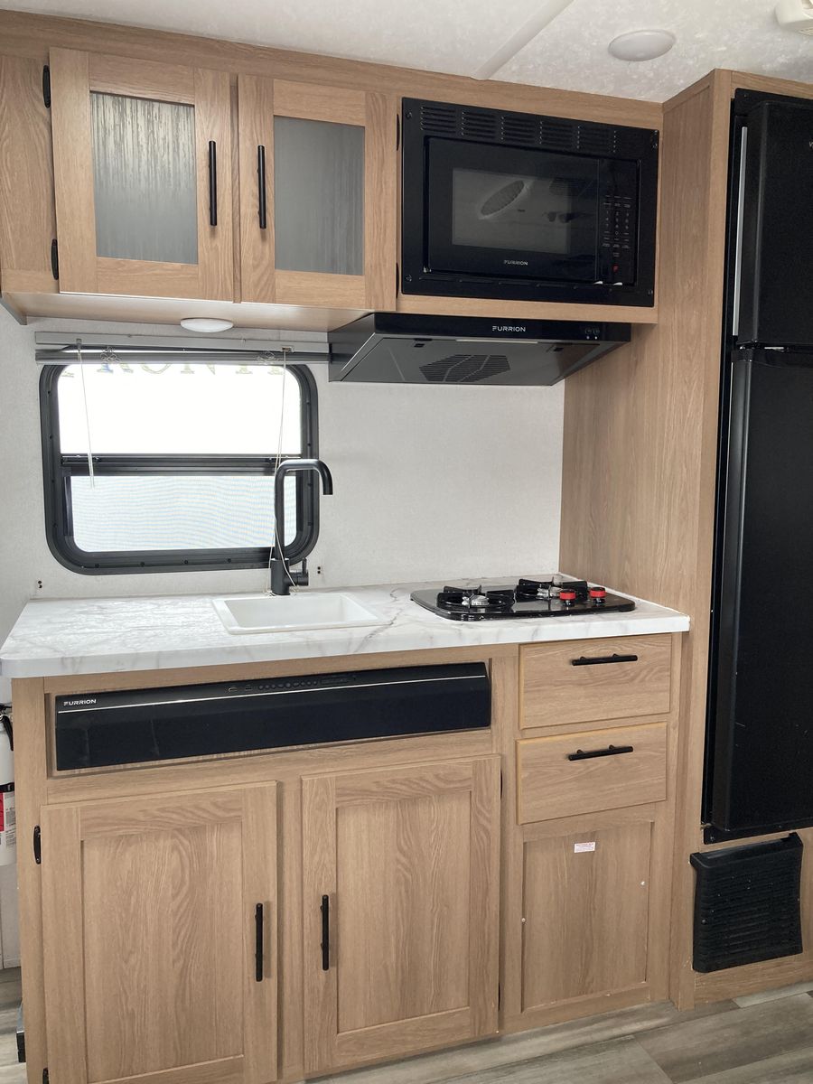 The Avenger 17FQS by Forest River is a compact yet well thought out design that maximizes your interior space! Enjoy a front queen bed with plenty of wardrobe space. The modern kitchen features a two-burner cooktop, 12-volt refrigerator, microwave, and a dinette slide that converts into an extra bed. The large rear bathroom features a shower, sink, and linen closet.