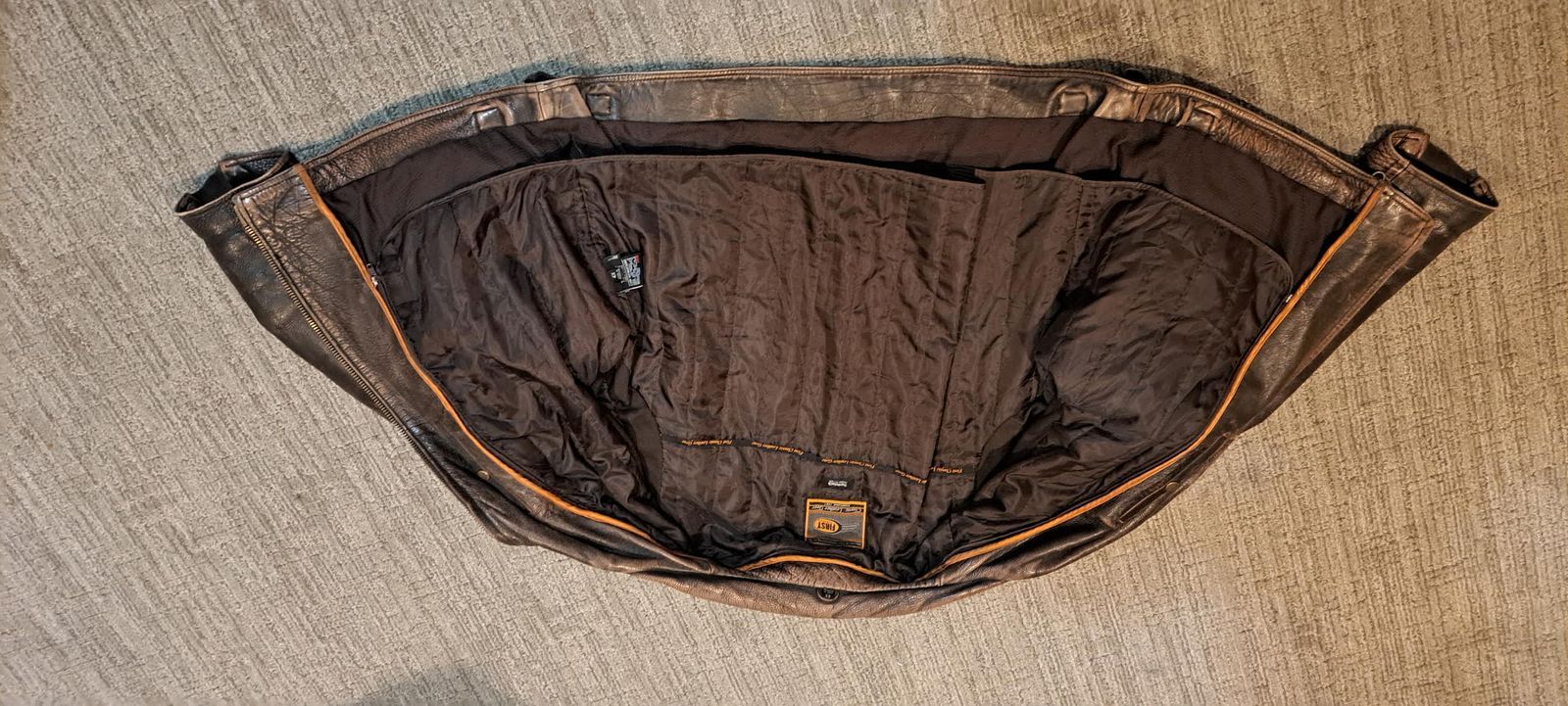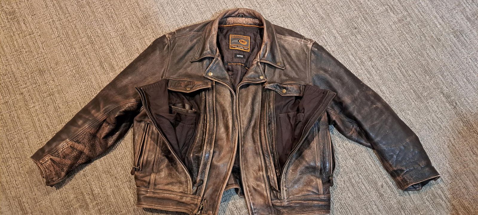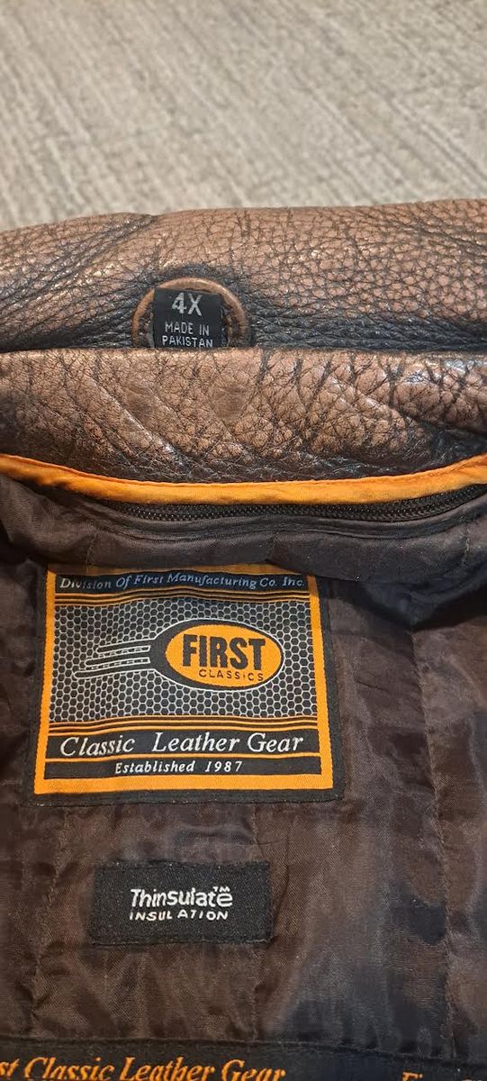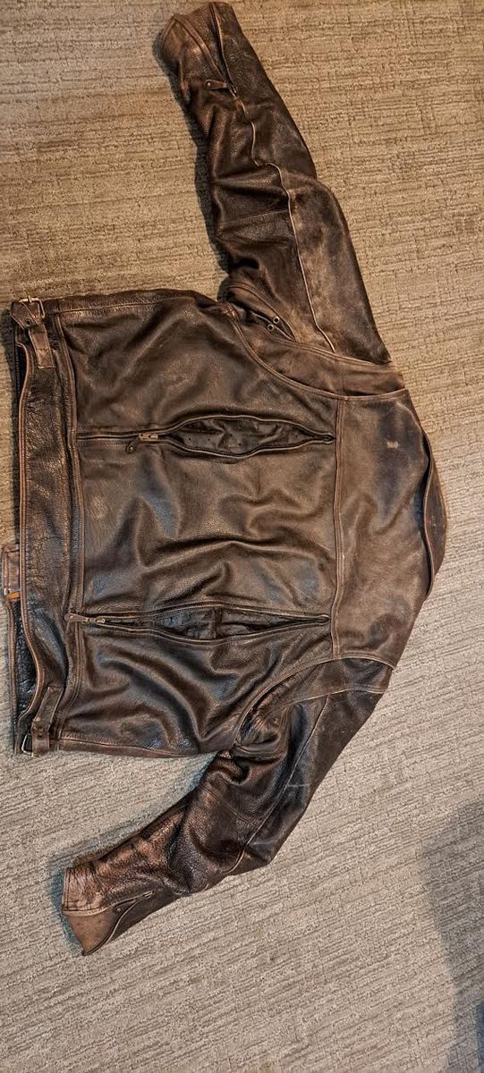 4XL Heavy Leather Jacket with Zip Out Liner. Will fit 6'2" 300+ lbs. Well vented for warm weather. Beautiful, rustic brown in excellent condition.