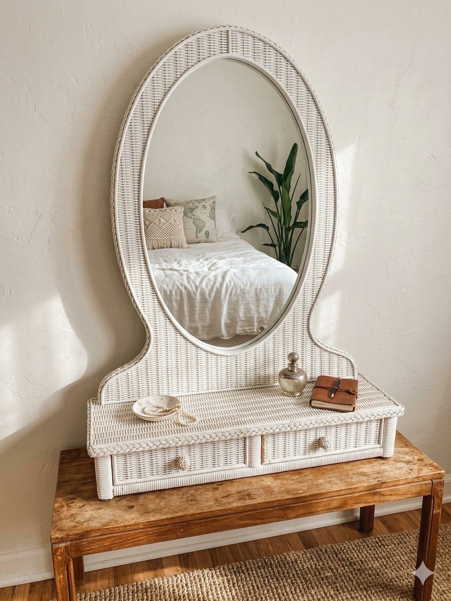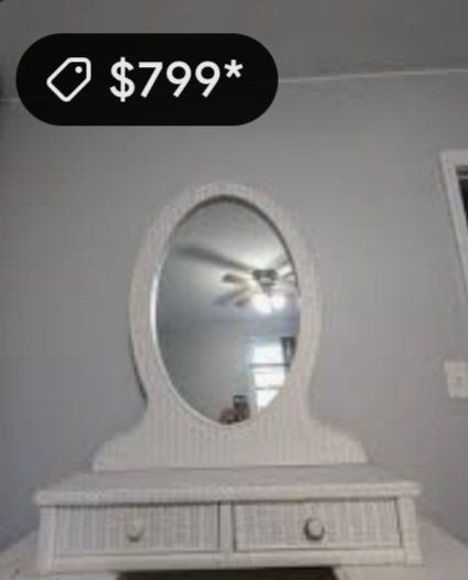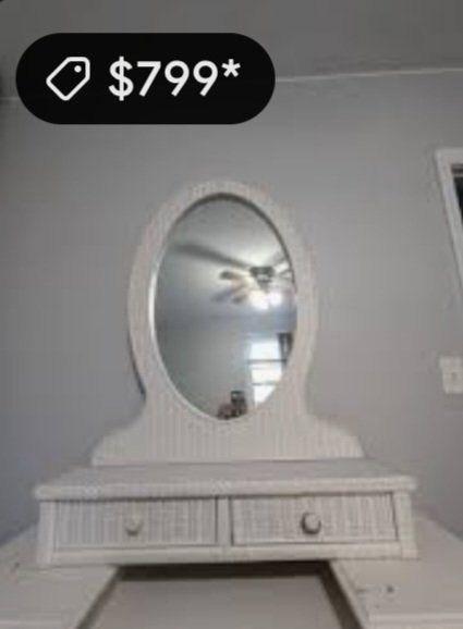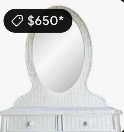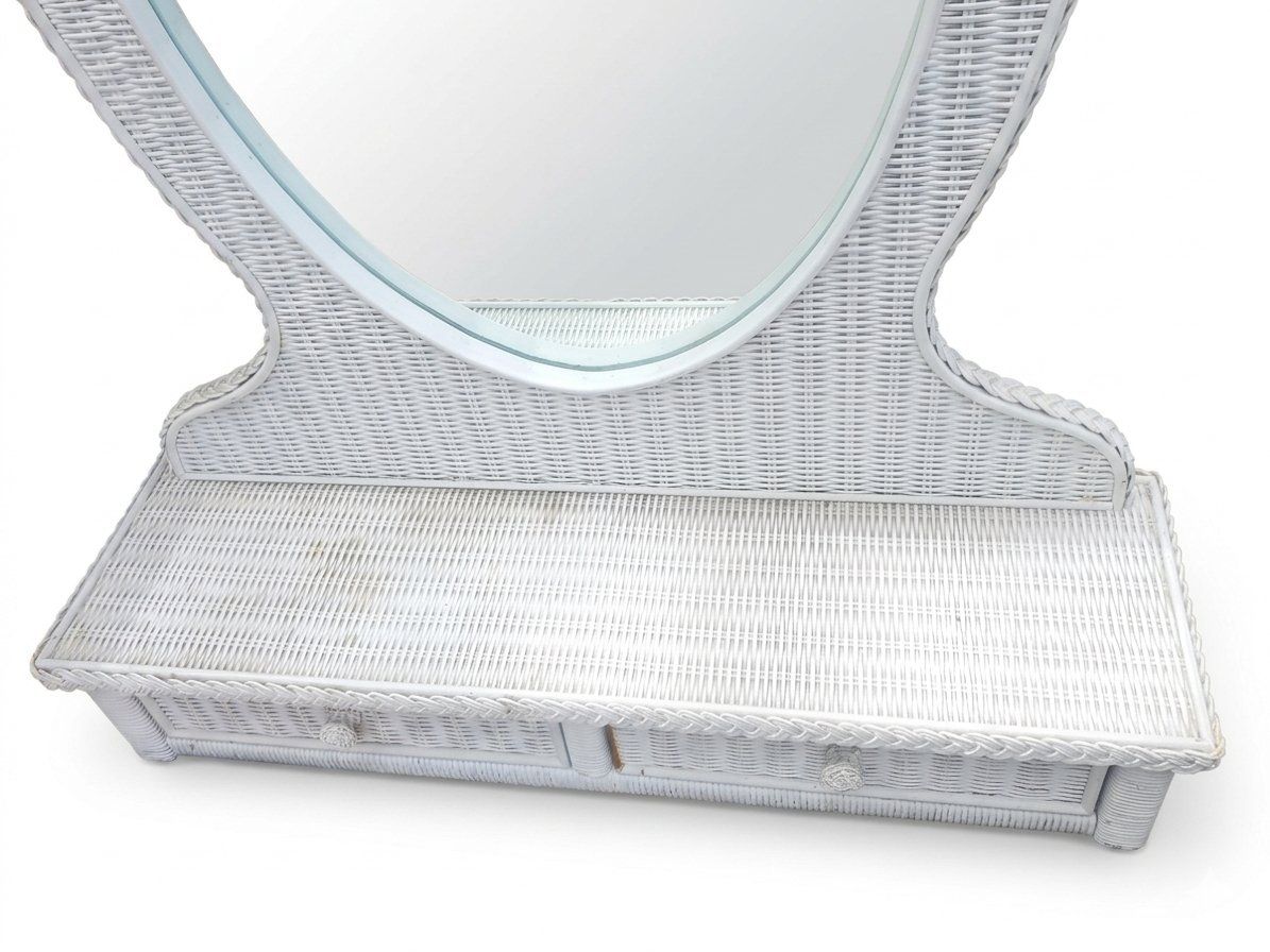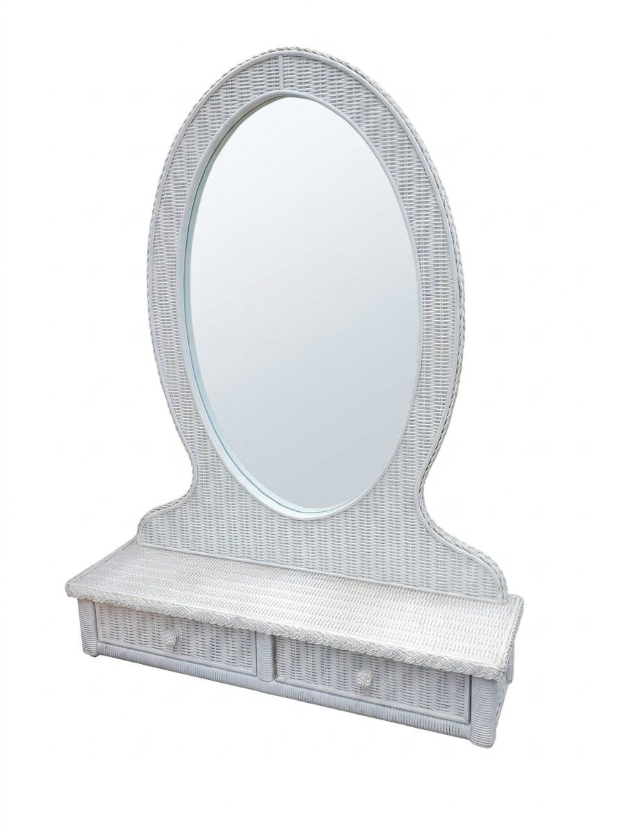 A pretty white wicker large vanity top oval mirror with 2 drawers. This is a perfect piece to sit on top of your own wicker dresser or vanity table. It's such a pretty piece and very substantial. The drawers are perfect to hold for makeup or jewelry
