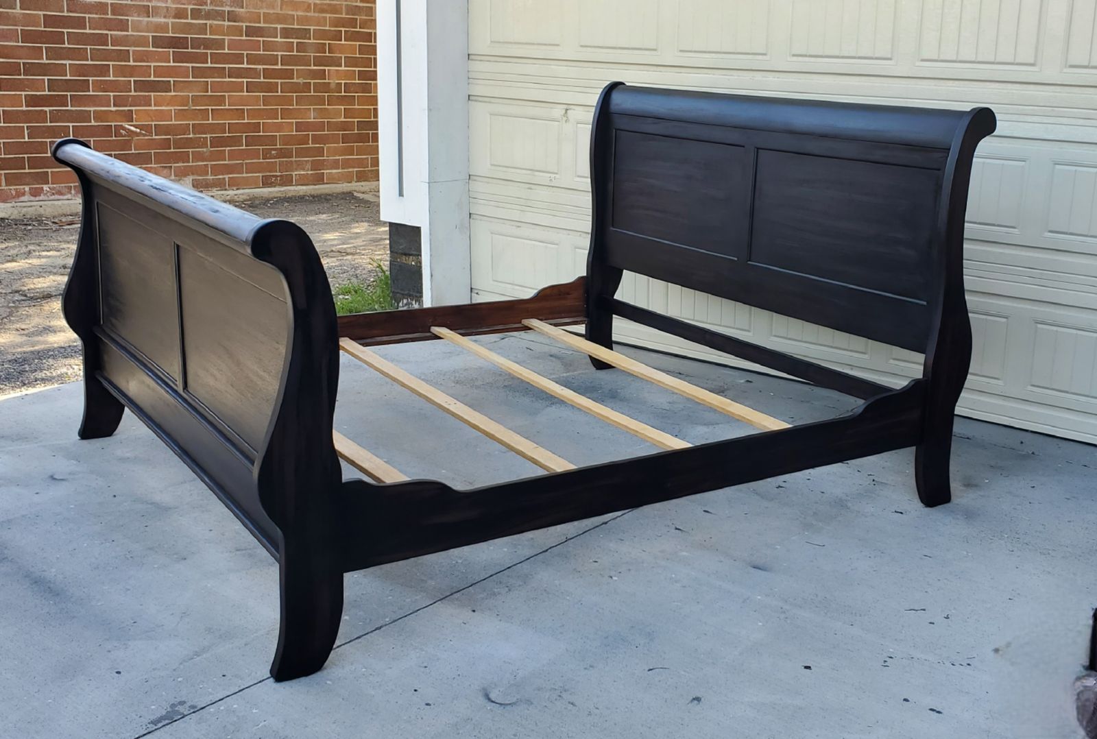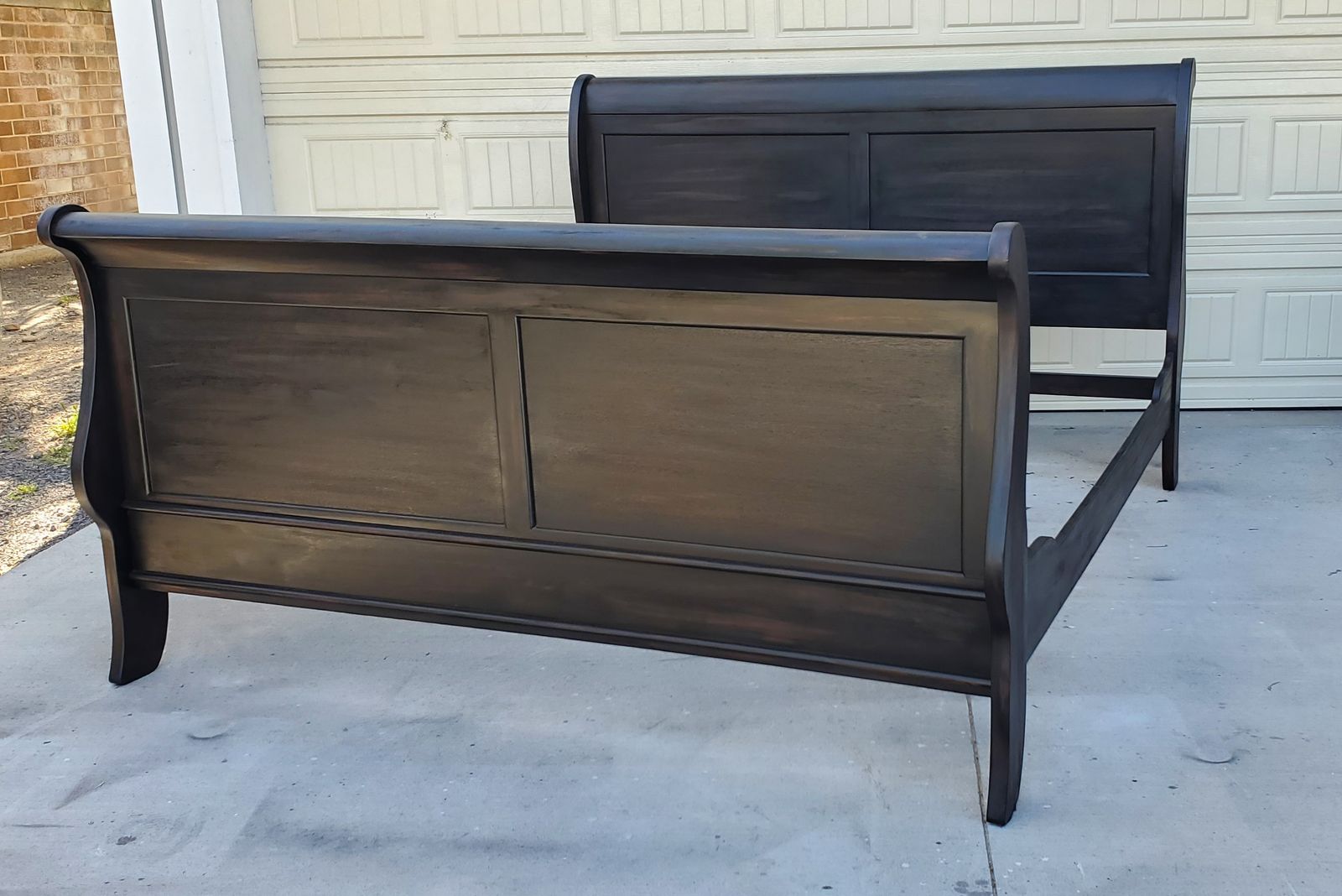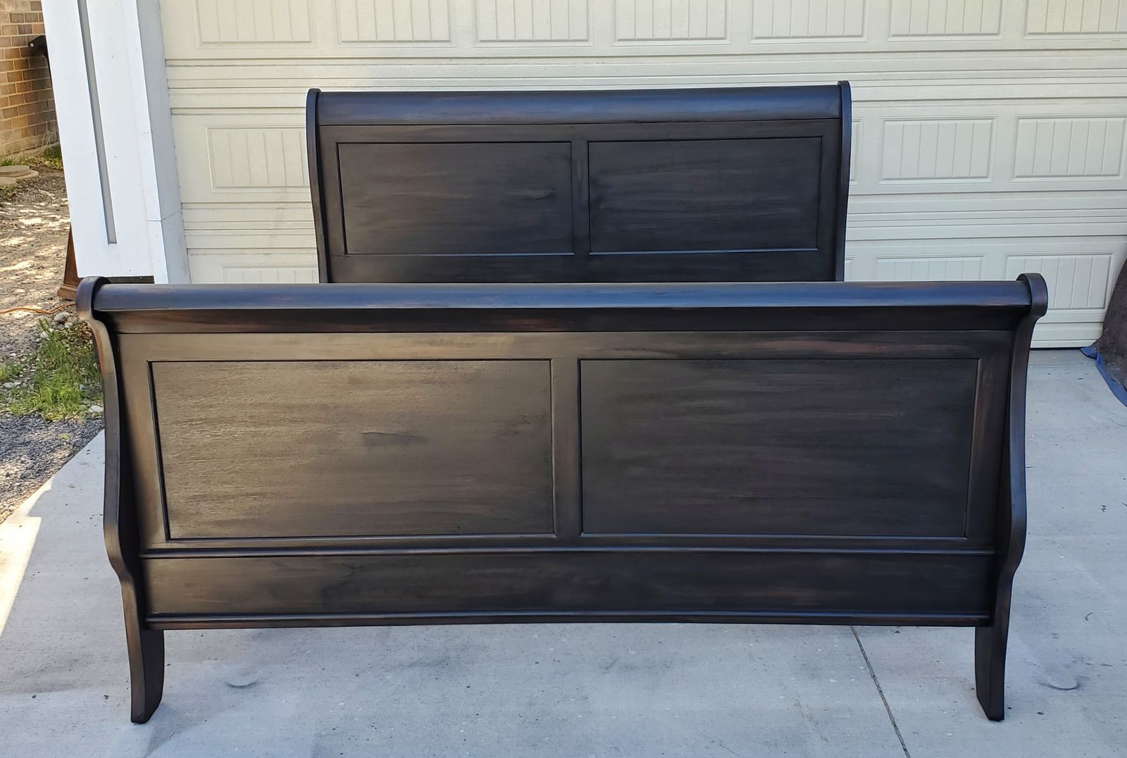 This STRIKING, magnificent, well-built, high-end, vintage wood STANDARD KING sleigh bed has recently been made better than new with an artistically hand painted, MATTE BLACK enamel paint technique that allows areas of the woodgrain/brown undertones to show beneath, which gives it a blackish-brownish hue in the right light that has a slightly distressed, rustic look. It can coordinate with whatever style that you are in the mood for decorating with this year! Change your mood? Switch it out! It's easy to set up, is STURDY, and includes 4 wood support slats.