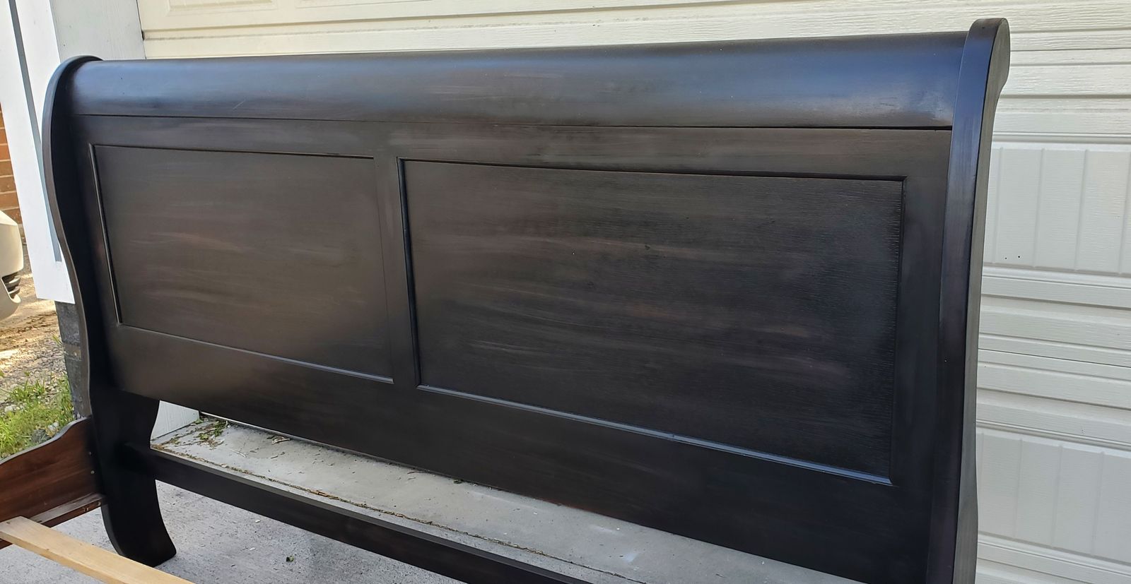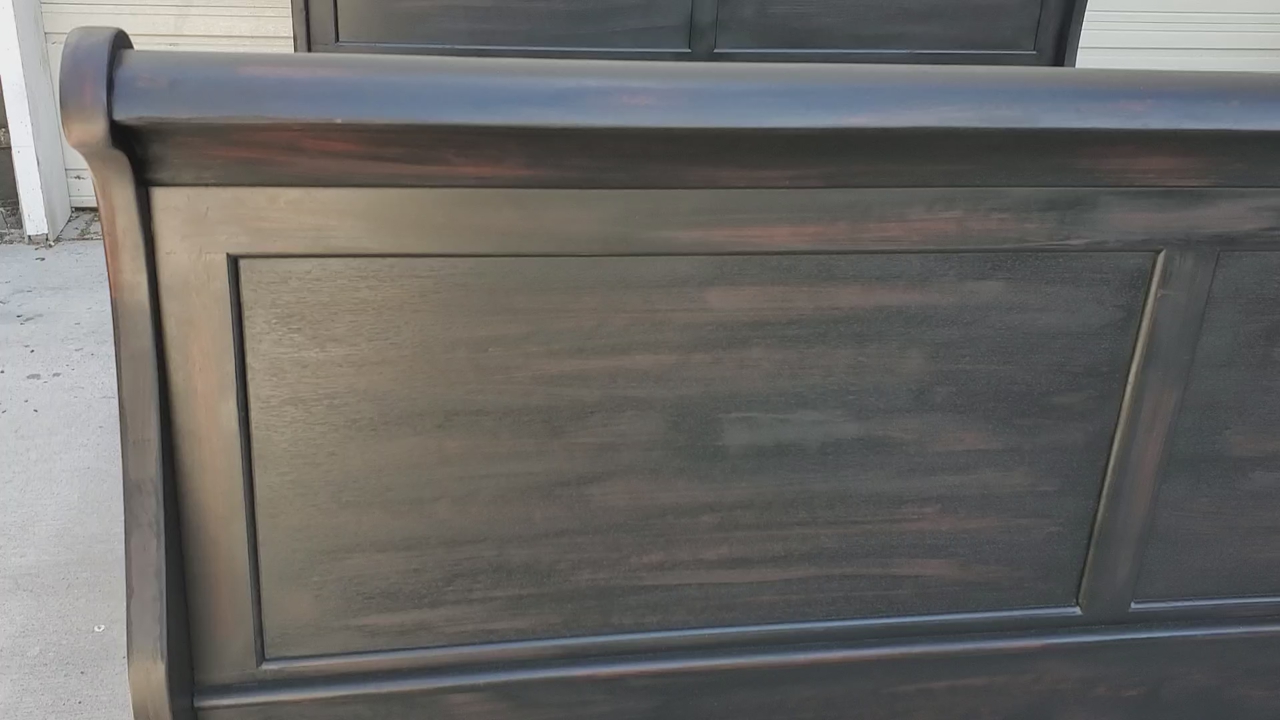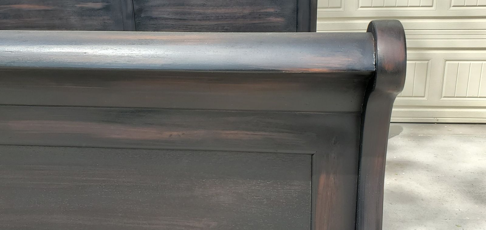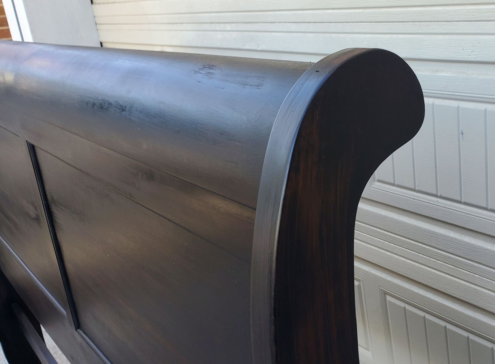 This STRIKING, magnificent, well-built, high-end, vintage wood STANDARD KING sleigh bed has recently been made better than new with an artistically hand painted, MATTE BLACK enamel paint technique that allows areas of the woodgrain/brown undertones to show beneath, which gives it a blackish-brownish hue in the right light that has a slightly distressed, rustic look. It can coordinate with whatever style that you are in the mood for decorating with this year! Change your mood? Switch it out! It's easy to set up, is STURDY, and includes 4 wood support slats.