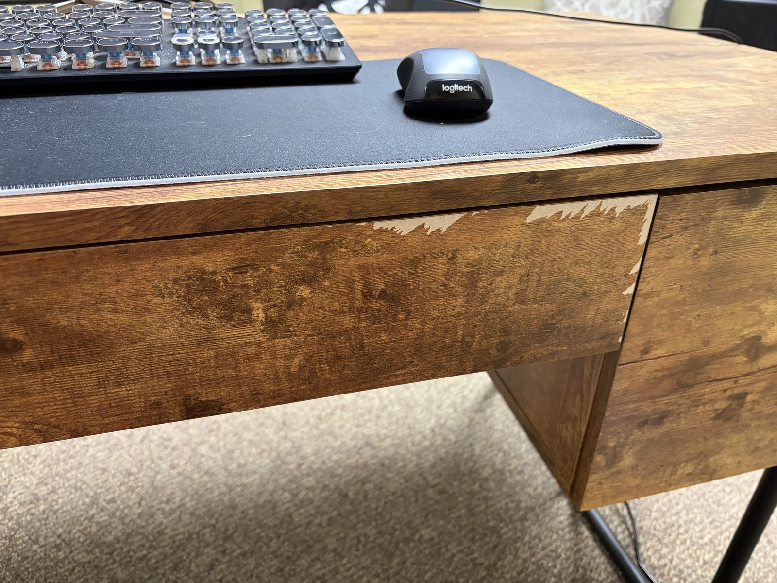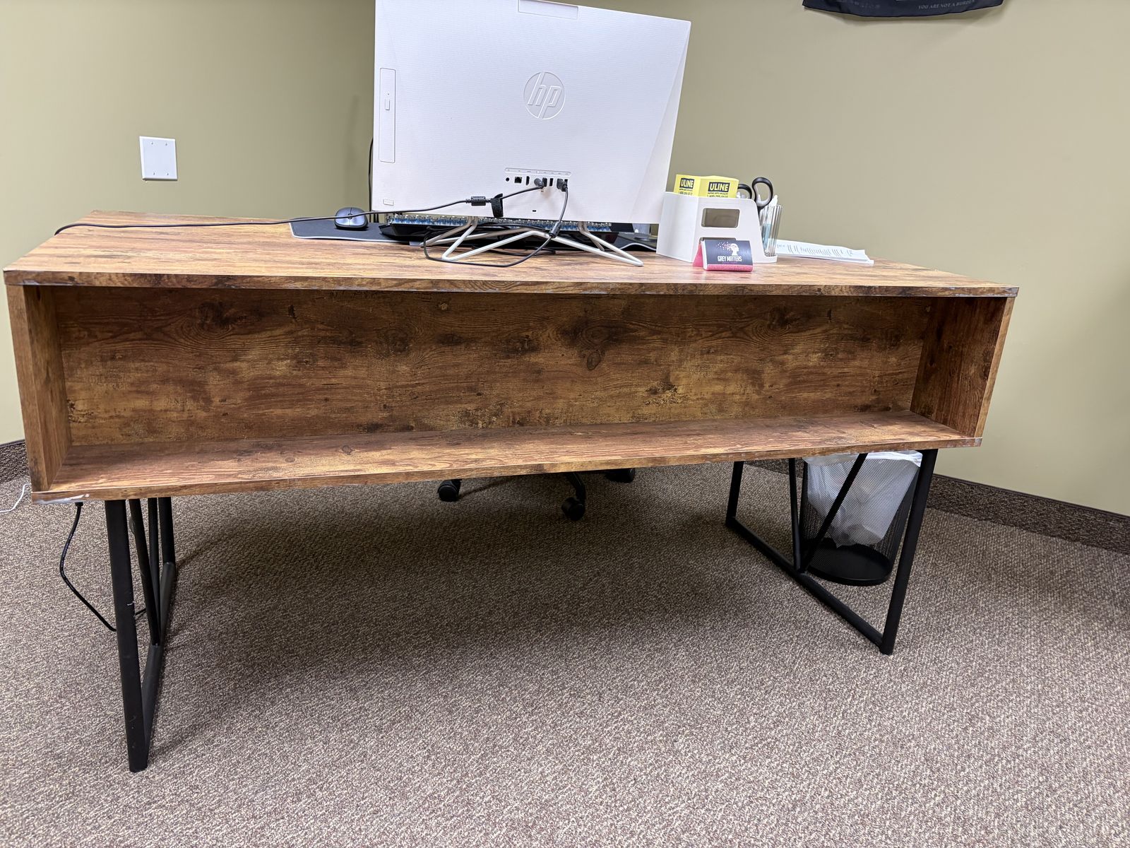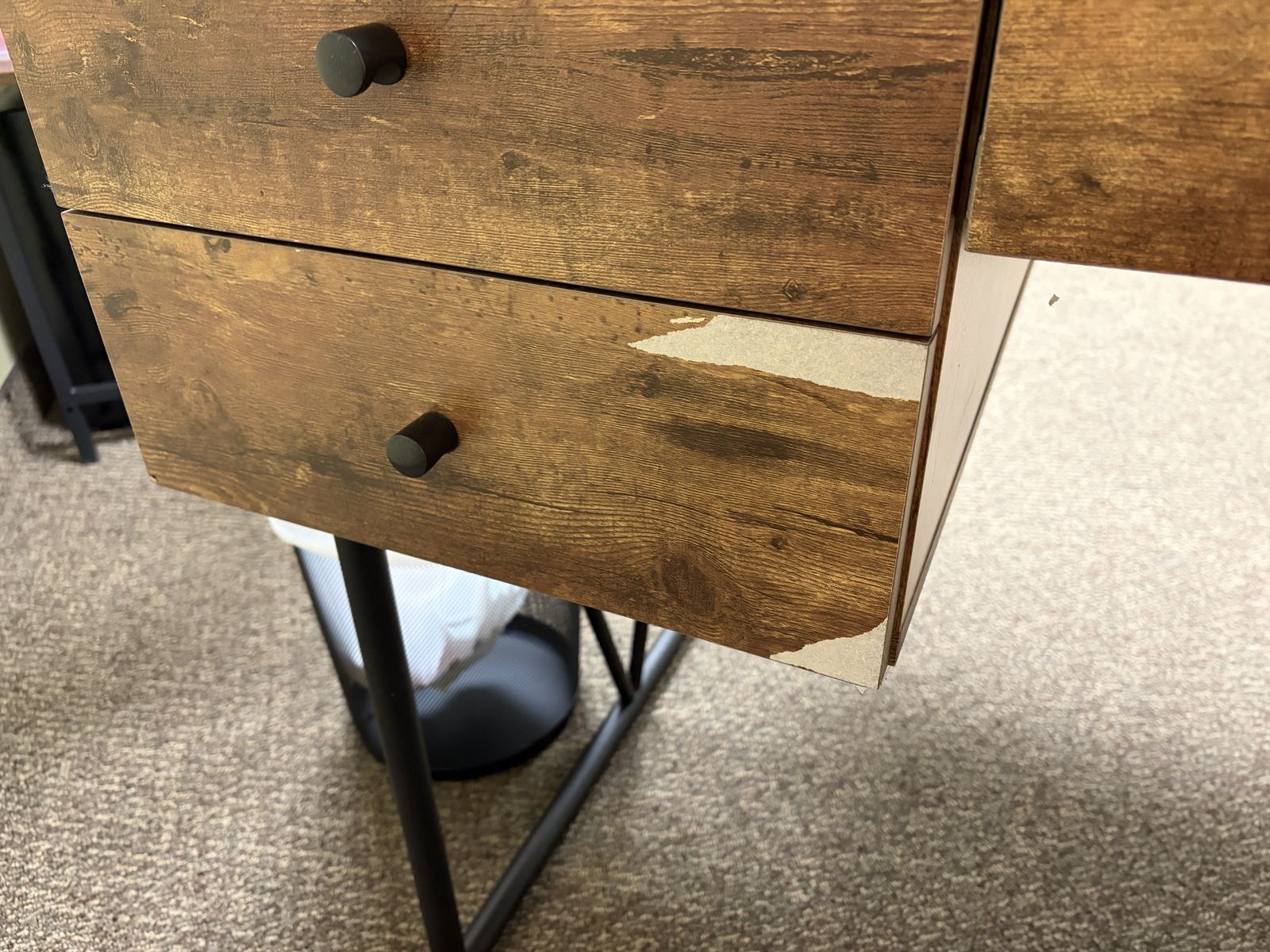 ApplePayBeautiful modern desk that has only really been used in a small therapist's waiting area. It has 3 drawers and a cool little shelf on the back side. It does have some damage on the front where some of the finish came off (the previous owner had taped the drawers down and the finish came off with the tape.), but it is not visible from the backside, only from sitting behind it.