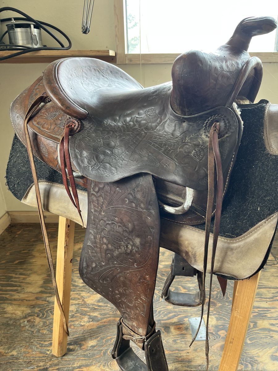 from well-known Austin TX maker. makers mark stamped on seat rise. entire saddle is tooled Tree size is 16 " and seat 14 1/2".